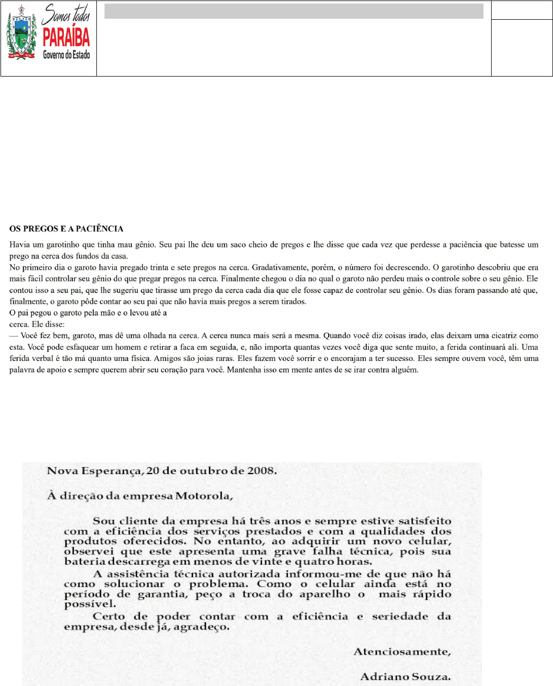 <p>ESCOLAESTADUAL E. F. M ISAURA FERNANDES DE SOUZA</p><p>Município: Itapororoca || Professor: Hugo Fernando da Silva Nascimento.</p><p>Turno:____________ Data:________________ Série:_______________________</p><p>Aluno(a):___________________________________________________________</p><p>Nota</p><p>1) Qual a função de uma carta de reclamação? Em que situações ela é usada?Com quais objetivos?</p><p>_______________________________________________________________________________________________________________________</p><p>_______________________________________________________________________________________________________________________</p><p>2) Quais as características de um conto popular?</p><p>_______________________________________________________________________________________________________________________</p><p>_______________________________________________________________________________________________________________________</p><p>3) Quais as características de uma parábola?</p><p>_______________________________________________________________________________________________________________________</p><p>_______________________________________________________________________________________________________________________</p><p>4) Leia o texto abaixo e responda ao que se pede</p><p>Gênero:_________________________________________________________________________________________________________________</p><p>Personagens: ____________________________________________________________________________________________________________</p><p>Espaço:_________________________________________________________________________________________________________________</p><p>Moral da história: _________________________________________________________________________________________________________</p><p>________________________________________________________________________________________________________________________</p><p>5) Leia o texto abaixo e responda ao que se pede</p><p>Local e Data:_____________________________________________________________________________________________________________</p><p>Destinatário: _____________________________________________________________________________________________________________</p><p>Descrição e relato do problema ______________________________________________________________________________________________</p><p>________________________________________________________________________________________________________________________</p><p>Pedido feito para resolver o problema:</p><p>________________________________________________________________________________________________________________________</p><p>________________________________________________________________________________________________________________________</p><p>Saudação final: ___________________________________________________________________________________________________________</p><p>Remetente _________________________________________________________________________________________________________</p><p>6) Leia o texto abaixo e responda ao que se pede</p><p>Gênero:_________________________________________________________________________________________________________________</p><p>Personagens: ____________________________________________________________________________________________________________</p><p>Espaço:_________________________________________________________________________________________________________________</p><p>Tempo:_________________________________________________________________________________________________________________</p><p>Moral da história: _________________________________________________________________________________________________________</p><p>________________________________________________________________________________________________________________________</p>