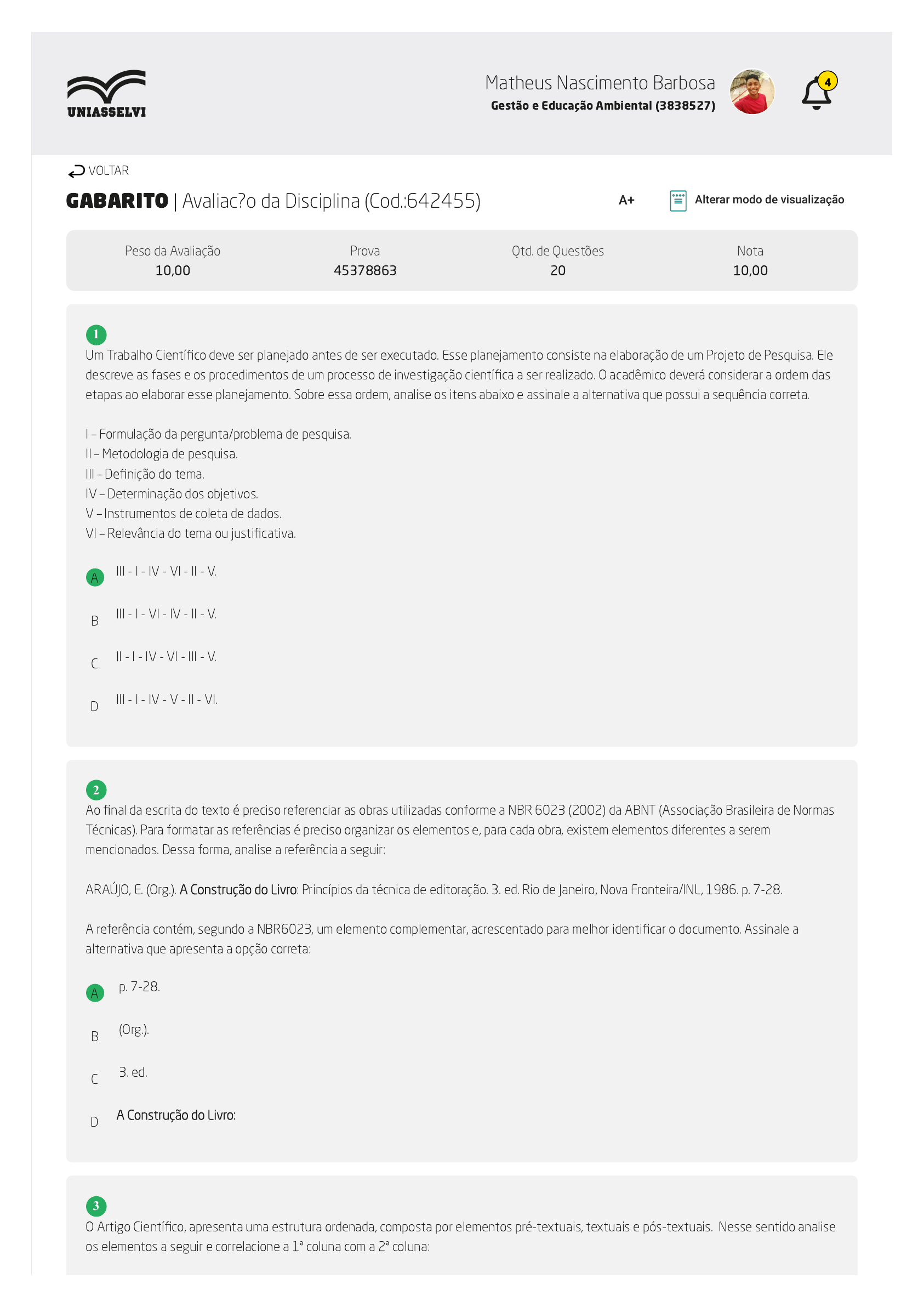 <p>16/04/2022 18:37 AVA</p><p>https://ava2.uniasselvi.com.br/subject/grades-and-tests/answer-book/eyJ0ZXN0Ijp7InRlc3RDb2RlIjoiNjQyNDU1IiwiZGVzY3JpcHRpb24iOiJBdmFsaWFjP28gZGEgRGlzY2lwbGluYSIsInBhcmFtZXRlciI6bnVsbCwiYm… 1/9</p><p>GABARITO | Avaliac?o da Disciplina (Cod.:642455)</p><p>Peso da Avaliação</p><p>10,00</p><p>Prova</p><p>45378863</p><p>Qtd. de Questões</p><p>20</p><p>Nota</p><p>10,00</p><p>Um Trabalho Científico deve ser planejado antes de ser executado. Esse planejamento consiste na elaboração de um Projeto de Pesquisa. Ele</p><p>descreve as fases e os procedimentos de um processo de investigação científica a ser realizado. O acadêmico deverá considerar a ordem das</p><p>etapas ao elaborar esse planejamento. Sobre essa ordem, analise os itens abaixo e assinale a alternativa que possui a sequência correta.</p><p>I – Formulação da pergunta/problema de pesquisa.</p><p>II – Metodologia de pesquisa.</p><p>III – Definição do tema.</p><p>IV – Determinação dos objetivos.</p><p>V – Instrumentos de coleta de dados.</p><p>VI – Relevância do tema ou justificativa.</p><p>A III - I - IV - VI - II - V.</p><p>B III - I - VI - IV - II - V.</p><p>C II - I - IV - VI - III - V.</p><p>D III - I - IV - V - II - VI.</p><p>Ao final da escrita do texto é preciso referenciar as obras utilizadas conforme a NBR 6023 (2002) da ABNT (Associação Brasileira de Normas</p><p>Técnicas). Para formatar as referências é preciso organizar os elementos e, para cada obra, existem elementos diferentes a serem</p><p>mencionados. Dessa forma, analise a referência a seguir:</p><p>ARAÚJO, E. (Org.). A Construção do Livro: Princípios da técnica de editoração. 3. ed. Rio de Janeiro, Nova Fronteira/INL, 1986. p. 7-28.</p><p>A referência contém, segundo a NBR6023, um elemento complementar, acrescentado para melhor identificar o documento. Assinale a</p><p>alternativa que apresenta a opção correta:</p><p>A p. 7-28.</p><p>B (Org.).</p><p>C 3. ed.</p><p>D A Construção do Livro:</p><p>O Artigo Científico, apresenta uma estrutura ordenada, composta por elementos pré-textuais, textuais e pós-textuais. Nesse sentido analise</p><p>os elementos a seguir e correlacione a 1ª coluna com a 2ª coluna:</p><p>VOLTAR</p><p>A+ Alterar modo de visualização</p><p>1</p><p>2</p><p>3</p><p>Matheus Nascimento Barbosa</p><p>Gestão e Educação Ambiental (3838527) </p><p>4</p><p>16/04/2022 18:37 AVA</p><p>https://ava2.uniasselvi.com.br/subject/grades-and-tests/answer-book/eyJ0ZXN0Ijp7InRlc3RDb2RlIjoiNjQyNDU1IiwiZGVzY3JpcHRpb24iOiJBdmFsaWFjP28gZGEgRGlzY2lwbGluYSIsInBhcmFtZXRlciI6bnVsbCwiYm… 2/9</p><p>EP – Elemento Pré-textual</p><p>ET- Elemento Textual</p><p>EPT – Elemento Pós-textual</p><p>( ) Anexo</p><p>( ) Apêndice</p><p>( ) Referência</p><p>( ) Introdução</p><p>( ) Resumo</p><p>Com base na correlação obtida, assinale a alternativa que apresenta a sequência CORRETA:</p><p>A EPT – EPT – EPT – ET – EP.</p><p>B ET – ET – EPT – ET - EPT.</p><p>C EPT – EP – EPT – EPT - ET.</p><p>D EP – EPT – EPT – ET – ET.</p><p>“Referência Bibliográfica é o conjunto de elementos que permite a identificação, no todo ou em parte, de documentos impressos ou</p><p>registrados em diversos tipos de material.” (NBR-6023).</p><p>(ASSOCIAÇÃO BRASILEIRA DE NORMAS TÉCNICAS. NBR 6023: informação e documentação – referências – elaboração. Rio de Janeiro, 2002.)</p><p>Os elementos da referência devem ser apresentados em sequência padronizada e formatados conforme as normas da ABNT. Sobre os</p><p>elementos que compõe a referência bibliográfica associe as colunas abaixo:</p><p>I - Na referência bibliográfica de obras consultadas on-line, a informação do endereço eletrônico.</p><p>II – Na referência bibliográfica de título da livros.</p><p>III – Na referência bibliográfica de artigo de revista e jornal, sem autor definido.</p><p>IV – Na referência bibliográfica de livro em que o autor do capítulo não é o mesmo da obra.</p><p>( ) a primeira palavra do título deve estar em MAIÚSCULA.</p><p>( ) deve ser apresentada entre os sinais < >.</p><p>( ) o elemento complementar In:, é inserido.</p><p>( ) deve estar destacado em negrito.</p><p>Agora, assinale a alternativa que apresenta a sequência CORRETA:</p><p>A III – I – IV – II.</p><p>B II – I – IV – III.</p><p>C III – IV – I – II.</p><p>D I – II – IV – III.</p><p>Antes de iniciar a escrita de um texto científico você deverá consultar vários documentos (livros, revistas, artigos, etc.) e mencionar alguns</p><p>trechos das obras pesquisadas por meio da citação. Ao final da escrita do texto, é preciso referenciar as obras utilizadas conforme a NBR</p><p>6023 (2002) da ABNT (Associação Brasileira de Normas Técnicas). Para seguir a formatação correta das referências de livros, é preciso</p><p>organizar os elementos.</p><p>Analise os itens abaixo:</p><p>4</p><p>5</p><p>Matheus Nascimento Barbosa</p><p>Gestão e Educação Ambiental (3838527) </p><p>4</p><p>16/04/2022 18:37 AVA</p><p>https://ava2.uniasselvi.com.br/subject/grades-and-tests/answer-book/eyJ0ZXN0Ijp7InRlc3RDb2RlIjoiNjQyNDU1IiwiZGVzY3JpcHRpb24iOiJBdmFsaWFjP28gZGEgRGlzY2lwbGluYSIsInBhcmFtZXRlciI6bnVsbCwiYm… 3/9</p><p>I – Título</p><p>II – Subtítulo (quando houver)</p><p>III – Autor</p><p>IV – Local da publicação</p><p>V – Editora</p><p>VI – Data</p><p>VII – Edição</p><p>Agora, assinale a alternativa que possui a sequência CORRETA</p><p>A III – I – II – IV – VII – VI – V.</p><p>B III – I – II – VII – IV – V – VI.</p><p>C I – II – III – VII – IV – V – VI.</p><p>D I – II – III – IV – VII – VI - V.</p><p>De acordo com o que você estudou na disciplina Metodologia do Trabalho Científico, analise o conceito a seguir:</p><p>É a parte do artigo onde é apresentado de forma concisa o assunto a ser tratado e também síntese das consider