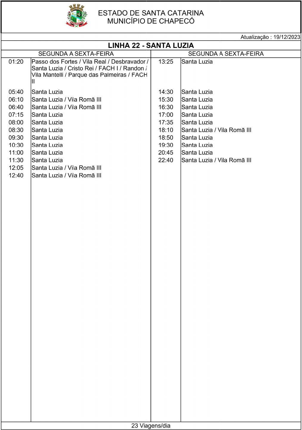 <p>ESTADO DE SANTA CATARINA MUNICÍPIO DE CHAPECÓ Atualização : 19/12/2023 LINHA 22 - SANTA LUZIA SEGUNDA A SEXTA-FEIRA SEGUNDA A SEXTA-FEIRA 01:20 Passo dos Fortes / Vila Real / Desbravador / 13:25 Santa Luzia Santa Luzia / Cristo Rei / FACH / Randon / Vila Mantelli / Parque das Palmeiras / FACH 05:40 Santa Luzia 14:30 Santa Luzia 06:10 Santa Luzia / Vila III 15:30 Santa Luzia 06:40 Santa Luzia / Vila III 16:30 Santa Luzia 07:15 Santa Luzia 17:00 Santa Luzia 08:00 Santa Luzia 17:35 Santa Luzia 08:30 Santa Luzia 18:10 Santa Luzia / Vila Romã III 09:30 Santa Luzia 18:50 Santa Luzia 10:30 Santa Luzia 19:30 Santa Luzia 11:00 Santa Luzia 20:45 Santa Luzia 11:30 Santa Luzia 22:40 Santa Luzia / Vila III 12:05 Santa Luzia / Vila Romã III 12:40 Santa Luzia / Vila Romã III 23 Viagens/dia</p><p>ESTADO DE SANTA CATARINA MUNICÍPIO DE CHAPECÓ Atualização : 19/12/2023 LINHA 22 - SANTA LUZIA SÁBADO DOMINGO / FERIADO 01:20 Passo dos Fortes / Vila Real / Desbravador / 10:00 Santa Luzia Santa Luzia / Cristo Rei / FACH / Randon / Vila Mantelli / Parque das Palmeiras / FACH 06:35 Santa Luzia / Vila III 13:00 Santa Luzia 07:25 Santa Luzia 14:30 Santa Luzia 08:30 Santa Luzia 17:30 Santa Luzia 09:30 Santa Luzia 22:40 Santa Luzia 10:30 Santa Luzia 11:30 Santa Luzia 12:15 Santa Luzia / Vila III 13:10 Santa Luzia 15:00 Santa Luzia 17:10 Santa Luzia / Vila Romã III 19:30 Santa Luzia 22:40 Santa Luzia 12 Viagens/dia 05 Viagens/dia</p>