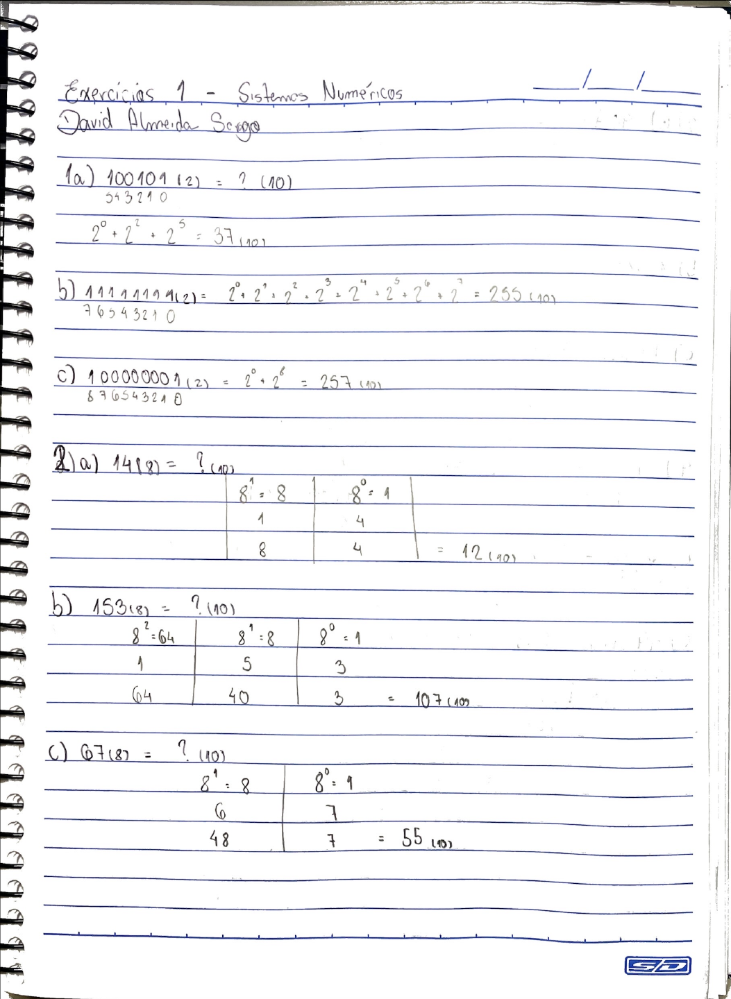 <p>- Sistemos Numericos / / David 1a) = ? (10) 543290 b) = 76543210 c) 100000001 (2) = = a) = 1 4 8 4 = b) = 1 5 3 64 40 3 = = 6 7 48 7 =</p><p>/ 3) a) 40A = 16 : 256 4 10 1024 10 = 1034 b) 100101 = = 1.048 833140) c) 16° 15 + 15 : 255 (10) 4 ) a) 99 (10) = 9912 1 49 2 24 2 b) 64 (10) = ?(2) 0 12 2 1000000121 6 2 0 3 2 = = 1 49312 10 1 246 2 O 123 2 1 69 2 1 30 2 15 2 1 7 2 1 3 1 2 1</p><p>/ 5) a) 107 (10) = => 153 (8) 5 9 8 1 0 185 271 185 1 23 8 7 2 8 2 0 c) 2048 = 4000 (8) 2048 256 8 32 8 0 4 8 4 0 = ? = 486 6 14 1 16 1 0 b) 2000 (10) = = (96)</p><p>/ / 2000 16 7D 125 16 13 7 16 7 0 5555 = 15B3 (16) 5555 16 3 347 16 11 29 16 5 1 16 1 0 7 ) a) 1001 1011 1000 1110 (2) = ? V 9 8 14 = E (96) 8) b) 0011 1119 1019 (2) = 3 15 11 = 3FB (16) 0001 0000 0001 0000 (2) 1 0 1 15 14 0 3 109FE03 (16)</p><p>/ (16) 10 1011 1001 1010 (2) b) 5D8F (16) = ? (2) 1111 (2) 1010 (2) 9)a) 1011 (2) = 001 019 13 (8) b) 1100 (2) 234 C) 6 (8) 19 1001 (2) = ? (16) b) 0011 1009 1100 (2) 9 39 1001 1009 0011 (2)</p><p>/ 11) a) 1205 (8) 1 2 010 000 101 285 (16) b) 1101 001 001 000 001 4 = 241 514(8) = ? (16) 000101 00.1 100 1 4 42 = 14 C 2AF = ?181 0010 1010 1 2 $ 7 = 125718) b) = 000001 0010 0011 1000 1 7 = c) BECA 19 14 12 10 001099 1100 1010 1 2 = 137312 18)</p>