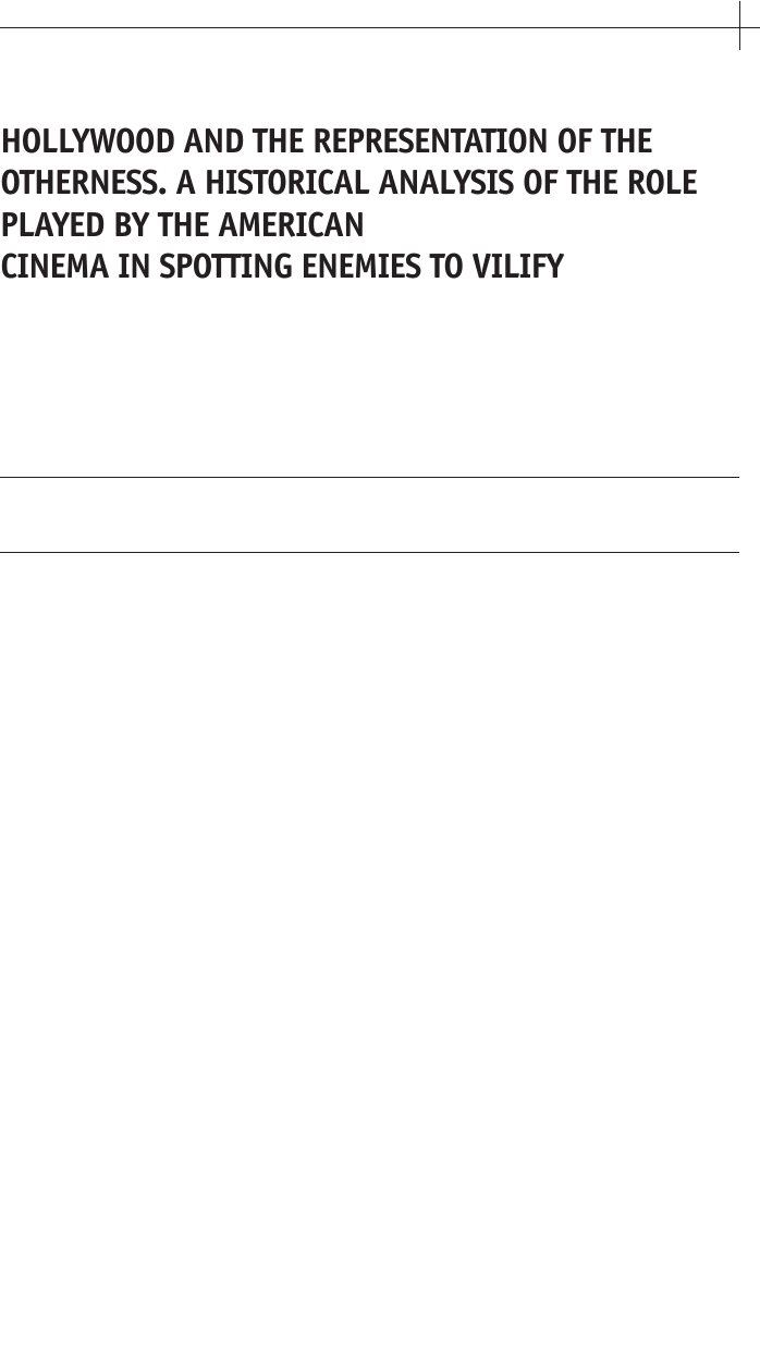 <p>11</p><p>HOLLYWOOD AND THE REPRESENTATION OF THE</p><p>OTHERNESS. A HISTORICAL ANALYSIS OF THE ROLE</p><p>PLAYED BY THE AMERICAN</p><p>CINEMA IN SPOTTING ENEMIES TO VILIFY</p><p>HOLLYWOOD Y LA REPRESENTACIÓN DE LA OTREDAD. ANÁLISIS</p><p>HISTÓRICO DEL PAPEL DESEMPEÑADO POR EL CINE ESTADOUNIDENSE EN</p><p>LA FORJA DE ENEMIGOS NACIONALES</p><p>ROBERTO GELADO MARCOS Y PEDRO SANGRO COLÓN</p><p>roberto.geladomarcos@ceu.es | psangroco@upsa.es</p><p>Universidad CEU San Pablo, Madrid</p><p>y Universidad Pontificia de Salamanca</p><p>Resumen: Hollywood ha desempeñado un papel decisivo en la configuración</p><p>de la corta historia del país bajo cuyo abrigo nació, los Estados Unidos de</p><p>América. En este artículo se examinan la representación de los pueblos no occi-</p><p>dentales en las películas hollywoodienses desde finales de la década de los años</p><p>sesenta hasta finales de la década de los años noventa; con el fin de detectar recu-</p><p>rrencias en los retratos de esos Otros, especialmente cuando se tiende a descri-</p><p>birlos en términos peyorativos. Esto demuestra que la tendencia era recurrente y</p><p>estaba bien asentada en Hollywood mucho antes incluso de los ataques del 11</p><p>de septiembre. El análisis de argumentos y personajes de las películas americanas</p><p>a través de las diferentes etapas históricas observadas ratifica no solo los conoci-</p><p>dos lazos entre Hollywood y la Casa Blanca, sino que revela una serie de patrones</p><p>recurrentes en la caracterización de esta Otredad y también una necesidad aún</p><p>más interesante de definir y reafirmar la propia identidad a través de la oposición</p><p>a un Otro cuya fisonomía cambia de manera pareja al momento político e his-</p><p>tórico que coincida con el lanzamiento de la película. Palabras clave:</p><p>Hollywood; cine; otredad; política; guerra de Vietnam; Guerra Fría.</p><p>Abstract: Hollywood has played a decisive role in shaping the recent and short</p><p>history of its founding country, the United States. This paper explores the repre-</p><p>sentation of peoples outside the Western standard in Hollywood movies from the</p><p>late 1960s to the late 1990s; ultimately aiming at spotting recurrences in the por-</p><p>trayal of Others, especially in vilifying terms, that were systematically settled in</p><p>Hollywood’s imagery much before 9/11. The analysis of plots and characters in</p><p>American movies not only reaffirms the well-known connection between</p><p>index l comunicación | nº 6 (1) | 2016 | Páginas 11-25 | ISSN: 2174-1859</p><p>Recibido: 2015_11_15 | Aceptado: 2016_02_06</p><p>Highlight</p><p>Highlight</p><p>Highlight</p><p>Hollywood and the White House, but also reveals consistent patterns in the</p><p>depiction of Otherness, and an even more interesting need to define and reaf-</p><p>firm the Self through the opposition to changing Others that mainly depend on</p><p>the historical and political period occurring. Keywords: Hollywood; Film</p><p>Language; Otherness; Politics; Vietnam War; Cold War.</p><p>Those who tell the stories</p><p>also rule the society</p><p>(Plato, Republic)</p><p>One of the most powerful tools through which Hollywood has built its</p><p>ability to depict peoples is precisely the natural way in which its films</p><p>glance at them. Certainly, when spectators watch a blockbuster, they</p><p>may be expecting thrills, love, interesting turns or, simply speaking, a story that is</p><p>appealing enough. It seems more difficult, though, that, blinded by the fascina-</p><p>ting features inherent to film language, both at technical and narrative levels, they</p><p>pay any attention to the accuracy with which all the social and cultural groups are</p><p>represented there; unless, obviously, they feel directly identified to one of them1.</p><p>This is precisely what makes Hollywood so powerful, not only when it</p><p>comes to represent American or ultimately Western society, but also those</p><p>Others who have been systematically represented throughout history in its</p><p>productions. “No institution”, as Richardson (2010: 1) points out, “has been</p><p>more successful at binding together economic and cultural dominance on a</p><p>world stage than Hollywood”. Bearing in mind that mass media are the main</p><p>source of knowing Others for average Westerners, the role of Hollywood depic-</p><p>tions of these ‘outsiders’ becomes essential, as most people do not have other</p><p>ways to access those cultures but by seeing their representation on the screen.</p><p>Prominent authors like Rosenstone (1998)2 and Ferro (1988) have discussed</p><p>how movies play a decisive role in the configuration of history, but before going</p><p>index.comunicación | nº 6 (1) |</p><p>12</p><p>[01] For instance, if a Spanish spectator watches how John Woo’s Mission Impossible 2 (1990) por-</p><p>traits Seville as a curious mix of flamenco (typical music of this Southern region of Spain) and</p><p>burning wooden figures which clearly evoke the celebration of the Fallas (exclusive from</p><p>Valencia, which is located 432 miles away from Seville), he will immediately feel something is</p><p>wrong there. But it is unlikely that the same spectator will accord the same level of close atten-</p><p>tion to the accuracy of the representation of other, though equally misrepresented, groups.</p><p>[02] “Times have changed –drastically”, writes Rosenstone (1998: 2) recalling the days when</p><p>films were not a valid source for most Historians. “Now major journals like the American</p><p>Historical Review and the Journal of American History devote sections to film (…) Now the</p><p>American Historical Association and the Organization of American Historians both give</p><p>awards for the best historical film of the year. Now panels on film and screenings mark</p><p>every major convention of historians”.</p><p>into further considerations about the ro