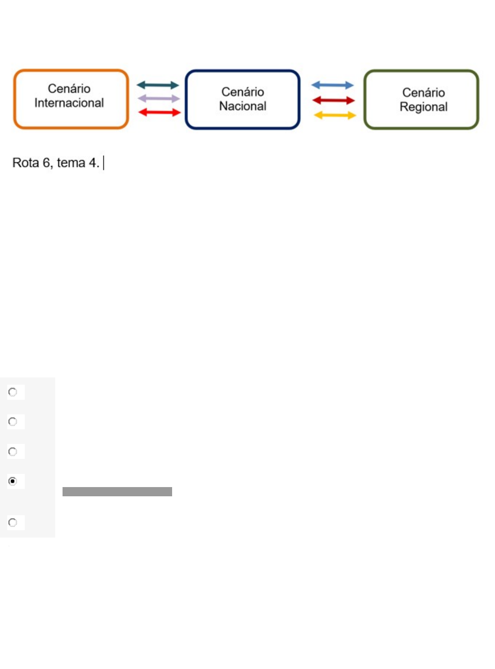 <p>Questão 1/10 - Análise de Cenários Econômicos</p><p>Sobre a representação das relações entre os ambientes internacional, nacional e regional analise o esquema a seguir:</p><p>Considerando o esquema, e o conteúdo visto na Rota 6, tema 4, sobre a relação entre diferentes ambientes, analise as afirmações a seguir:</p><p>I. Uma análise macroeconômica coerente pressupõe avaliar as condições regionais, sobretudo quando se trata de um plano de expansão das atividades de mercado.</p><p>II. Mesmo que se tenha acesso aos dados econômicos gerais do país, analisar as regiões para as quais se tem a potencialidade de expansão é condição determinante para o êxito das atividades.</p><p>III. Uma empresa/organização impacta e é impactada pelo meio no qual vive a todo momento, tanto em nível regional, como nacional e internacional.</p><p>IV. Os indicadores externos só afetam a realidade regional quando se trata de empresas exportadoras.</p><p>São corretas as afirmativas:</p><p>A</p><p>I e II apenas</p><p>B</p><p>I e III apenas.</p><p>C</p><p>II e III apenas</p><p>D</p><p>I, II e III apenas.</p><p>Você assinalou essa alternativa (D)</p><p>E</p><p>I, III e IV apenas.</p><p>Questão 2/10 - Análise de Cenários Econômicos</p><p>Os anos "20" começaram e as expectativas para o ecossistema de inovação são cada vez maiores. A tradicional lista de apostas do CB Insights reflete essa ambição em torno das startups. [...] Em 2020, as tendências ficarão em negócios que fazem jus ao termo futuro. São startups das áreas como criptografia quântica, edição genética e energia limpa.</p><p>Fonte: 36 startups que prometem mudar o mundo em 2020. Época Negócios. Reportagem publicada em 05 jan.2020. Disponível em: https://epocanegocios.globo.com/Empresa/noticia/2020/01/36-startups-que-prometem-mudar-o-mundo-em-2020.html</p><p>A reportagem acima faz menção ao conteúdo visto na Rota 6, tema 1. Sobre as startups, assinale V para as afirmativas VERDADEIRAS e F para as afirmativas FALSAS.</p><p>I. ( ) São empresas “jovens” que buscam inovação em qualquer área ou ramo de atividade.</p><p>II. ( ) Estão relacionadas a área tecnológica.</p><p>III. ( ) Estão presentes somente nos países desenvolvidos</p><p>IV. ( ) Possuem uma gestão centralizada.</p><p>A</p><p>V, F, F, V</p><p>B</p><p>F, F, V, F</p><p>C</p><p>F, F, F, V</p><p>D</p><p>F, F, F, V</p><p>E</p><p>V, V, F, F</p><p>Você assinalou essa alternativa (E)</p><p>Questão 3/10 - Análise de Cenários Econômicos</p><p>O estado de São Paulo possui uma população de 46.289.333 pessoas, de acordo com estimativa apresentada pelo IBGE para o ano de 2020. O rendimento nominal mensal domiciliar per capita é de R$1.946,00, e, a proporção de pessoas de 16 anos ou mais em trabalho formal é de 72,4% da população total do estado. Já o PIB do estado, foi de R$2,38 trilhões no ano de 2019, sendo o resultado, 2,5% maior que o registrado no ano de 2018.</p><p>AGÊNCIA BRASIL. PIB do estado de São Paulo cresceu 2,5% em 2019. 2020. Disponível em: <https://agenciabrasil.ebc.com.br/economia/noticia/2020-03/pib-do-estado-de-sao-paulo-cresceu-25-em-2019#:~:text=O%20Produto%20Interno%20Bruto%20(PIB,superior%20ao%20registrado%20em%202018.> Acesso em: 13/12/2020.</p><p>Considerando as informações acima sobre o estado de São Paulo no ano de 2019, e o conteúdo visto na Rota 6, tema 4, assinale V para as afirmativas VERDADEIRAS e F para as afirmativas FALSAS.</p><p>I. ( ) A reportagem aborda um estado com alto índice populacional.</p><p>II. ( ) No referido período, o estado de São Paulo possuía um rendimento nominal mensal domiciliar per capita inferior à media nacional.</p><p>III. ( ) O estado de São Paulo apresentou um crescimento do PIB entre 2018 e 2019.</p><p>IV. ( ) O desemprego no estado de São Paulo é acentuado no referido período, visto que mais de 50% da população não estava registrada formalmente.</p><p>A</p><p>V, F, V, F</p><p>Você assinalou essa alternativa (A)</p><p>B</p><p>F, F, V, F</p><p>C</p><p>F, F, F, V</p><p>D</p><p>V, F, F, V</p><p>E</p><p>V, V, F, F</p><p>Questão 4/10 - Análise de Cenários Econômicos</p><p>O Sistema Monetário Internacional é responsável por viabilizar a fluidez das relações econômicas internacionais. Este é constituído por um conjunto de regras que governam as relações financeiras entre os países, formando o aparato institucional que mantém as relações entre as diversas economias.</p><p>Rota 4, tema 2.</p><p>Com base no fragmento acima, e no conteúdo visto na Rota 4, tema 2, sobre a Padrão Ouro, é possível afirmar que, esse pressupunha como regra básica:</p><p>I. Conversibilidade das moedas nacionais em ouro.</p><p>II.Liberdade para o movimento internacional do ouro.</p><p>III. Liquidez do sistema, assegurada pelo Fundo Monetário Internacional</p><p>IV. Reserva em ouro sob custódia do Banco Mundial.</p><p>São corretas as afirmativas:</p><p>A</p><p>I e II apenas</p><p>Você assinalou essa alternativa (A)</p><p>B</p><p>I e III apenas</p><p>C</p><p>II e III apenas</p><p>D</p><p>II e IV apenas.</p><p>E</p><p>III e IV apenas.</p><p>Questão 5/10 - Análise de Cenários Econômicos</p><p>Uma empresa de tecnologia voltada para o agronegócio tem produtos de informática e sistemas voltados para a otimização no uso de insumos, como fertilizantes, sementes, água e agrotóxicos. Seus sistemas são comercializados principalmente no sul e centro-oeste do Brasil. Para fazer o planejamento estratégico da empresa, a diretoria da empresa propõe fazer uma análise de ambiente econômico, considerando como premissa que, para os próximos anos, a empresa não pretende explorar o mercado externo para se concentrar no atendimento do mercado da região sudeste do país.</p><p>Considerando os objetivos da empresa, avalie as afirmações a seguir.</p><p>I - Considerando o objetivo de expansão da empresa, é fundamental uma análise regional que descreve a situaç