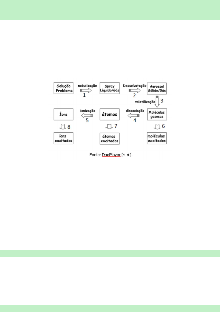<p>DETERMINAÇÃO DE FERRO EM LEITE EM PÓ POR</p><p>ESPECTROMETRIA DE ABSORÇÃO</p><p>Pré Teste</p><p>1. Na espectroscopia de absorção atômica, a substância que está sendo analisada é</p><p>decomposta em átomos por meio de uma chama, forno ou plasma. O esquema a</p><p>seguir representa, simplificadamente, as etapas que ocorrem no processo de</p><p>atomização na espectrometria atômica em chama com introdução por nebulização</p><p>pneumática.</p><p>Considere o esquema e as seguintes afirmações:</p><p>1. I. A etapa 4 é a responsável por produzir os átomos gasosos no estado</p><p>fundamental.</p><p>2. II. Na absorção atômica, utiliza-se um modulador, após a lâmpada, para</p><p>eliminar os problemas que podem ser causados pela etapa 7.</p><p>3. III. Somente a etapa 5 diminui a população de átomos gasosos no estado</p><p>fundamental.</p><p>4. IV. A etapa 7 é indesejável para a absorção atômica, por diminuir a população</p><p>de átomos gasosos no estado fundamental.</p><p>5.</p><p>Em relação a essas afirmações, estão CORRETAS:</p><p>A. apenas I, II e IV.</p><p>2. Considerada como uma técnica analítica bem-sucedida, a espectrometria de</p><p>absorção atômica é uma das mais utilizadas na determinação de elementos em baixas</p><p>concentrações em uma variedade de amostras, sejam líquidas, sólidas, em</p><p>suspensão e, até mesmo, gasosas. Os equipamentos de absorção atômica utilizam,</p><p>como fonte de luz, a fonte de cátodo oco, que emite luz:</p><p>C. com o espectro de um determinado metal.</p><p>3. A espectroscopia exerceu papel fundamental no desenvolvimento da teoria</p><p>atômica moderna. Além disso, os métodos espectroquímicos têm sido provavelmente</p><p>as ferramentas mais amplamente empregadas para a elucidação de estruturas</p><p>moleculares, bem como na determinação qualitativa e quantitativa de compostos</p><p>orgânicos e inorgânicos.</p><p>Sobre a espectroscopia de absorção atômica, são apresentadas as seguintes</p><p>afirmações:</p><p>I. O princípio fundamental da espectrometria de absorção atômica envolve a medida</p><p>da absorção da intensidade da radiação eletromagnética, proveniente de uma fonte</p><p>de radiação primária, por átomos gasosos no estado fundamental.</p><p>II. Os átomos excitados no atomizador retornam ao estado fundamental emitindo o</p><p>mesmo comprimento de onda que é emitido pela fonte de radiação, mas um artifício</p><p>eletrônico, denominado modulação, permite que o detector detecte, idealmente,</p><p>somente a radiação proveniente da fonte de radiação.</p><p>III. Os componentes básicos de um espectrômetro incluem: fonte de radiação,</p><p>sistema de atomização, conjunto monocromador, detector e processador.</p><p>Quais afirmações são verdadeiras?</p><p>B. As afirmações I, II e III são verdadeiras.</p><p>4. A espectroscopia é a ciência que estuda as interações da radiação com a matéria.</p><p>A espectrometria e os métodos espectrométricos são baseados na medida da</p><p>intensidade de radiação produzida ou absorvida pelas moléculas ou pelas espécies</p><p>atômicas de interesse, com o uso de aparelhagem específica.</p><p>A figura a seguir apresenta a configuração geral de um instrumento para a realização</p><p>de:</p><p>C. espectroscopia de absorção atômica.</p><p>5. Para se determinar a pureza do sal Na2HPO4, 2,469g de amostra foram pesados,</p><p>dissolvidos e diluídos em um balão volumétrico de 100mL. Então, realizou-se a</p><p>determinação de fósforo por espectrometria de absorção atômica por chama, em que</p><p>a solução resultante forneceu uma absorbância de 0,135. A curva de calibração</p><p>resultou na equação: y = 3.10–5x – 0,0119. Pode-se dizer que a pureza do sal é de:</p><p>Dados: MMsal = 142g/mol; MMP = 31,0g/mol.</p><p>A. 90,9%.</p><p>Pós Teste</p><p>1. A espectrometria de absorção atômica (FAAS) é hoje uma técnica largamente</p><p>difundida e empregada para a determinação de elementos-traço nas mais diversas</p><p>amostras presentes no cotidiano. Considere as seguintes afirmações com respeito a</p><p>essa técnica:</p><p>I. Na absorção atômica, em chama, o analito deverá ser levado ao estado atômico</p><p>gasoso. Após a atomização, o analito é levado ao estado excitado, por absorção tanto</p><p>da energia térmica da chama quanto da radiação de frequência característica</p><p>proveniente da lâmpada de cátodo oco.</p><p>II. Na absorção atômica, em chama, o analito deverá ser levado ao estado atômico</p><p>gasoso. Após a atomização, o analito é levado ao estado excitado somente por</p><p>absorção de energia térmica da chama, não sendo excitado pela radiação de</p><p>frequência característica proveniente da lâmpada de cátodo oco.</p><p>III. O agente liberador é a espécie introduzida para combinar-se com o componente da</p><p>amostra que iria apresentar interferência devido à formação de compostos de baixa</p><p>volatilidade (refratários) com o analito.</p><p>IV. O agente liberador é a espécie introduzida para combinar-se com o analito, a fim de</p><p>liberá-lo da interferência que sofreria devido à formação de compostos de baixa</p><p>volatilidade (refratários).</p><p>Quais afirmativas estão corretas?</p><p>B. I e III.</p><p>2. O espectrômetro de absorção atômica é um equipamento que permite a análise</p><p>quantitativa de elementos metálicos em soluções líquidas, gasosas e sólidas.</p><p>A chama, nesse equipamento, tem como principal função:</p><p>C. a atomização da amostra.</p><p>3. Os altos níveis de poluição ambiental vêm gerando preocupações em todo o</p><p>mundo. São muitos os procedimentos analíticos visando a prevenir e remediar</p><p>problemas ambientais decorrentes da poluição.</p><p>A técnica instrumental denominada espectroscopia de absorção atômica é mais</p><p>indicada para a determ