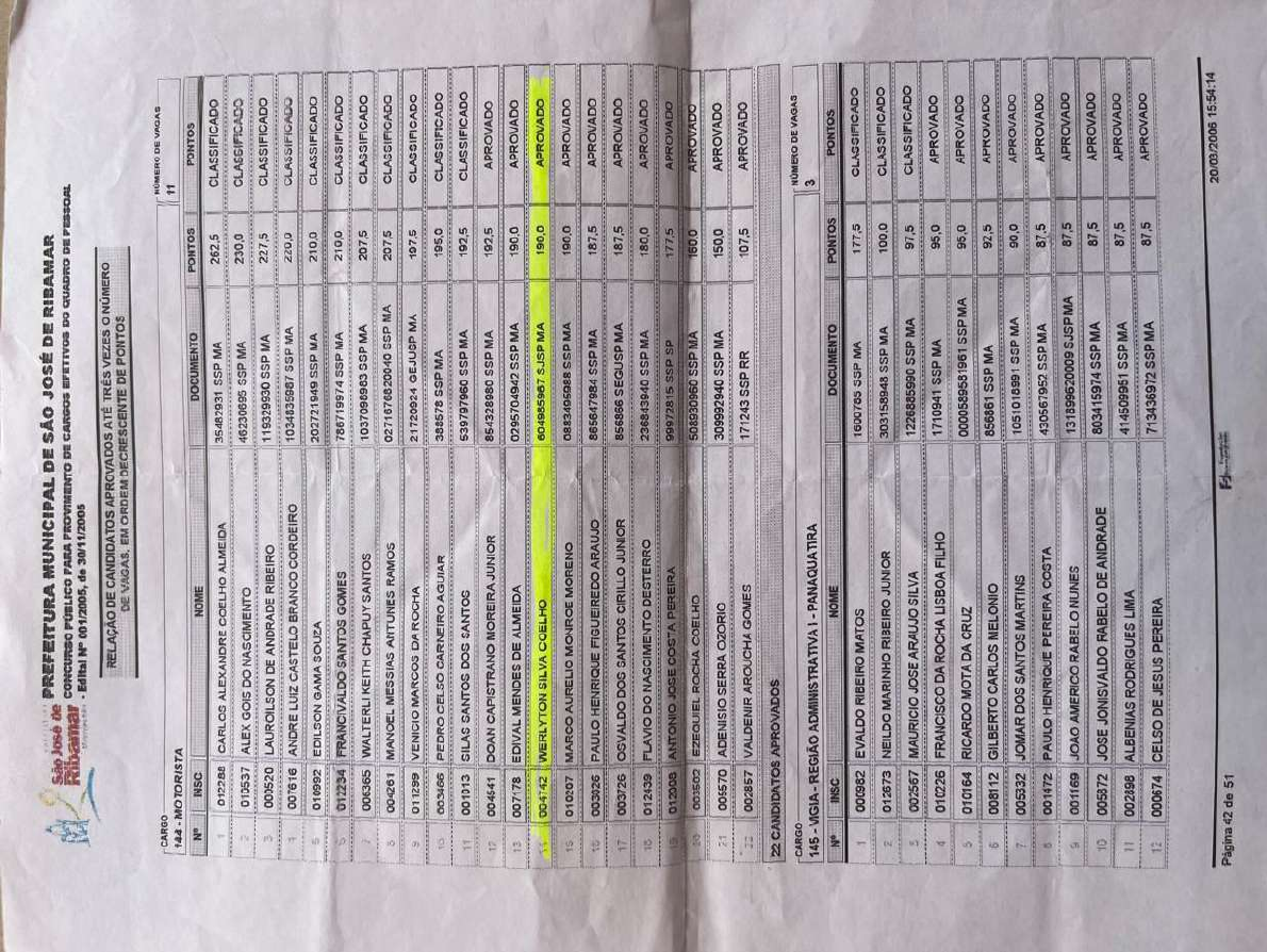 <p>São José de PREFEITURA MUNICIPAL DE SÃO JOSÉ DE RIBAMAR Ribamar CONCURSO PARA PROVIMENTO DE CARGOS EFETIVOS DO QUADRO DE PESSOAL Edital 001/2005, de 30/11/2005 RELAÇÃO DE CANDIDATOS APROVADOS ATÉ TRÉS VEZES o NÚMERO DE VAGAS, EM ORDEM DECRESCENTE DE PONTOS DE VAGAS CARGO 144 MO TORISTA 11 INSC DOCUMENTO PONTOS PONTOS NOME 1 012288 CARLOS ALEXANDRE COELHO ALMEIDA 35482931 SSP MA CLASSIFICADO 010537 ALEX GOIS DO NASCIMENTO 46230695 SSP MA 230,0 CLASSIFICADO 3 000520 LAUROILSON DE ANDRADE RIBEIRO 119329930 SSP MA 227,5 CLASSIFICADO 007616 ANDRE LUIZ CASTELO BRANCO CORDEIRO 1034835987 SSP MA CLASSIFICADO 5 010992 EDILSON GAMA SOUZA 202721949 SSP MA CLASSIFICADO 012234 FRANCIVALDO SANTOS GOMES 786719974 SSP MA 210,0 CLASSIFICADO 006365 WALTERLI KEITH CHAPUY SANTOS 1037098983 SSP MA 207,5 CLASSIFICADO 004261 MANOEL MESSIAS ANTUNES RAMOS 0271676820040 SSP MA 207,5 CLASSIFICADO 011299 VENICIO MARCOS DA ROCHA 21720924 GEJUSP MA 197,5 CLASSIFICADO TO 003466 PEDRO CELSO CARNEIRO AGUIAR 388578 SSP MA 195,0 CLASSIFICADO 11 001013 SILAS SANTOS DOS SANTOS 539797960 SSP MA 192,5 CLASSIFICADO 12 004541 DOAN CAPISTRANO MOREIRA JUNIOR 854328980 SSP MA 192,5 APROVADO 13 007178 EDIVAL MENDES DE ALMEIDA 0295704942 SSP MA 190,0 APROVADO 14 004742 WERLYTON SILVA COELHO 604985967 SJSP MA 190,0 APROVADO 15 010207 MARCO AURELIO MONROE MORENO 0883495988 SSP MA 190,0 APROVADO 003026 PAULO HENRIQUE FIGUEIREDO ARAUJO 865647984 SSP MA 187,5 APROVADO 17 003726 OSVALDO DOS SANTOS CIRILLO JUNIOR 856866 SEGUSP MA 187,5 APROVADO 18 012439 FLAVIO DO NASCIMENTO DESTERRO 236843940 SSP MA 180,0 APROVADO 19 012008 ANTONIO JOSE COSTA PEREIRA 99972815 SSP SP 177,5 APROVADO 20 003502 EZEQUIEL ROCHA COELHO 508930960 SSP MA APROVADO 21 005570 ADENISIO SERRA OZORIO 309992940 SSP MA 150,0 APROVADO 32 002857 VALDENIR AROUCHA GOMES 171243 SSP RR 107,5 APROVADO 22 CANDIDATOS APROVADOS CARGO DE VAGAS 145 VIGIA REGIÃO ADMINISTRATIVA PANAQUATIRA 3 INSC NOME DOCUMENTO PONTOS PONTOS 1 000982 EVALDO RIBEIRO MATOS 1600785 SSP MA 177,5 CLASSIFICADO 2 012673 NEILDO MARINHO RIBEIRO JUNIOR 303158948 SSP MA CLASSIFICADO 5 002567 MAURICIO JOSE ARAUJO SILVA 1226885990 SSP MA 97.5 CLASSIFICADO 4 010226 FRANCISCO DA ROCHA LISBOA FILHO 1710941 SSP MA APROVADO 5 010164 RICARDO MOTA DA CRUZ 0000589581961 SSP MA APROVADO 6 008112 GILBERTO CARLOS MELONIO 856861 SSP MA 92,5 APROVADO 7 005332 JOMAR DOS SANTOS MARTINS 1051018991 SSP MA 90,0 APROVADO 001472 PAULO HENRIQUE PEREIRA COSTA 430567952 SSP MA 87,5 APROVADO 001169 JOAO AMERICO RABELO NUNES 131899620009 SJSP MA 87,5 APROVADO 10 005872 JOSE JONISVALDO RABELO DE ANDRADE 803415974 SSP MA 87,5 APROVADO 11 002898 ALBENIAS RODRIGUES LIMA 414509951 SSP MA 87,5 APROVADO 12 000674 CELSO DE JESUS PEREIRA 713436972 SSP MA 87,5 APROVADO 20/03/2006 15:54:14 Página 42 de 51</p>