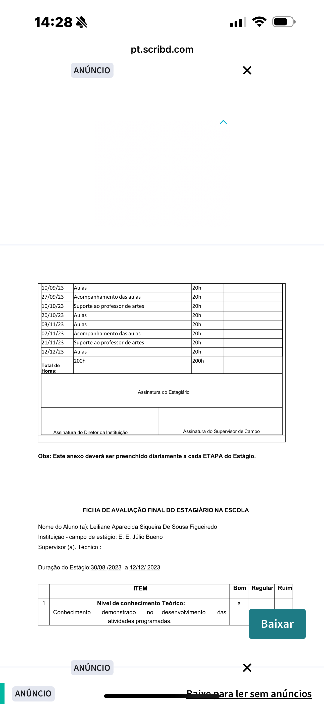 <p>14:28 pt.scribd.com ANÚNCIO X 10/09/23 Aulas 20h 27/09/23 Acompanhamento das aulas 20h 10/10/23 Suporte ao professor de artes 20h 20/10/23 Aulas 20h 03/11/23 Aulas 20h 07/11/23 Acompanhamento das aulas 20h 21/11/23 Suporte ao professor de artes 20h 12/12/23 Aulas 20h 200h 200h Total de Horas: Assinatura do Estagiário Assinatura do Diretor da Instituição Assinatura do Supervisor de Campo Obs: Este anexo deverá ser preenchido diariamente a cada ETAPA do Estágio. FICHA DE AVALIAÇÃO FINAL DO ESTAGIÁRIO NA ESCOLA Nome do Aluno (a): Leiliane Aparecida Siqueira De Sousa Figueiredo Instituição - campo de estágio: E. E. Júlio Bueno Supervisor (a). Técnico : Duração do Estágio: 30/08 /2023 a 12/12/ 2023 ITEM Bom Regular Ruim 1 Nível de conhecimento Teórico: X Conhecimento demonstrado no desenvolvimento das atividades programadas. Baixar ANÚNCIO X ANÚNCIO ler sem anúncios</p>