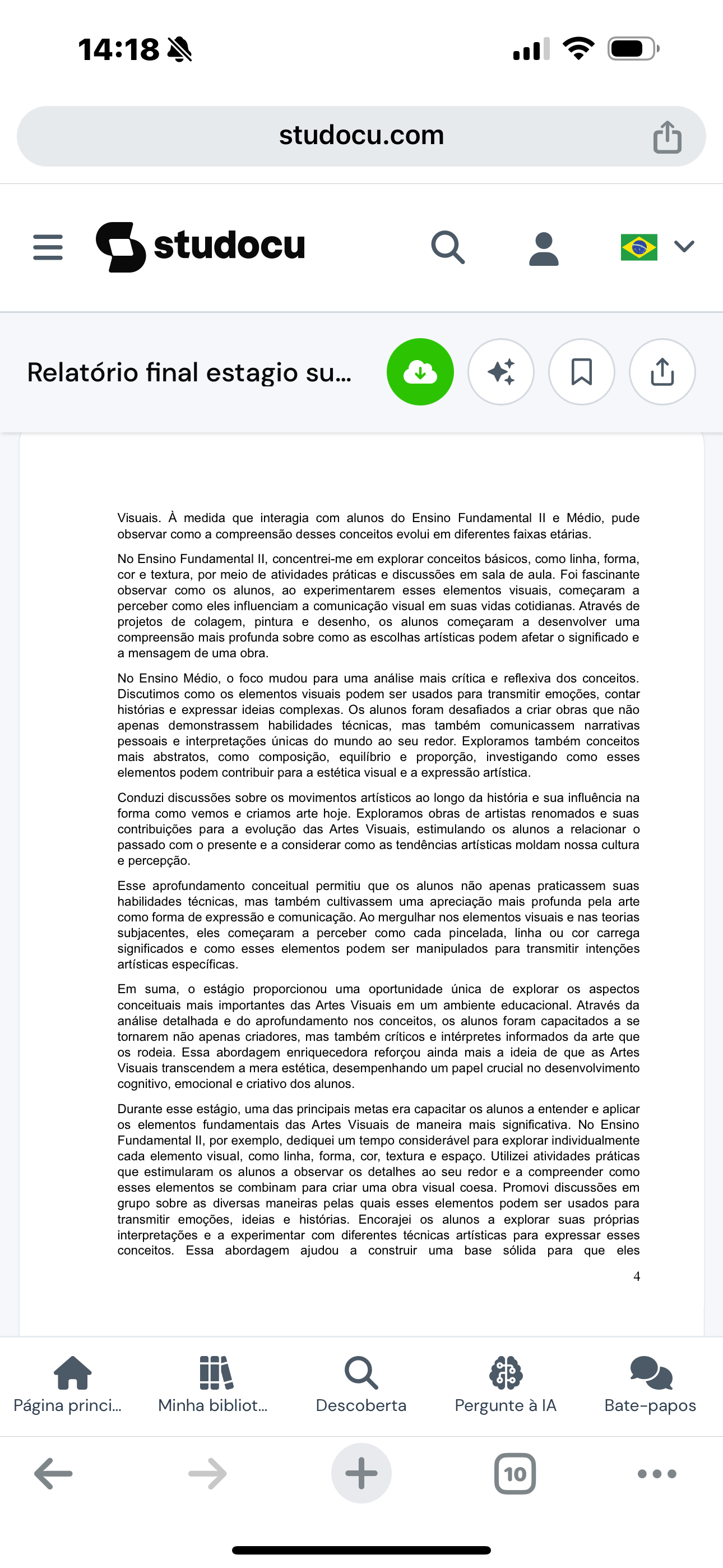 <p>14:18 studocu.com studocu Relatório final estagio su... Visuais. À medida que interagia com alunos do Ensino Fundamental e Médio, pude observar como a compreensão desses conceitos evolui em diferentes faixas No Ensino Fundamental II. concentrei-me em explorar conceitos básicos, como linha, forma, e textura, por meio de atividades práticas e discussões em sala de aula. Foi fascinante observar como os alunos. ao experimentarem esses elementos visuais, começaram a perceber como eles influenciam a comunicação visual em suas vidas cotidianas. Através de projetos de colagem, pintura e desenho, os alunos começaram a desenvolver uma compreensão mais profunda sobre como as escolhas artísticas podem afetar o significado e a mensagem de uma obra. No Ensino Médio, o foco mudou para uma análise mais crítica e reflexiva dos conceitos. Discutimos como os elementos visuais podem ser usados para transmitir emoções, contar histórias e expressar ideias complexas. Os alunos foram desafiados a criar obras que não apenas demonstrassem habilidades técnicas, mas também comunicassem narrativas pessoais e interpretações únicas do mundo ao seu redor. Exploramos também conceitos mais abstratos, como composição, equilíbrio e proporção, investigando como esses elementos podem contribuir para a estética visual e a expressão artística. Conduzi discussões sobre os movimentos artísticos ao longo da história e sua influência na forma como vemos e criamos arte hoje. Exploramos obras de artistas renomados e suas contribuições para a evolução das Artes Visuais, estimulando os alunos a relacionar o passado com o presente e a considerar como as tendências artísticas moldam nossa cultura e percepção. Esse aprofundamento conceitual permitiu que os alunos não apenas praticassem suas habilidades técnicas, mas também cultivassem uma apreciação mais profunda pela arte como forma de expressão e comunicação. Ao mergulhar nos elementos visuais e nas teorias subjacentes, eles começaram a perceber como cada pincelada, linha ou carrega significados e como esses elementos podem ser manipulados para transmitir intenções artísticas específicas. Em suma, o estágio proporcionou uma oportunidade única de explorar os aspectos conceituais mais importantes das Artes Visuais em um ambiente educacional. Através da análise detalhada e do aprofundamento nos conceitos, os alunos foram capacitados a se tornarem não apenas criadores, mas também críticos e intérpretes informados da arte que os Essa abordagem enriquecedora reforçou ainda mais a ideia de que as Artes Visuais transcendem a mera estética, desempenhando um papel crucial no desenvolvimento cognitivo, emocional e criativo dos alunos. Durante esse estágio, uma das principais metas era capacitar os alunos a entender e aplicar os elementos fundamentais das Artes Visuais de maneira mais significativa. No Ensino Fundamental II, por exemplo, dediquei um tempo considerável para explorar individualmente cada elemento visual, como linha, forma, cor, textura e espaço. Utilizei atividades práticas que estimularam os alunos a observar os detalhes ao seu redor e a compreender como esses elementos se combinam para criar uma obra visual coesa. Promovi discussões em grupo sobre as diversas maneiras pelas quais esses elementos podem ser usados para transmitir emoções, ideias e Encorajei os alunos a explorar suas próprias interpretações e a experimentar com diferentes técnicas artísticas para expressar esses conceitos. Essa abordagem ajudou a construir uma base sólida para que eles 4 Página princi... Minha bibliot... Descoberta Pergunte à IA Bate-papos + 10</p>