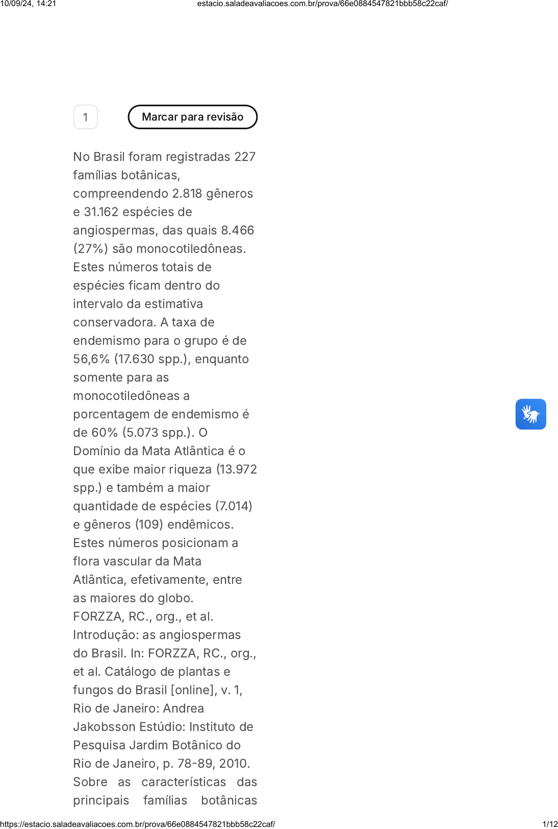 <p>1 Marcar para revisão</p><p>No Brasil foram registradas 227</p><p>famílias botânicas,</p><p>compreendendo 2.818 gêneros</p><p>e 31.162 espécies de</p><p>angiospermas, das quais 8.466</p><p>�27%) são monocotiledôneas.</p><p>Estes números totais de</p><p>espécies ficam dentro do</p><p>intervalo da estimativa</p><p>conservadora. A taxa de</p><p>endemismo para o grupo é de</p><p>56,6% �17.630 spp.), enquanto</p><p>somente para as</p><p>monocotiledôneas a</p><p>porcentagem de endemismo é</p><p>de 60% �5.073 spp.). O</p><p>Domínio da Mata Atlântica é o</p><p>que exibe maior riqueza �13.972</p><p>spp.) e também a maior</p><p>quantidade de espécies �7.014)</p><p>e gêneros �109) endêmicos.</p><p>Estes números posicionam a</p><p>flora vascular da Mata</p><p>Atlântica, efetivamente, entre</p><p>as maiores do globo.</p><p>FORZZA, RC., org., et al.</p><p>Introdução: as angiospermas</p><p>do Brasil. In: FORZZA, RC., org.,</p><p>et al. Catálogo de plantas e</p><p>fungos do Brasil [online], v. 1,</p><p>Rio de Janeiro: Andrea</p><p>Jakobsson Estúdio: Instituto de</p><p>Pesquisa Jardim Botânico do</p><p>Rio de Janeiro, p. 78�89, 2010.</p><p>Sobre as características das</p><p>principais famílias botânicas</p><p>10/09/24, 14:21 estacio.saladeavaliacoes.com.br/prova/66e0884547821bbb58c22caf/</p><p>https://estacio.saladeavaliacoes.com.br/prova/66e0884547821bbb58c22caf/ 1/12</p><p>que ocorrem no Brasil, analise</p><p>as afirmativas abaixo.</p><p>I � Na família Araceae os</p><p>gêneros encontrados no Brasil</p><p>são Anthurium e Philodendron.</p><p>Apresenta como característica</p><p>inflorescências em de espiga</p><p>carnosa envolta de uma</p><p>bráctea chamada espádice.</p><p>II � Arecaceae corresponde à</p><p>família das Palmeiras. Tem</p><p>grande importância econômica</p><p>tendo como representantes o</p><p>caso do coco �Cocos nucifera),</p><p>o açaí �Euterpe oleracea) e do</p><p>palmito-juçara �Euterpe edulis),</p><p>como ornamental, no caso da</p><p>palmeira-imperial �Roystonea</p><p>oleracea). Apresenta como</p><p>principal característica caules</p><p>do tipo troco.</p><p>III � Asteraceae é a maior</p><p>família das Angiospermas.</p><p>Apresenta como característica</p><p>flores agrupadas em racemos.</p><p>IV � Rubiaceae é a família do</p><p>café, possui grande</p><p>importância alimentícia e</p><p>grande potencial ornamental e</p><p>medicinal. As rubiáceas</p><p>possuem características as</p><p>estípulas interpeciolares.</p><p>Marque a alternativa que</p><p>apresenta as afirmativas</p><p>corretas.</p><p>10/09/24, 14:21 estacio.saladeavaliacoes.com.br/prova/66e0884547821bbb58c22caf/</p><p>https://estacio.saladeavaliacoes.com.br/prova/66e0884547821bbb58c22caf/ 2/12</p><p>A</p><p>B</p><p>C</p><p>D</p><p>E</p><p>A</p><p>B</p><p>C</p><p>As afirmativas I, II, III e</p><p>IV estão corretas.</p><p>Apenas as afirmativas</p><p>I, II e IV estão</p><p>corretas.</p><p>Apenas as afirmativas</p><p>I e IV estão corretas.</p><p>Apenas as afirmativas</p><p>II, III e IV estão</p><p>corretas.</p><p>Apenas as afirmativas</p><p>I e III estão corretas.</p><p>2 Marcar para revisão</p><p>O grupo atual de</p><p>Gimnospermas</p><p>morfologicamente (presença</p><p>de flores, elementos de vasos e</p><p>dupla fecundação) mais</p><p>relacionado às Angiospermas</p><p>são as:</p><p>Amborellales</p><p>Cycadales</p><p>Pinales</p><p>10/09/24, 14:21 estacio.saladeavaliacoes.com.br/prova/66e0884547821bbb58c22caf/</p><p>https://estacio.saladeavaliacoes.com.br/prova/66e0884547821bbb58c22caf/ 3/12</p><p>D</p><p>E</p><p>A</p><p>B</p><p>C</p><p>D</p><p>E</p><p>Gnetales</p><p>Ginkgogoales</p><p>3 Marcar para revisão</p><p>As estipes são caules</p><p>presentes nas:</p><p>Araceae</p><p>Iridaceae</p><p>Arecaceae</p><p>Dioscoreaceae</p><p>Velloziaceae</p><p>4 Marcar para revisão</p><p>A polinização cruzada ocorre</p><p>quando o pólen de um</p><p>indivíduo alcança o estigma de</p><p>outro indivíduo. Assinale a</p><p>ordem correta sobre a</p><p>fertilização:</p><p>00</p><p>hora</p><p>: 29</p><p>min</p><p>: 34</p><p>seg</p><p>Ocultar</p><p>Questão 6 de 10</p><p>Respondidas �1� Em branco �9�</p><p>Finalizar prova</p><p>1 2 3 4 5</p><p>6 7 8 9 10</p><p>SM2 Morfologia e Sistemática De Espermatófitas</p><p>10/09/24, 14:21 estacio.saladeavaliacoes.com.br/prova/66e0884547821bbb58c22caf/</p><p>https://estacio.saladeavaliacoes.com.br/prova/66e0884547821bbb58c22caf/ 4/12</p><p>A</p><p>B</p><p>C</p><p>Germinação/ as</p><p>células espermáticas</p><p>passam pela</p><p>micrópila/ fecundação</p><p>das duas células</p><p>espermáticas na</p><p>oosfera.</p><p>Formação do tubo</p><p>polínico/ fecundação</p><p>da oosfera e da célula</p><p>central binucleada/ as</p><p>células espermáticas</p><p>passam pela</p><p>micrópila.</p><p>Germinação/</p><p>formação do tubo</p><p>polínico/ as células</p><p>espermáticas passam</p><p>pela micrópila/</p><p>fecundação da</p><p>oosfera e da célula</p><p>central binucleada.</p><p>10/09/24, 14:21 estacio.saladeavaliacoes.com.br/prova/66e0884547821bbb58c22caf/</p><p>https://estacio.saladeavaliacoes.com.br/prova/66e0884547821bbb58c22caf/ 5/12</p><p>D</p><p>E</p><p>A</p><p>B</p><p>As células</p><p>espermáticas passam</p><p>pela micrópila/</p><p>germinação/</p><p>formação do tubo</p><p>polínico/ fecundação</p><p>das duas células</p><p>espermáticas na</p><p>oosfera.</p><p>As células</p><p>espermáticas passam</p><p>pela micrópila/</p><p>germinação/</p><p>formação do tubo</p><p>polínico/ fecundação</p><p>da oosfera e da célula</p><p>central binucleada.</p><p>5 Marcar para revisão</p><p>O projeto de paisagismo como</p><p>um todo, reúne diversas</p><p>etapas. É muito importante e</p><p>com ele se tem uma ideia geral</p><p>das possibilidades que podem</p><p>ser feitas dentro da área de</p><p>interesse. As principais etapas</p><p>do projeto são:</p><p>anteprojeto,</p><p>planej