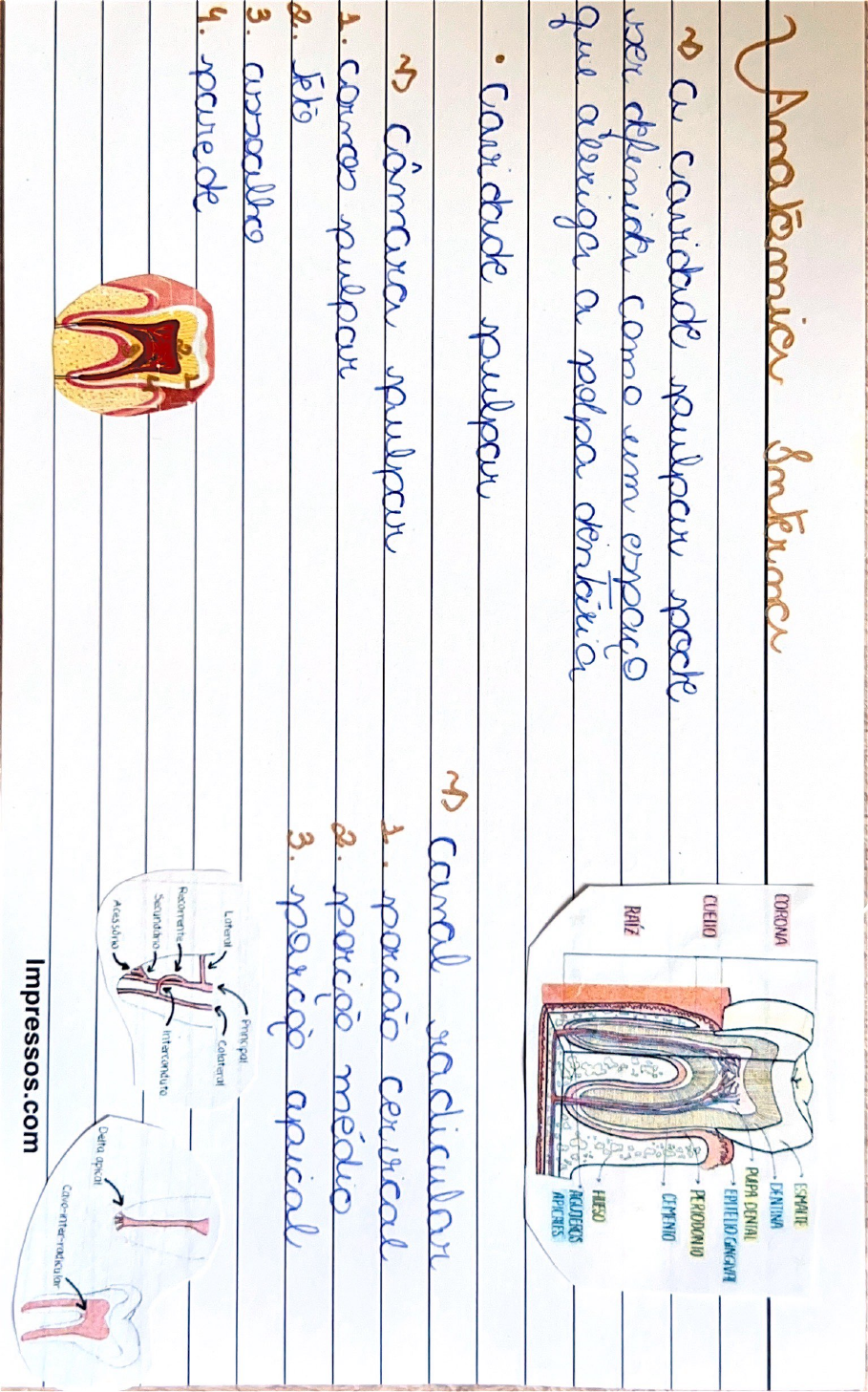 <p>ESMALTE Anatomia CORONA DENTINA DENTAL CUEDO a cavidade pulpar pode CEMENTO como um espaco RAÍZ HUESO que a polpa dentaria APICALES pulpar canal radicular pulpar 1. 1. pulpar 2. porcoo medio 2. 3. parcoo apical 3. Principal Lateral 4. parede Recorrente Delta Impressos.com</p><p>arame vertice Orificio que liga a superficie externa a do canal por passa as fileras e parcao a da 02 3mm da do dente 600860536</p>