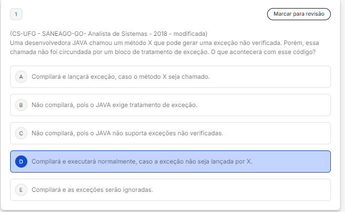 <p>1 Marcar para revisão (CS-UFG - SANEAGO-GO- Analista de Sistemas - 2018 - modificada) Uma desenvolvedora JAVA chamou um método X que pode gerar uma exceção não Porém, essa chamada não foi circundada por um bloco de tratamento de O que acontecerá com esse código? A Compilará e lançará caso O método X seja chamado B Não pois O JAVA exige tratamento de exceção. Não compilará, pois O JAVA não suporta exceções não verificadas. D Compilará e executará normalmente, caso a exceção não seja lançada por X. E Compilará e as exceções serão ignoradas.</p>