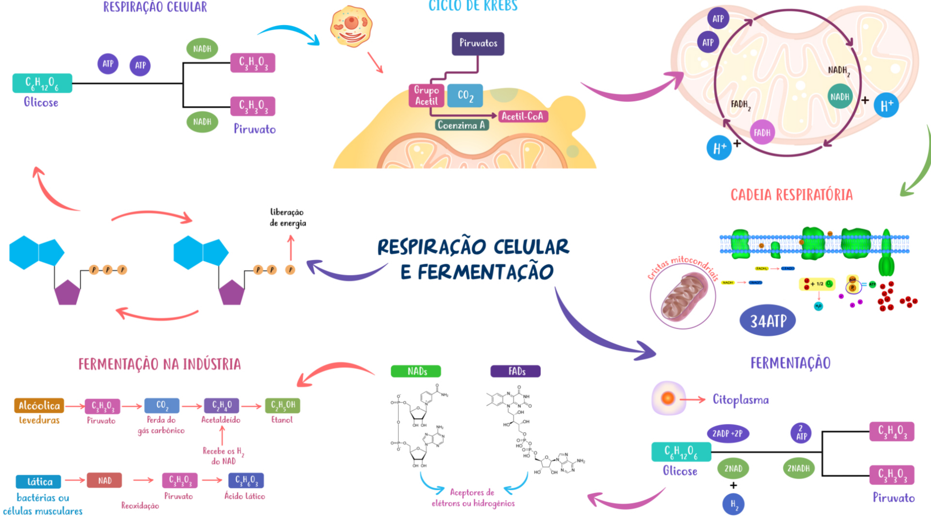 <p>RESPIRAÇÃO CELULAR CICLO DE KREBS ATP Piruvatos ATP NADH ATP ATP NADH 6 Grupo Acetil CO2 NADH Glicose FADH + 2 H+ Acetil-CoA NADH Piruvato Coenzima A FADH H+ CADEIA RESPIRATÓRIA liberação de energia RESPIRAÇÃO CELULAR E FERMENTAÇÃO 34ATP FERMENTAÇÃO NA FERMENTAÇÃO NADs FADs NH Alcóolica CO Citoplasma OH leveduras Piruvato Perda do Acetaldeido Etanol OH HO gás carbônico 2 2ADP+2P O=P HO Recebe os H2 HO 6 12 6 do NAD NH HO OH Glicose 2NAD 2NADH lática NAD + bactérias ou Piruvato Ácido lático Aceptores de Piruvato células musculares Reoxidação elétrons ou</p>