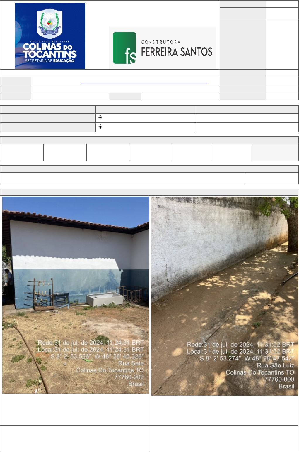 <p>Relatório n°</p><p>1</p><p>Data do relatório</p><p>02/08/2024</p><p>Dia da semana</p><p>Sexta-Feira</p><p>Relatório Mensal de Obra (RMO)</p><p>Contrato</p><p>Obra</p><p>REFORMA PARCIAL - ESCOLA MUNICIPAL PROFESSOR ODIMAR LOPES DA SILVA</p><p>Prazo contratual</p><p>Local</p><p>RUA PERIMETRAL, S/Nº SETOR DOIRADO. 77760-000 Colinas do Tocantins - TO.</p><p>Prazo decorrido</p><p>Contratante</p><p>SEC. MUN. EDUCAÇÃO</p><p>Responsável</p><p>MARCOS MOTA DO NASCIMENTO</p><p>Prazo a vencer</p><p>Condição climática</p><p>Tempo</p><p>Condição</p><p>Manhã X</p><p>Claro</p><p>Praticável</p><p>Tarde X</p><p>Claro</p><p>Praticável</p><p>Mão de obra (1)</p><p>DIRETOR DA EMPRESA</p><p>1</p><p>Gesseiro</p><p>0</p><p>Pedreiro</p><p>0</p><p>pintor</p><p>0</p><p>Mão de Obra Direta/DIRETOR</p><p>(1)</p><p>Atividades (1)</p><p>VISITA TÉCNICA COM FOTOS PARA APRESENTAÇÃO DE TODAS AS ESTRUTURAS DANIFICADAS QUE RECEBERÁ REFORMA/REPARO.</p><p>% - Em Andamento</p><p>Fotos (15)</p><p>ÁREA QUE SERÁ REALIZADO A CONSTRUÇÃO DE UMA SALA DE AULA DE PEQUENO PORTE 37M² - ESCOLA MUNICIPAL PROFESSOR ODIMAR LOPES DA SILVA.</p><p>ÁREA QUE SERÁ MODIFICADA PARA RECEBER COBERRTURA DA QUADRA DE ESPORTE, CORTE DE CALÇADA E NOVO REPARO DE CALÇADA NA ÁREA FOTOGRAFADA - ESCOLA MUNICIPAL PROFESSOR ODIMAR LOPES DA SILVA.</p><p>SUBSTITUIÇÃO DE POSTE DE ENERGIA, CORREÇÃO DE CABO, RECUPERAÇÃO DO ACABAMENTO DO MURO E RECUPERAÇÃO DA CALÇADA - ESCOLA MUNICIPAL PROFESSOR ODIMAR LOPES DA SILVA.</p><p>SUBSTITUIÇÃO DE POSTE DE ENERGIA - - ESCOLA MUNICIPAL PROFESSOR ODIMAR LOPES DA SILVA.</p><p>SUBSTITUIÇÃO PARCIAL DA CALÇADA AO REDOR DA QUADRA, CORTE NO SOLO PARA EMBUTIR TUBULAÇÃO DE DRENAGENS, PINTURA NAS MURETAS DA QUADRA - ESCOLA MUNICIPAL PROFESSOR ODIMAR LOPES DA SILVA.</p><p>SUBSTITUIÇÃO PARCIAL OU TOTAL DA TELA DE PROTEÇÃO,PINTURA EM GERAL DA QUADRA DE ESPORTE - ESCOLA MUNICIPAL PROFESSOR ODIMAR LOPES DA SILVA.</p><p>SUBSTITUIÇÃO DE TODA A TINTA EXISTENTE, PINTURA NOVA PRÓPRIA PARA ESPORTE - ESCOLA MUNICIPAL PROFESSOR ODIMAR LOPES DA SILVA.</p><p>SUBSTITUIÇÃO DE TODA A TINTA EXISTENTE, PINTURA NOVA PRÓPRIA PARA ESPORTE - ESCOLA MUNICIPAL PROFESSOR ODIMAR LOPES DA SILVA.</p><p>Relatório 02/08/2024 n° 1</p><p>2 / 4</p><p>SUBSTITUIÇÃO DE POSTE, PINTURA ENTRE OUTROS - ESCOLA MUNICIPAL PROFESSOR ODIMAR LOPES DA SILVA.</p><p>REGISTRO DE TODA ESTRUTURA DANIFICADA - ESCOLA MUNICIPAL PROFESSOR ODIMAR LOPES DA SILVA.</p><p>MURETA TOTALMENTE DANIFICADA - ESCOLA MUNICIPAL PROFESSOR ODIMAR LOPES DA SILVA.</p><p>LADO EXTERNO DA MURETA QUE SERÁ RECUPERADA.</p><p>JULIANO FERREIRA MORAES (CARIMBO)</p><p>ENGENHEIRO CIVIL - CREA TO Nº 242035214-9</p><p>FISCAL DE OBRAS DA SECRETARIA MUNCIPAL DA EDUCAÇÃO</p><p>COLINAS DO TOCANTINS - TO</p><p>image3.png</p><p>image4.png</p><p>image5.png</p><p>image6.png</p><p>image7.png</p><p>image8.png</p><p>image9.png</p><p>image10.png</p><p>image11.png</p><p>image12.png</p><p>image13.png</p><p>image14.png</p><p>image15.png</p><p>image1.png</p><p>image2.jpeg</p>