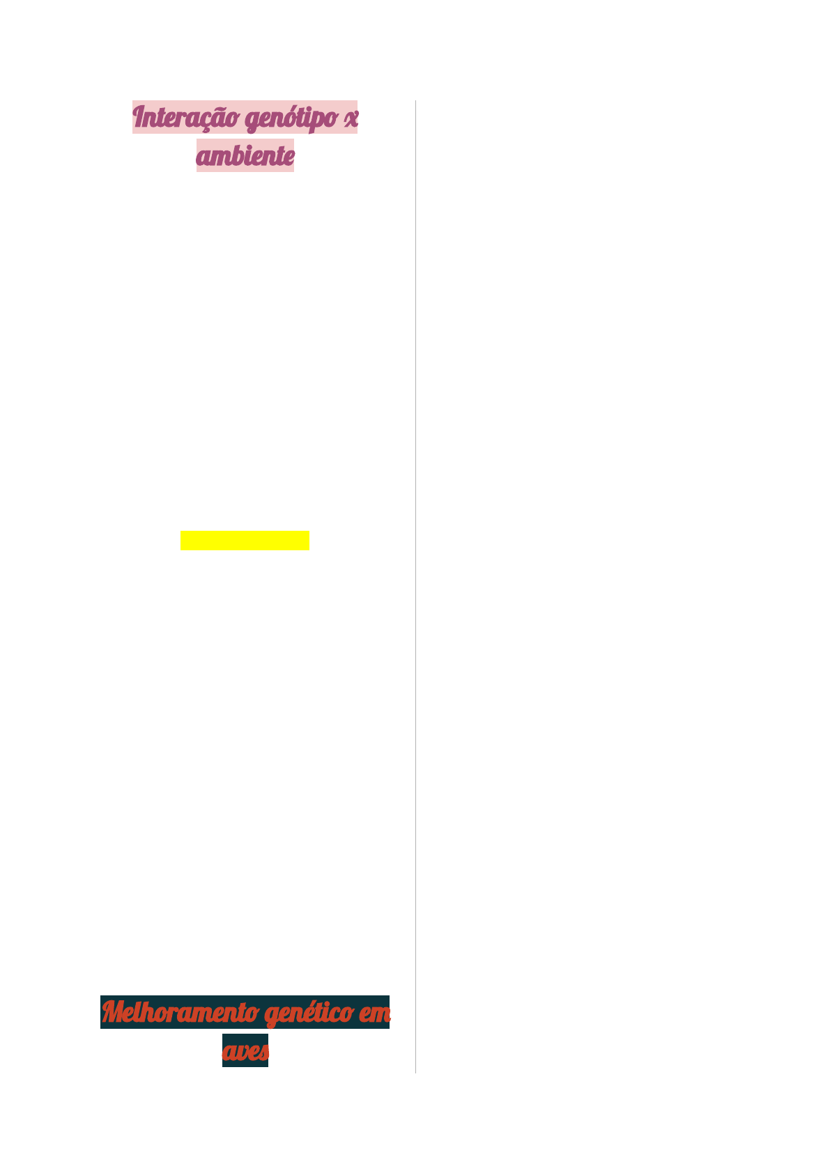 <p>Interaçã� genótip� �</p><p>ambient�</p><p>Devido às condições climáticas, manejo,</p><p>instalações e alimentação pode ocorrer</p><p>uma difusão de material genético.</p><p>Clima TROPICAL - os zebuínos são</p><p>favorecidos e os taurinos são prejudicados.</p><p>Clima TEMPERADO - os zebuínos são</p><p>prejudicados e os taurinos são favorecidos.</p><p>● Ocorre quando um genótipo resulta</p><p>em fenótipos diferente devido a</p><p>ambientes diferentes</p><p>● O POTENCIAL GENÉTICO</p><p>explica bastante a interação entre</p><p>GXE.</p><p>P = G + E + G x E</p><p>Fórmula para calcular o progresso genético</p><p>BRASIL</p><p>No Brasil existe uma grande variação</p><p>climática em suas regiões e isso exige</p><p>diferentes condições de manejo.</p><p>Os programas ainda descartam a interação</p><p>entre o ambiente e o genótipo e isso é um</p><p>grande desafio, visto que a identificação</p><p>dessa interação poderia auxiliar a seleção e</p><p>aumentar a eficiência desses animais.</p><p>HÁ DIFICULDADE EM</p><p>DETERMINAR UM GENÓTIPO</p><p>COMO SUPERIOR EM TODO</p><p>AMBIENTE.</p><p>Melhorament� genétic� e�</p><p>ave�</p><p>● Sexo heterogamético -</p><p>cromossomo sexual não são igual.</p><p>● A intenção do melhoramento nas</p><p>aves é o desempenho e não</p><p>relacionado a raças puras.</p><p>Como ocorre a seleção?</p><p>Características qualitativas:</p><p>Caracteristicas ligadas ao sexo:</p><p>● Plumagem Barrada</p><p>● Empenamento Tardio</p><p>● Nanismo</p><p>Utilidade da herança ligada ao sexo:</p><p>● Identificação do sexo ao</p><p>nascimento;</p><p>● Manejo diferenciados</p><p>● Aproveitar melhor o potencial</p><p>zootécnico para cada sexo.</p><p>MELHORAMENTO GENÉTICO DE</p><p>POEDEIRAS</p><p>OBJETIVOS:</p><p>● Aumentar a produção de ovos</p><p>● Reduzir custos com alimentação</p><p>● Reduzir perdas e melhorar a</p><p>qualidade do ovo.</p><p>PESO CORPORAL INFLUENCIA NO</p><p>PESO DOS OVOS</p><p>MELHORAMENTO GENÉTICO DE</p><p>FRANGO DE CORTE</p><p>OBJETIVOS:</p><p>● Aumentar o ganho de peso</p><p>corporal;</p><p>● Alta precocidade,</p><p>● Alta eficiência alimentar</p><p>● Alto rendimento de cortes nobres</p><p>● Melhor qualidade da carne</p><p>● Resistência a doenças</p><p>Os critérios de seleção:</p><p>Paterna: fertilidade, capacidade de</p><p>acasalamento, ganho de peso, rendimento</p><p>de carcaça e cortes, vigor, adaptação…</p><p>Materna: produção, tamanho, qualidade e</p><p>eclodidas de ovos, fertilidade, ganho de</p><p>peso, rendimento de carcaça…</p><p>MORTALIDADE ESTÁ MAIS LIGADA</p><p>A FATORES AMBIENTAL</p><p>PROIBIDO O USO DE SUBSTÂNCIAS</p><p>COM EFEITO TIREOSTÁTICOS -</p><p>LOGO É MITO ISSO DE HORMÔNIO</p><p>NOS FRANGOS.</p><p>Por que não vale a pena usar</p><p>hormonios?</p><p>● Ilegal</p><p>● Não efetivo (tempo de efeito)</p><p>● Adm é difícil</p><p>● Alto custo</p><p>● Impacto negativo sobre o</p><p>desempenho.</p><p>MELHORAMENTO GENÉTICO EM</p><p>CODORNAS</p><p>Melhorament� genétic� e�</p><p>suín�</p><p>● Sus scrofa é o animal que</p><p>produzimos - através do javali</p><p>europeu e af (fuga, defesa, ataque)</p><p>● Matriz que tenha muitos leitões e</p><p>ele sobreviva até o quinto dia;</p><p>Característica da carcaça:</p><p>● Rendimento</p><p>● Eficiência alimentar</p><p>Animal comercial: melhor proporção de</p><p>gordura e carne.</p><p>DESEMPENHO REPRODUTIVO:</p><p>● Aumentar o número de leitões</p><p>○ baixa viabilidade</p><p>○ diminui o peso - menor</p><p>numero de fibra muscular</p><p>● GWS - seleção genômica</p><p>BLUP - fenótipo + pedigree + ambiente</p><p>ssGBLUP - fenótipo + pedigree +</p><p>ambiente + marcador molecular SNPs.</p><p>● Marmoreio - carne mais macia</p><p>PIRÂMIDE (tem em aves também)</p><p>● rebanho núcleo</p><p>● multiplicador</p><p>● comercial</p><p>vigor híbrido - heterose</p><p>Parâmetro genético que mostra se uma</p><p>característica pode ser herdada -</p><p>herdabilidade.</p><p>Índice de seleção - quando agrega várias</p><p>características</p><p>Para calcular utiliza a DEP (relação da</p><p>diferença entre o pai e os filhos, 1\2.</p><p>6 a 7 anos para ver efeito da seleção</p><p>genética.</p><p>CRUZAMENTO</p><p>● Heterose e complemetaridade entre</p><p>raças</p><p>Tipos:</p><p>● Cruzamento simples:</p><p>● Triplo ou tricose - três raças; menor</p><p>tempo; em relação o triangulo vai</p><p>da ponta até a base (pega um</p><p>macho doo nucléo e cruza com</p><p>uma femea do rebanho comercial)</p><p>● Cruzamento duplo entre 4 raças -</p><p>heterose máxima, 25 porcento de</p><p>cada raça.</p><p>Eficiencia aliimentar está diferetamente</p><p>lidaod com sustentabilidade ambiental.</p>
