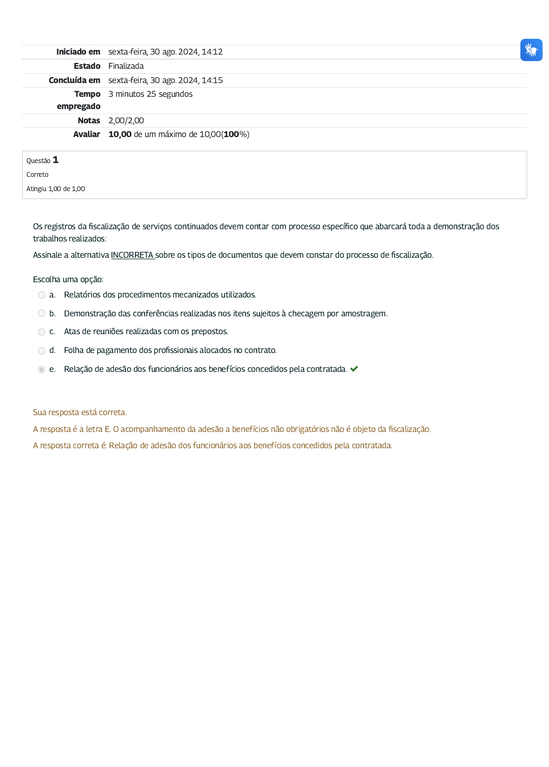 <p>Iniciado em sexta-feira, 30 ago. 2024, 14:12</p><p>Estado Finalizada</p><p>Concluída em sexta-feira, 30 ago. 2024, 14:15</p><p>Tempo</p><p>empregado</p><p>3 minutos 25 segundos</p><p>Notas 2,00/2,00</p><p>Avaliar 10,00 de um máximo de 10,00(100%)</p><p>Questão 1</p><p>Correto</p><p>Atingiu 1,00 de 1,00</p><p>Os registros da �scalização de serviços continuados devem contar com processo especí�co que abarcará toda a demonstração dos</p><p>trabalhos realizados:</p><p>Assinale a alternativa INCORRETA sobre os tipos de documentos que devem constar do processo de �scalização.</p><p>Escolha uma opção:</p><p>a. Relatórios dos procedimentos mecanizados utilizados.</p><p>b. Demonstração das conferências realizadas nos itens sujeitos à checagem por amostragem.</p><p>c. Atas de reuniões realizadas com os prepostos.</p><p>d. Folha de pagamento dos pro�ssionais alocados no contrato.</p><p>e. Relação de adesão dos funcionários aos benefícios concedidos pela contratada. </p><p>Sua resposta está correta.</p><p>A resposta é a letra E. O acompanhamento da adesão a benefícios não obrigatórios não é objeto da �scalização.</p><p>A resposta correta é: Relação de adesão dos funcionários aos benefícios concedidos pela contratada.</p><p>Questão 2</p><p>Correto</p><p>Atingiu 1,00 de 1,00</p><p>Uma das �guras centrais para garantir a impessoalidade na contratação de serviços é o preposto.</p><p>Analise as assertivas abaixo e marque a alternativa correta.</p><p>Escolha uma opção:</p><p>a. O preposto é indicado pela contratante.</p><p>b. A administração pode recusar o preposto indicado. </p><p>c. As comunicações com o preposto devem ser realizadas por meio de aparelho celular disponibilizado pela contratada.</p><p>d. O preposto assina os aditivos celebrados.</p><p>e. O preposto é o responsável por substituir empregados faltosos, requerer repactuação do contrato e entregar mensalmente</p><p>contracheques, avisos de férias e auxílios.</p><p>Sua resposta está correta.</p><p>A resposta é a letra B.</p><p>Com relação a letra A, o preposto é indicado pela contratada.</p><p>Quanto a letra C, ainda que seja possível a comunicação telefônica e que seja usual a exigência de disponibilização de celular para o</p><p>preposto, as comunicações devem ser realizadas preferencialmente por escrito.</p><p>Na letra D, o preposto não necessariamente é o representante legal da contratada.</p><p>E na letra E, as alterações contratuais são de atribuição do representante legal da empresa.</p><p>A resposta correta é: A administração pode recusar o preposto indicado.</p>