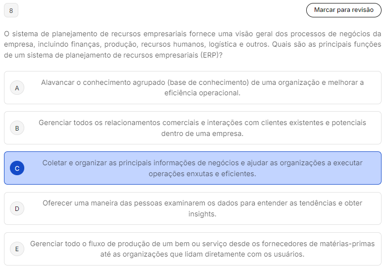 <p>8 Marcar para revisão sistema de planejamento de recursos empresariais fornece uma visão geral dos processos de negócios da empresa, incluindo finanças, produção, recursos humanos, logística e outros. Quais são as principais funções de um sistema de planejamento de recursos empresariais (ERP)? Alavancar conhecimento agrupado (base de conhecimento) de uma organização e melhorar a A eficiência operacional. Gerenciar todos os relacionamentos comerciais e interações com clientes existentes e potenciais B dentro de uma empresa. Coletar e organizar as principais informações de negócios e ajudar as organizações a executar C operações enxutas e eficientes. Oferecer uma maneira das pessoas examinarem os dados para entender as tendências e obter D insights. Gerenciar todo fluxo de produção de um bem ou serviço desde os fornecedores de matérias-primas E até as organizações que lidam diretamente com os usuários.</p>
