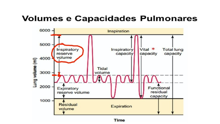 <p>Volumes pulmonares:</p><p>· Ventilação: movimentos de entrada e saída de ar dos pulmões</p><p>· Volume corrente: volume de ar inspirado e expirado espontaneamente em cada ciclo respiratório. Corresponde a cerca de 500ml.</p><p>Representa o ciclo respiratório normal, diário .</p><p>Existe variações no VC entre indivíduos, em repouso a frequência respiratória é entre 12 e 18 irpm.</p><p>· Volume minuto: volume de ar mobilizado em um minuto (VCxFR)</p><p>Frequência , volume e ritmo podem ser alterados por: emoções , dor, sono, choro, fonação, tosse , necessidade metabólica e doenças.</p><p>· Volume inspiratório de reserva : volume máximo que pode ser inspirado voluntariamente ao final de uma inspiração espontânea. Pode chegar a 3.000 ml.</p><p>· Volume expiratório de reserva : volume máximo que pode ser expirado voluntariamente a partir do final de uma expiração espontânea . Pode chegar a 1.100 ml.</p><p>· Volume residual: volume que permanece no pulmão após uma expiração máxima. Corresponde a cerca de 1.200 ml.</p><p>· Capacidade vital: volume medido na boca entre as posições de inspiração plena e expiração completa . Soma de VIR e do VER.</p><p>(Exame do bafometro)</p><p>· Capacidade residual funcional : volume contido nos pulmões ao final de uma expiração espontânea. Soma do VER e do VR.</p><p>· Capacidade pulmonar total: volume contido nos pulmões após uma inspiração plena. Soma de todos os volumes pulmonares (VC, VRI, VRE e VR) em condições normais é de cerca de 5.800 ml.</p><p>** os volumes pulmonares variam em função de fatores como genética, idade , altura, peso, atividade física e etnia .</p><p>image1.jpeg</p><p>Volumes pulmonares:</p><p>·</p><p>Ventilação</p><p>: movimentos de entrada e saída de ar dos pulmões</p><p>·</p><p>Volume corrente</p><p>: volume de ar inspirado e expirado espontaneamente em cada ciclo</p><p>respiratório. Corresponde a cerca de 500ml.</p><p>Representa o ciclo respiratório normal</p><p>,</p><p>diário .</p><p>Existe variações no VC entre indivíduos, em repouso a frequência resp</p><p>iratória é entre 12 e 18</p><p>irpm.</p><p>·</p><p>Volume minuto</p><p>: volume de ar mobilizado em um minuto (VCxFR)</p><p>Frequência , volume e ritmo podem ser alterados por: emoções , dor, sono, choro, fo</p><p>nação, tosse ,</p><p>nec</p><p>essidade metabólica e doenças.</p><p>·</p><p>Volume inspiratório de reserva</p><p>: volume máximo que pode ser inspirado</p><p>voluntariamente ao final de uma inspiração espontânea. Pode chegar a 3.000 ml.</p><p>·</p><p>Volume expiratório de reserva</p><p>: volume máximo que pode s</p><p>er expirado voluntariamente</p><p>a partir do final de uma expiração espontânea . Pode chegar a 1.100 ml.</p><p>·</p><p>Volume residual</p><p>: volume que permanece no pulmão após uma expiração máxima.</p><p>Corresponde a cerca de 1.200 ml.</p><p>·</p><p>Capacidade vital</p><p>: volume medido na boca entre</p><p>as posições de inspiração plena e</p><p>expiração completa . Soma de VIR e do VER.</p><p>(Exame do bafometro)</p><p>·</p><p>Capacidade residual funcional</p><p>: volume contido nos pulmões ao final de uma expiração</p><p>espontânea. Soma do VER e do VR.</p><p>Volumes pulmonares:</p><p> Ventilação: movimentos de entrada e saída de ar dos pulmões</p><p> Volume corrente: volume de ar inspirado e expirado espontaneamente em cada ciclo</p><p>respiratório. Corresponde a cerca de 500ml.</p><p>Representa o ciclo respiratório normal, diário .</p><p>Existe variações no VC entre indivíduos, em repouso a frequência respiratória é entre 12 e 18</p><p>irpm.</p><p> Volume minuto: volume de ar mobilizado em um minuto (VCxFR)</p><p>Frequência , volume e ritmo podem ser alterados por: emoções , dor, sono, choro, fonação, tosse ,</p><p>necessidade metabólica e doenças.</p><p> Volume inspiratório de reserva : volume máximo que pode ser inspirado</p><p>voluntariamente ao final de uma inspiração espontânea. Pode chegar a 3.000 ml.</p><p> Volume expiratório de reserva : volume máximo que pode ser expirado voluntariamente</p><p>a partir do final de uma expiração espontânea . Pode chegar a 1.100 ml.</p><p> Volume residual: volume que permanece no pulmão após uma expiração máxima.</p><p>Corresponde a cerca de 1.200 ml.</p><p> Capacidade vital: volume medido na boca entre as posições de inspiração plena e</p><p>expiração completa . Soma de VIR e do VER.</p><p>(Exame do bafometro)</p><p> Capacidade residual funcional : volume contido nos pulmões ao final de uma expiração</p><p>espontânea. Soma do VER e do VR.</p>
