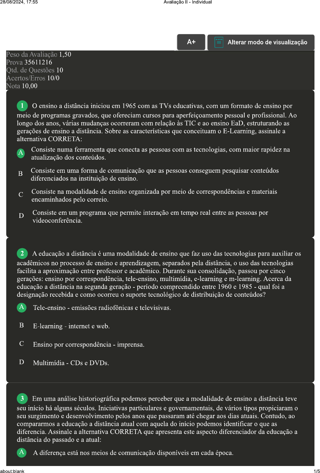 <p>28/08/2024, 17:55 Avaliação Individual A+ Alterar modo de visualização Peso da Avaliação 1,50 Prova 35611216 Qtd. de Questões 10 Acertos/Erros 10/0 Nota 10,00 1 O ensino a distância iniciou em 1965 com as TVs educativas, com um formato de ensino por meio de programas gravados, que ofereciam cursos para aperfeiçoamento pessoal e profissional. Ao longo dos anos, várias mudanças ocorreram com relação às TIC e ao ensino EaD, estruturando as gerações de ensino a distância. Sobre as características que conceituam E-Learning, assinale a alternativa CORRETA: A Consiste numa ferramenta que conecta as pessoas com as tecnologias, com maior rapidez na atualização dos conteúdos. B Consiste em uma forma de comunicação que as pessoas conseguem pesquisar conteúdos diferenciados na instituição de ensino. C Consiste na modalidade de ensino organizada por meio de correspondências e materiais encaminhados pelo correio. D Consiste em um programa que permite interação em tempo real entre as pessoas por videoconferência. 2 A educação a distância é uma modalidade de ensino que faz uso das tecnologias para auxiliar os acadêmicos no processo de ensino e aprendizagem, separados pela distância, uso das tecnologias facilita a aproximação entre professor e acadêmico. Durante sua consolidação, passou por cinco gerações: ensino por correspondência, tele-ensino, multimídia, e-learning e m-learning. Acerca da educação a distância na segunda geração período compreendido entre 1960 e 1985 qual foi a designação recebida e como ocorreu suporte tecnológico de distribuição de conteúdos? A Tele-ensino emissões radiofônicas e televisivas. B E-learning internet e web. C Ensino por correspondência imprensa. D Multimídia CDs e DVDs. 3 Em uma análise podemos perceber que a modalidade de ensino a distância teve seu início há alguns séculos. Iniciativas particulares e governamentais, de vários tipos propiciaram seu surgimento e desenvolvimento pelos anos que passaram até chegar aos dias atuais. Contudo, ao compararmos a educação a distância atual com aquela do início podemos identificar que as diferencia. Assinale a alternativa CORRETA que apresenta este aspecto diferenciador da educação a distância do passado e a atual: A A diferença está nos meios de comunicação disponíveis em cada época. about:blank 1/5</p><p>28/08/2024, 17:55 Avaliação Individual B O aspecto diferenciador é que no passado não se faziam avaliações, que ocorre nos dias atuais. C No passado era só iniciativa estatal, hoje é somente privada. D Os tutores/docentes eram essenciais no passado, hoje foco é autodidata apenas. 4 Em muitos países, a educação a distância é conhecida há mais de dois séculos, trazendo consigo um marco importante para esta modalidade de ensino. Este marco ocorreu por meio de um anúncio feito pela Gazeta de Boston, no ano de 1728, na edição de 20 de março. Assim, no século XIX, a educação a distância começou a existir institucionalmente em vários espaços da sociedade. Sobre contexto que identificou marco inicial da educação a distância, assinale a alternativa CORRETA: A Oferecia material para ensino e tutoria por correspondência nos cursos ofertados. B Os alunos poderiam se matricular em mais de um curso. C Os professores organizavam as aulas por videoconferência. D As aulas eram ofertadas em palestras divulgadas pela internet. 5 As gerações da educação a distância podem ser constituídas por seu período histórico, designação, suporte tecnológico, entre outras possíveis descrições. Entre estes tipos de descrições também temos a representação e a mediatização de conteúdo. Sobre exposto, associe os itens utilizando código a seguir: I- Geração. II- Geração. III- Geração. IV- V- Geração. ( ) Multimídia interativa. ( ) Multimídia colaborativa. ( ) Múltiplas Mídias. ( ) Multimídia conectada e contextual. ( ) Monomídia. Assinale a alternativa que apresenta a sequência CORRETA: A V II III - I IV. B I. C D III - I IV V - II. about:blank 2/5</p><p>28/08/2024, 17:55 Avaliação Individual 6 Por meio de uma abordagem quantitativa-qualitativa, Behar e Silva (2012) realizaram um mapeamento de competências que julga ser necessário aos alunos da EaD, apresentado os conhecimentos, as habilidades e as atitudes do aluno que opta por esta metodologia de ensino. Neste estudo, houve uma diferenciação entre as doze competências do aluno da EaD, dividindo-as em grau de competências básicas, medianas e difíceis. Sobre as competências que se enquadram nas competências medianas, assinale a alternativa CORRETA: FONTE: BEHAR, Patricia Alejandra; SILVA, Ketia Kellen Araújo da. Mapeamento de competências: um foco no aluno da educação a distância. RENOTE, V. 10, n. 3, 2012. A Autonomia para agir nas situações e planejamento para conseguir alcançar os objetivos. B Autoavaliação constante e comunicação subjetiva com impressões pessoais. C Comunicação clara e objetiva e a reflexão com análise crítica das situações. D Fluência digital e flexibilidade no uso das tecnologias e comunicação. 7 Ao longo dos anos, ensino a distância sofreu alterações conforme desenvolvimento tecnológico da sociedade. Dessa forma, passou por algumas gerações com especificidades próprias que se diferenciam em vários aspectos, incluindo a sua designação. Sobre as características que constituem E-Learning, analise as sentenças a seguir: I- Apresenta rapidez na atualização dos conteúdos. II- Apresenta custos altos, principalmente por sua logística tecnológica. Apresenta disponibilidade permanente dos conteúdos. IV- Apresenta maior alcance do público em todas as regiões geográficas. Assinale a alternativa CORRETA: A As sentenças I, II e IV estão corretas. B As sentenças I, II e III estão corretas. As sentenças I, III e IV estão corretas. D As sentenças II, III e IV estão corretas. 8 O surgimento da 