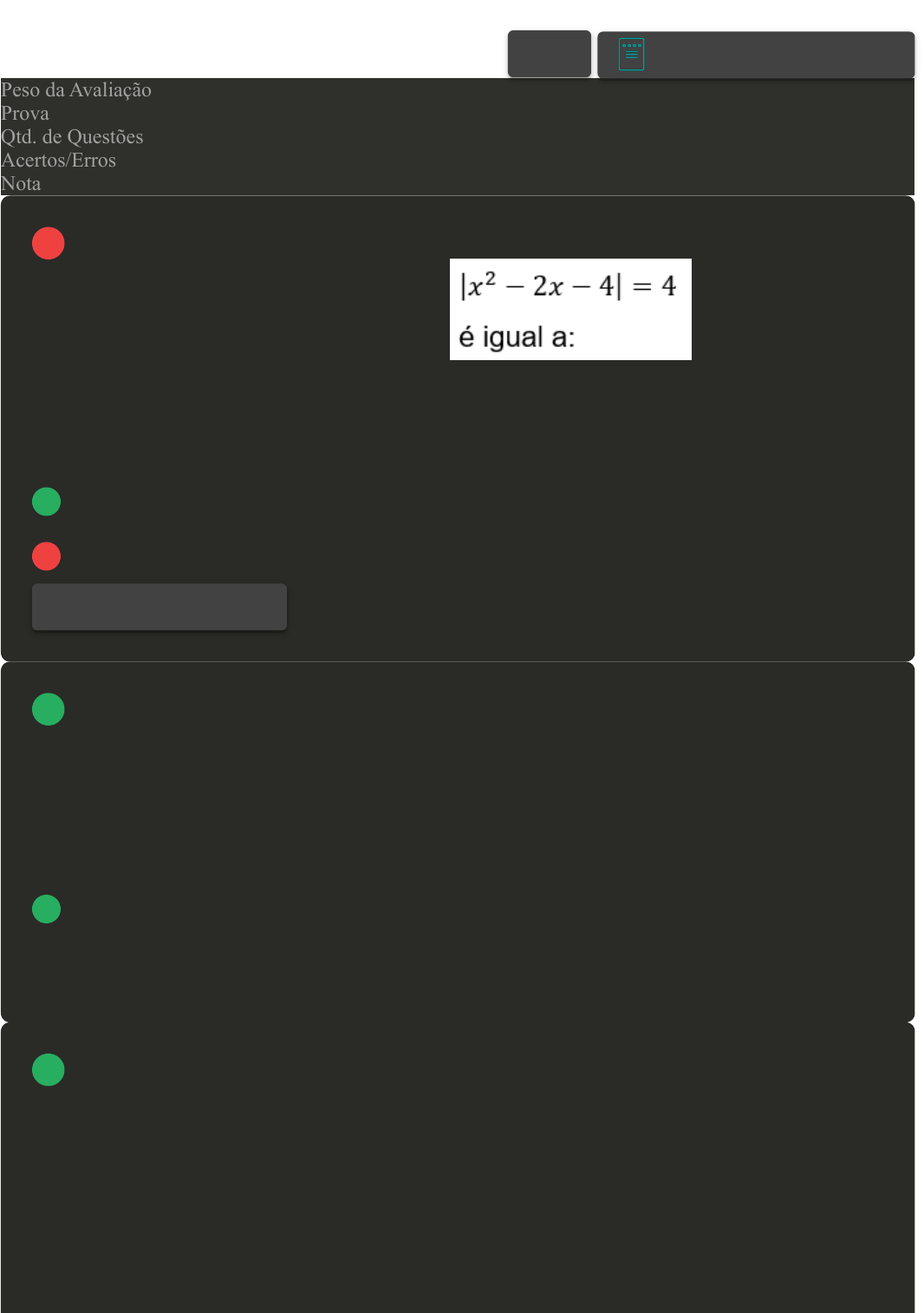 <p>Prova Impressa</p><p>GABARITO | Avaliação II - Individual (Cod.:822898)</p><p>Peso da Avaliação 1,50</p><p>Prova 64604300</p><p>Qtd. de Questões 10</p><p>Acertos/Erros 9/1</p><p>Nota 9,00</p><p>Uma equação modular é uma equação que envolve modulo de uma expressão algébrica. O</p><p>conjunto de todas as soluções da equação modular</p><p>A S = { - 6, 1, 5}.</p><p>B S = { - 1, - 2, - 4}.</p><p>C S = { - 2, 0, 2, 4}.</p><p>D S = { - 4, - 2, 0, 2}.</p><p>O marcador de combustível de um carro mostra que o tanque está com 3/4 da sua capacidade.</p><p>Sabendo que o tanque está com 48 litros de gasolina, quantos litros cabem no tanque cheio desse</p><p>carro?</p><p>A O tanque cheio tem 144 litros.</p><p>B O tanque cheio tem 76 litros.</p><p>C O tanque cheio tem 64 litros.</p><p>D O tanque cheio tem 60 litros.</p><p>As relações de Girard são responsáveis pela relação existente entre os coeficientes de uma equação e</p><p>suas raízes. Sendo assim, determine as raízes da equação x3 - 2 x2 - x + 2 = 0:</p><p>A x1 = - 2 , x2 = -1 e x3 = -1.</p><p>VOLTAR</p><p>A+ Alterar modo de visualização</p><p>1</p><p>Revisar Conteúdo do Livro</p><p>2</p><p>3</p><p>10/09/24, 18:50 Avaliação II - Individual</p><p>about:blank 1/4</p><p>B x1= 2 , x2 = - 1 e x3 = 1.</p><p>C x1 = - 2 , x2 = 1 e x3 = 1.</p><p>D x1 = 2 , x2 = -1 e x3 = - 1.</p><p>Uma equação é formada por duas expressões algébricas ligadas por uma igualdade. Já em uma</p><p>inequação temos duas expressões algébricas, envolvendo uma ou mais variáveis, ligadas por uma</p><p>desigualdade. Resolver uma inequação é determinar o intervalo onde a inequação é satisfeita. O</p><p>intervalo onde a inequação x² + x - 2 < 0 é satisfeita é:</p><p>A - 1 < x < 2.</p><p>B x < - 2 e x > 1.</p><p>C x < - 1 e x > 2.</p><p>D - 2 < x < 1.</p><p>Para encontrar as raízes de uma equação do 2º grau, podemos utilizar o método da soma e</p><p>produto. Com base no exposto, calcule as raízes da equação x² - 4x + 4 = 0 e determine a soma das</p><p>raízes.</p><p>A A soma das raízes é 4.</p><p>B A soma das raízes é -16.</p><p>C A soma das raízes é - 4.</p><p>D A soma das raízes é 16.</p><p>Calcular o logaritmo de um número consiste em descobrir qual é o número que servirá de</p><p>expoente para a base cujo o resultado deve ser o logaritmando. O logaritmo possui várias aplicações</p><p>na Matemática e em diversas áreas do conhecimento, como Física, Biologia, Química, Medicina,</p><p>Geografia, entre outras. As propriedades do logaritmo são fundamentais para interpretarmos algumas</p><p>situações do dia a dia. Identificando o valor numérico da expressão a seguir, assinale a alternativa</p><p>CORRETA:</p><p>A 3.</p><p>B 2.</p><p>4</p><p>5</p><p>6</p><p>10/09/24, 18:50 Avaliação II - Individual</p><p>about:blank 2/4</p><p>C 1.</p><p>D 4.</p><p>Para resolver uma equação exponencial precisamos utilizar as propriedades de potenciação.</p><p>Utilizando tais propriedades de potenciação, determinando a solução da equação a seguir, assinale a</p><p>alternativa CORRETA:</p><p>A x = 3.</p><p>B x = - 3.</p><p>C x = 3/7.</p><p>D x = - 3/7.</p><p>Uma bola colocada no chão é chutada para o alto, percorrendo uma trajetória descrita por y = -</p><p>2x² + 12x, em que y é a altura dada em metros. Sobre a altura máxima atingida pela bola, assinale a</p><p>alternativa CORRETA:</p><p>A 18 metros.</p><p>B 12 metros.</p><p>C 36 metros.</p><p>D 6 metros.</p><p>Uma pessoa chega atrasada e acaba perdendo o ônibus. Como ela tem um compromisso</p><p>inadiável, resolve contratar os serviços de um taxista, que lhe informa que a bandeirada (saída) custa</p><p>R$ 10,00 e o custo por quilômetro rodado é de R$ 2,50. Considerando que o custo da viagem foi de</p><p>R$ 50,00, qual a distância percorrida pelo táxi?</p><p>A A distância será de 17 Km.</p><p>B A distância será de 20 Km.</p><p>C A distância será de 16 Km.</p><p>D A distância será de 12 Km.</p><p>7</p><p>8</p><p>9</p><p>10/09/24, 18:50 Avaliação II - Individual</p><p>about:blank 3/4</p><p>Uma inequação pode envolver o produto ou o quociente de duas ou mais funções. Se o lado</p><p>esquerdo da inequação for o produto ou o quociente de duas funções e o lado direito da inequação for</p><p>apenas zero, podemos resolvê-la analisando o sinal de cada função e respeitado as regras de sinais. O</p><p>intervalo onde a inequação</p><p>A Somente a sentença IV está correta.</p><p>B Somente a sentença III está correta.</p><p>C Somente a sentença II está correta.</p><p>D Somente a sentença I está correta.</p><p>10</p><p>Imprimir</p><p>10/09/24, 18:50 Avaliação II - Individual</p><p>about:blank 4/4</p>