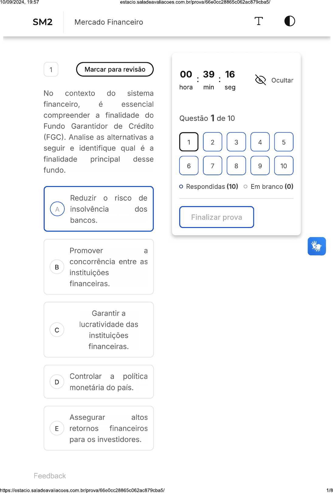 <p>10/09/2024, 19:57 SM2 Mercado Financeiro T 1 Marcar para revisão 00 : 39 : 16 Ocultar hora min seg No contexto do sistema financeiro, é essencial compreender a finalidade do Questão 1 de 10 Fundo Garantidor de Crédito (FGC). Analise as alternativas a 1 2 3 4 5 seguir e identifique qual é a finalidade principal desse 6 7 8 9 10 fundo. Respondidas (10) Em branco (0) Reduzir o risco de A insolvência dos bancos. Finalizar prova Promover a concorrência entre as B instituições financeiras. Garantir a lucratividade das C instituições financeiras. Controlar a política D monetária do país. Assegurar altos E retornos financeiros para os investidores. Feedback 1/8</p><p>10/09/2024. 19:57 estacio.saladeavaliacoes.com.br/prova/66e0cc28865c062ac879cba5/ 2 Marcar para revisão No processo de análise de crédito realizado pelas instituições financeiras, é fundamental considerar a capacidade de pagamento do tomador e o risco envolvido na concessão do empréstimo. Para isso, essas instituições podem recorrer a bancos de dados e cadastros que fornecem informações sobre o histórico financeiro dos clientes. Qual é o banco de dados que registra informações negativas de inadimplência dos consumidores e é considerado uma entidade de caráter público de acordo com a Lei de Proteção ao Consumidor? Sistema de Informações de A Crédito (SCR) do Banco Central. B Cadastro Positivo. C Serasa. SPC (Serviço de D Proteção ao Crédito). E SCPC/Boa Vista. 2/8</p><p>10/09/2024, 19:57 3 Marcar para revisão No âmbito do mercado financeiro, existem produtos bancários diversos específicos para diferentes públicos e necessidades. Qual é o produto de empréstimo bancário específico para o financiamento da atividade agropecuária, abrangendo tanto famílias quanto empresas? A Crédito rotativo. B Crédito pessoal. C Crédito consignado. D Crédito imobiliário. E Crédito rural. 4 Marcar para revisão Um título vale hoje R$ reais e promete pagar R$ 1.000 reais em 1 ano. Qual a taxa de juros anual da operação? 3/8</p><p>10/09/2024, 19:57 A 10% B 5% C 7,18% D 6,34% E 5,26% 5 Marcar para revisão Quais das seguintes opções representa uma técnica de análise de ações que se baseia em gráficos de movimentos dos preços. A Análise técnica B Análise de múltiplos Análise C fundamentalista D Análise top-down E Análise bottom-up 4/8</p><p>10/09/2024, 19:57 6 Marcar para revisão Selecione a opção que completa corretamente as lacunas abaixo. Quando a taxa de juros (I) o valor presente dos títulos de renda fixa sobem, quando a taxa de juros (II) o valor presente dos títulos de renda fixa caem. diminuem, A convergem I-divergem, II- B aumentam I-diminuem, II- C aumentam I-divergem, D convergem II- E diminuem 7 Marcar para revisão Assinale a única alternativa que não corresponde a um agente que pode ser autorizado pelo 5/8</p><p>10/09/2024, 19:57 Banco Central do Brasil para operar no mercado de câmbio. Sociedades A seguradoras. Bancos de B Investimento. C Bancos Múltiplos. D Caixas Econômicas. Sociedades E corretoras de títulos e valores mobiliários. 8 Marcar para revisão Qual é o valor de uma opção de compra no vencimento se o dólar vale R$5,00 e o preço de exercício, R$5,50? A opção dá o direito de se comprar o dólar a R$5,50. A -0,50 B 0,00 C 0,50 6/8</p><p>10/09/2024, 19:57 D 5,00 E -5,00 9 Marcar para revisão No contexto dos bancos de desenvolvimento regional, é importante compreender qual é principal objetivo dessas instituições. Analise as alternativas a seguir e identifique qual é o objetivo central dos bancos de desenvolvimento regional, como o Banco Nacional do Desenvolvimento Econômico e Social (BNDES) e o Banco da Amazônia. Fomentar a atividade A econômica. Financiar projetos B internacionais. Apoiar C exclusivamente o setor público. 7/8</p><p>10/09/2024, 19:57 Proporcionar serviços D bancários básicos. Gerar lucro para os E acionistas. 10 Marcar para revisão mercado de títulos de dívida, ou mercado de renda fixa, é um dos mais movimentados no Brasil. Dentro desse contexto, o que significa um título estar sendo negociado ao par? A taxa de juros do A título é maior que o cupom. A taxa de juros é igual B ao cupom. principal é maior do C que o cupom. A taxa de juros do D título é menor que o cupom. principal é igual ao E cupom. 8/8</p>