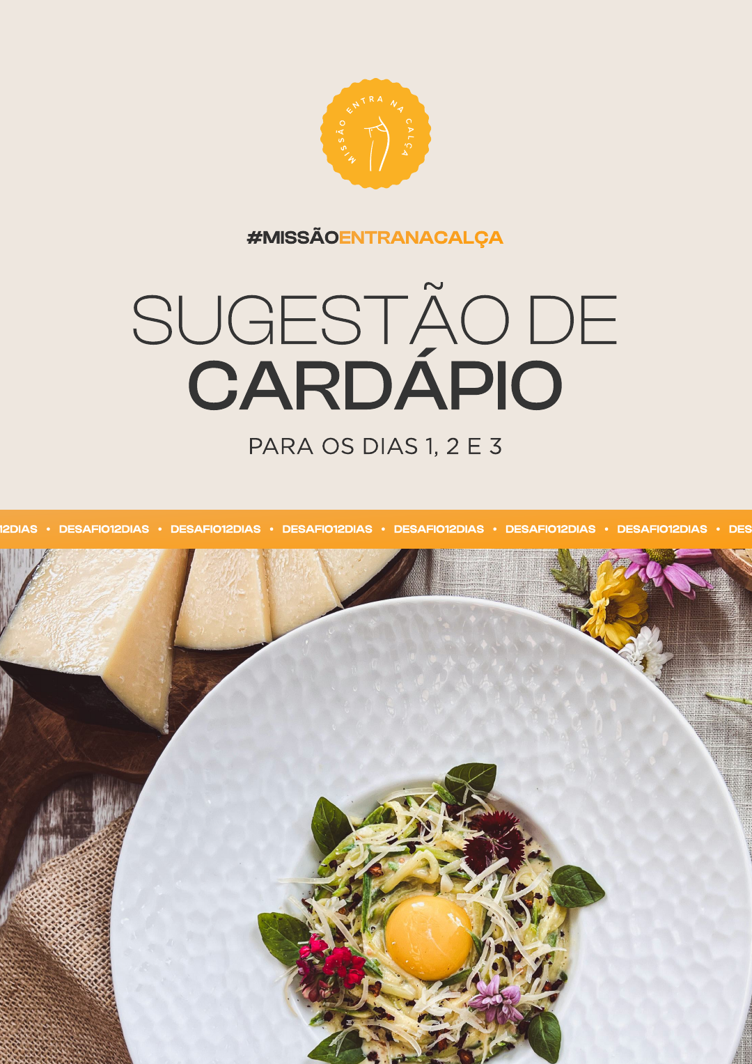 <p># m i s s ã o e n t r a n a c a l ç a</p><p>#MISSÃOENTRANACALÇA</p><p>sugestão de</p><p>cardápio</p><p>DESAFIO12DIAS • DESAFIO12DIAS • DESAFIO12DIAS • DESAFIO12DIAS • DESAFIO12DIAS • DESAFIO12DIAS • DESAFIO12DIAS • DESAFIO12DIAS</p><p>PARA OS DIAS 1, 2 E 3</p><p>Preparamos esta sugestão de cardápio</p><p>para você se alimentar durante os 12 dias</p><p>da Missão.</p><p>Nos 3 primeiros dias, você deve seguir o</p><p>planejamento dessa sugestão de cardápio.</p><p>Depois, a cada 3 dias, você terá novas</p><p>receitas deliciosas para preparar,</p><p>intercalando o período dos 12 dias.</p><p>Tudo nesta sugestão de cardápio foi</p><p>pensado e elaborado com muito carinho</p><p>pela nossa equipe de nutrição. Temos</p><p>certeza que você vai adorar e se deliciar</p><p>em cada refeição.</p><p>Bora entrar nessa calça!</p><p>2</p><p>INTRODUÇÃO</p><p>Este programa tem acompanhamento técnico da nutricionista</p><p>Paula Fernanda Meotti Barboza (CRN-10:12275)</p><p># m i s s ã o e n t r a n a c a l ç a</p><p>dicas importantes</p><p>Evite o jejum prolongado (mais de três</p><p>horas e meia sem se alimentar). A</p><p>melhor forma de se alimentar é de três</p><p>em três horas e em pouca quantidade,</p><p>evitando o excesso de alimentação</p><p>Beber diariamente a quantidade</p><p>indicada de água para o seu peso, faça</p><p>o cálculo de 35 ml de água vezes o seu</p><p>peso e assim saberá a quantidade</p><p>diária indicada. Exceto quem sofre de</p><p>problemas nos rins ou tem algum tipo</p><p>de deficiência de acordo com</p><p>orientação médica.</p><p>Todas as frutas, verduras e legumes</p><p>devem ser bem lavados antes do</p><p>consumo</p><p>É proibido o uso de qualquer tipo de</p><p>açúcar</p><p>Reduza o consumo de sal marinho</p><p>refinado. Utilize o sal grosso, que pode</p><p>ser moído no liquidificador.</p><p>3</p><p># m i s s ã o e n t r a n a c a l ç a</p><p>Nunca coe ou faça sucos em</p><p>processadores, pois o consumo das fibras</p><p>é muito importante. Além delas</p><p>colaborarem para um bom</p><p>funcionamento do intestino, são</p><p>responsáveis por impedir que o</p><p>organismo absorva totalmente o açúcar</p><p>Para dourar e refogar os temperos e</p><p>alimentos, substitua o azeite por 10</p><p>colheres (sopa) de água</p><p>ESCOLHA APENAS UMA OPÇÃO DE CADA</p><p>GRUPO EM CADA REFEIÇÃO</p><p>Utilize somente o peito de frango ou o</p><p>filé do peixe</p><p>Entenda que, se você não mudar seus</p><p>hábitos alimentares, jamais terá uma boa</p><p>qualidade de vida e, consequentemente,</p><p>não terá resultado estético satisfatório.</p><p>Não se preocupe com o peso, modifique</p><p>a composição</p><p>Sobre o adoçante: Caso utilize o</p><p>adoçante 100% stevia que</p><p>recomendamos, use uma quantidade</p><p>bem menor do que o indicado no</p><p>preparo de suas RECEITAS. Esse</p><p>adoçante, por ser natural 100% stevia,</p><p>possui poder de adoçar muito eficaz,</p><p>mesmo quando usado em pequenas</p><p>quantidades.</p><p>4</p><p># m i s s ã o e n t r a n a c a l ç a</p><p>Í N D I C E Este é um índice interativo.</p><p>Clique na página de seu</p><p>interesse e seja redirecionado.</p><p>Refeições dias 1, 2 e 3 06</p><p>Sanduíche crocante 09</p><p>Cocada de forno 10</p><p>Shake de coco 11</p><p>Doritos proteico 12</p><p>Mousse de limão 13</p><p>Macarrão carbonara 14</p><p>Strogonoff de frango 15</p><p>Bolinho de frango com requeijão 16</p><p>Moscow mule 17</p><p>Pizza de frango 18</p><p>Kafta 19</p><p>Protocolo Energize-se 20</p><p>Chá Termogênico 21</p><p>Receitas Complementares 22</p><p>Patê de frango 23</p><p>Bacon Crocante do Seca 24</p><p>5</p><p>DIAS 1, 2 e 3 Toque na receita para</p><p>visualizá-la por completo</p><p>Café da manhã</p><p>Obrigatório, independentemente da refeição</p><p>escolhida</p><p>1 copo (200 ml) de água + 1 colher (sopa) de</p><p>limão ao acordar</p><p>1 receita de protocolo energize-se durante a</p><p>refeição.</p><p>+ uma das opções a escolha</p><p>1 receita de sanduíche crocant</p><p>1 receita de cocada de forno + shake de coco</p><p>Lanche da manhã</p><p>Obrigatório, independentemente da refeição</p><p>escolhida</p><p>1 copo (200 ml) de água + 1 colher (sopa) de</p><p>limão, 30 minutos antes da refeição</p><p>1 copo (200 ml) de água + 1 colher (sopa) de</p><p>limão, após a refeição</p><p>+ uma das opções a escolha</p><p>½ receita de doritos proteic</p><p>½ mousse de limão</p><p>Almoço</p><p>Obrigatório, independentemente da refeição</p><p>escolhida</p><p>1 copo (200 ml) de água + 1 colher (sopa) de</p><p>vinagre de maçã, 30 minutos antes da refeiçã</p><p>1 copo (200 ml) de água + 1 colher (sopa) de</p><p>vinagre de maçã, após a refeição</p><p>+ uma das opções a escolha</p><p>1 receita de macarrão à carbonara + 120 g de</p><p>peito de frango ou tilápia grelhad</p><p>1 receita de strogonoff de frango</p><p>+ salada de folhas verdes à vontade</p><p>6</p><p># m i s s ã o e n t r a n a c a l ç a</p><p>DIAS 1, 2 e 3 Toque na receita para</p><p>visualizá-la por completo</p><p>Lanche da tarde</p><p>Obrigatório, independentemente da refeição</p><p>escolhida</p><p>1 copo (200 ml) de água quente + 10 cravos,</p><p>30 minutos antes da refeiçã</p><p>1 copo (200 ml) de água quente + 10 cravos,</p><p>após a refeição</p><p>+ uma das opções a escolha</p><p>1 receita de bolinho de frango com requeijã</p><p>1 receita de moscow mule</p><p>Jantar</p><p>Obrigatório, independentemente da refeição</p><p>escolhida</p><p>1 receita de chá termogênico 30 minutos</p><p>antes da refeiçã</p><p>1 receita de chá termogênico após a refeição</p><p>+ uma das opções a escolha</p><p>1 receita de pizza de frang</p><p>1 receita de kafta</p><p>+ salada de folhas verdes à vontade</p><p>7</p><p>R</p><p>E</p><p>C</p><p>E</p><p>IT</p><p>A</p><p>S</p><p>7</p><p>voltar ao índ ice 9# m i s s ã o e n t r a n a c a l ç a</p