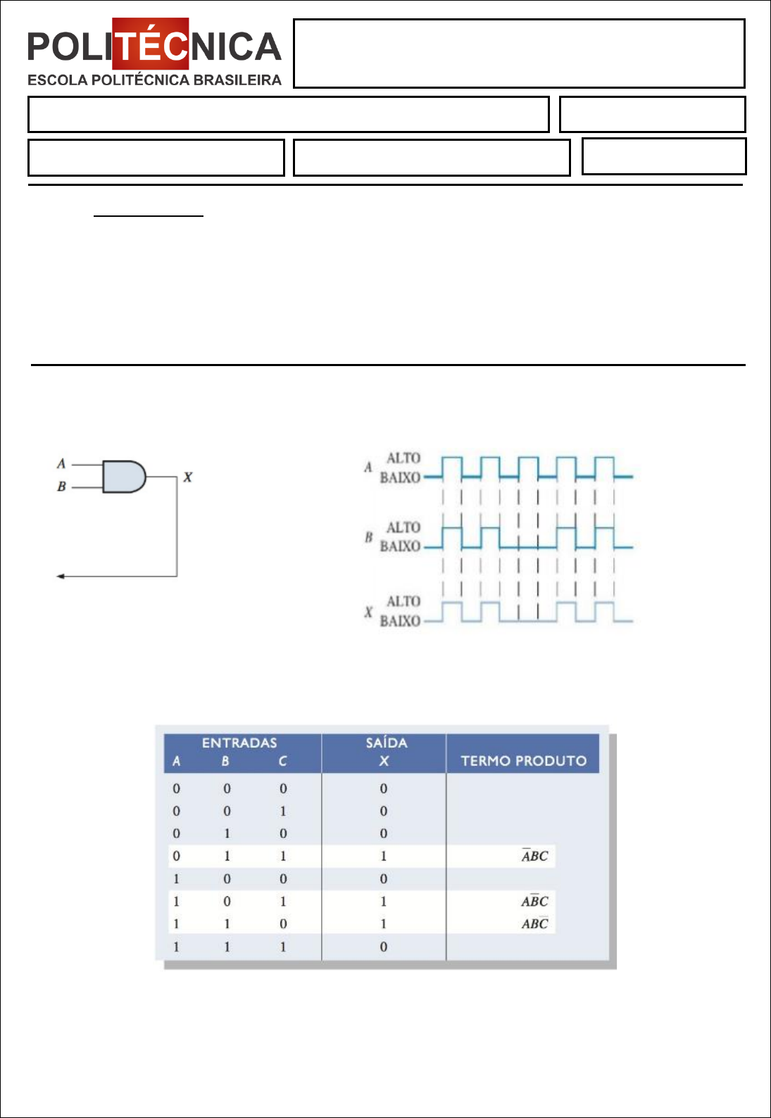 <p>Atividade de Pesquisa: Sistemas Digitais</p><p>1 - Se duas formas de onda, A e B, são aplicadas nas entradas de uma porta AND conforme mostrado</p><p>na figura abaixo, qual é a forma de onda de saída resultante?</p><p>2 - Projete um circuito lógico para implementar a operação especificada na tabela verdade mostrada na</p><p>imagem abaixo:</p><p>Sistemas Digitais</p><p>Aluno (a): João Victor Santana da Silva Data: 08/09/2024</p><p>Atividade de Pesquisa NOTA:</p><p>INSTRUÇÕES:</p><p>❖ Esta Avaliação contém 10 (dez) questões, totalizando 10 (dez) pontos.</p><p>❖ Você deve preencher dos dados no Cabeçalho para sua identificação</p><p>o Nome / Data de entrega</p><p>❖ As respostas devem ser digitadas abaixo de cada pergunta.</p><p>❖ Ao terminar grave o arquivo com o seu nome e envie o arquivo pelo sistema.</p><p>Atividade de Pesquisa: Sistemas Digitais</p><p>3 - Determine a forma de onda fout para o circuito dado na imagem abaixo quando uma onda quadrada</p><p>de 8 kHz for aplicada na entrada de clock do flip-flop A.</p><p>4 - A Figura abaixo mostra um temporizador 555 configurado no modo (oscilador).</p><p>Determine a frequência de saída e o ciclo de trabalho.</p><p>Atividade de Pesquisa: Sistemas Digitais</p><p>5 - São realizadas medidas de frequência no contador truncado mostrado na imagem abaixo conforme</p><p>indicado. Determine se o contador está funcionando corretamente e, em caso negativo, determine o</p><p>defeito.</p><p>f4 = 10 MHz/32.064</p><p>F4311,88 Hz</p><p>Módulo fin/ fout = 10 MHz/637,76 Hz Módulo 15.680</p><p>contagem presetada = módulo completo módulo truncado</p><p>contagem presetada = 65.536-15.5680</p><p>contagem presetada = 49.856</p><p>contagem presetada = C2C016</p><p>o contador está sendo presetado com C2C016, em vez de 82C016, cada vez que recicla. Os conta-</p><p>dores 1, 2 e 3 estão sendo presetados corretamente, porém o contador 4 não. Como C16 = 11002,</p><p>a entrada D2 para o contador 4 está em nível ALTO quando deveria ser nível BAIXO. Isso é</p><p>causado mais provavelmente por uma entrada aberta.</p><p>Atividade de Pesquisa: Sistemas Digitais</p><p>6 - Mostre os estados do registrador de 5 bits mostrado na imagem abaixo para as formas de onda de</p><p>entrada de dados especificada e do clock.</p><p>Considere que o registrador esteja inicialmente zerado (todos os bits em nível 0).</p><p>7 - O conteúdo hexadecimal do registrador CS e do IP são mostrados na imagem abaixo. Determine o</p><p>endereço físico da próxima instrução na memória.</p><p>8 - Um ALM em um FPGA Stratix II é configurado no modo LUT estendida, como mostra a imagem</p><p>abaixo. Para as saídas da LUT específica mostrada, determine a saída de soma de produtos final.</p><p>9 - Determine as saídas A = B, A > B e A < B para os números de entradas mostrados no comparador</p><p>visto na imagem abaixo.</p><p>Atividade de Pesquisa: Sistemas Digitais</p><p>10 - Determine as margens de ruído dos níveis ALTO e BAIXO para CMOS e TTL usando as infor-</p><p>mações dadas nas imagens abaixo.</p><p>Atividade de Pesquisa: Sistemas Digitais</p>