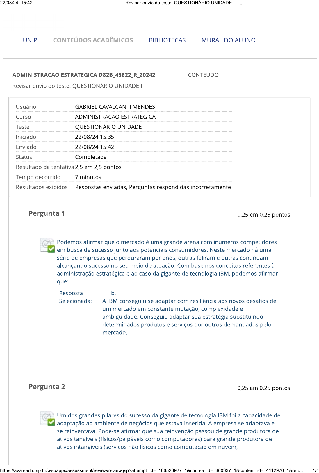 <p>22/08/24, 15:42 Revisar envio do teste: QUESTIONÁRIO UNIDADE UNIP CONTEÚDOS ACADÊMICOS BIBLIOTECAS MURAL DO ALUNO ADMINISTRACAO ESTRATEGICA D82B_45822_R_20242 CONTEÚDO Revisar envio do teste: QUESTIONÁRIO UNIDADE Usuário GABRIEL CAVALCANTI MENDES Curso ESTRATEGICA Teste QUESTIONÁRIO UNIDADE I Iniciado 22/08/24 15:35 Enviado 22/08/24 15:42 Status Completada Resultado da tentativa 2,5 em 2,5 pontos Tempo decorrido 7 minutos Resultados exibidos Respostas enviadas, Perguntas respondidas incorretamente Pergunta 1 0,25 em 0,25 pontos Podemos afirmar que o mercado é uma grande arena com inúmeros competidores em busca de sucesso junto aos potenciais consumidores. Neste mercado há uma série de empresas que perduraram por anos, outras faliram e outras continuam alcançando sucesso no seu meio de atuação. Com base nos conceitos referentes à administração estratégica e ao caso da gigante de tecnologia IBM, podemos afirmar que: Resposta b. Selecionada: A IBM conseguiu se adaptar com resiliência aos novos desafios de um mercado em constante mutação, complexidade e ambiguidade. Conseguiu adaptar sua estratégia substituindo determinados produtos e serviços por outros demandados pelo mercado. Pergunta 2 0,25 em 0,25 pontos Um dos grandes pilares do sucesso da gigante de tecnologia IBM foi a capacidade de adaptação ao ambiente de negócios que estava inserida. A empresa se adaptava e se reinventava. Pode-se afirmar que sua reinvenção passou de grande produtora de ativos tangíveis (físicos/palpáveis como computadores) para grande produtora de ativos intangíveis (serviços não físicos como computação em nuvem, 1&retu.. 1/4</p><p>22/08/24, 15:42 Revisar envio do teste: QUESTIONÁRIO UNIDADE desenvolvimento de patentes e softwares). Neste contexto, aponte a afirmação abaixo que melhor explica os motivos do sucesso e da longevidade da IBM: Resposta Selecionada: a. Adaptabilidade, flexibilidade, resiliência e inovação. Pergunta 3 0,25 em 0,25 pontos É fundamental para o administrador entender (perceber) a dinâmica competitiva das organizações no mercado e conseguir constatar tendências e potenciais mudanças futuras nos mercados consumidores. Em outras palavras, o administrador deverá estar sempre atento a tudo que pode afetar a organização. Seja uma mudança regulatória (lei), seja uma mudança estrutural na cadeia de fornecedores ou outro fator que gerará impacto direto ou indireto nos negócios da empresa. Considerando que os mercados estão em constante mudança, aponte abaixo a única afirmação incorreta referente a exemplos de mudanças que ocorreram no mercado e nas empresas nos últimos anos. Resposta e. Selecionada: A fabricante finlandesa de celulares Nokia tornou-se líder no mercado de smartphones e tecnologia graças à sua grande capacidade de se adaptar. Pergunta 4 0,25 em 0,25 pontos Sun Tzu escreveu o livro: "A arte da guerra", obra em que ele desenvolve várias técnicas estratégicas para derrotar um exército adversário. Este livro cobre todos os aspectos de como se fazer uma guerra e fornece conselhos estratégicos e filosóficos que são utilizados até hoje. Considerando a evolução histórica da administração estratégica, podemos afirmar que: Resposta C. Selecionada: Estudando a história da administração estratégica, constata-se a grande influência de filósofos e historiadores com influência ou atuação militar. Estes contribuíram para os primeiros estudos da concorrência. Pergunta 5 0,25 em 0,25 pontos 2/4</p><p>22/08/24, 15:42 Revisar envio do teste: QUESTIONÁRIO UNIDADE Na primeira metade do século XX (1900 a 1950), a evolução dos negócios se deu mais por crescimento de demanda do que por concorrência pelos mesmos mercados. Desta forma, as empresas praticamente não precisavam se preocupar com o ambiente externo, direcionando esforços para melhorar seus processos internos. Neste contexto, aponte a única afirmação incorreta referente a este período: Resposta b. Selecionada: Podemos afirmar que, neste período, foi divulgada uma série de estudos de administração estratégica, já que era fundamental para as empresas adotar medidas de competição em um mercado cada vez menor. Pergunta 6 0,25 em 0,25 pontos A partir dos anos de 1950, uma série de estudos e materiais foi lançada. Uma importante obra da administração estratégica é a contribuição de Peter Drucker que, em 1954, lançou a obra: The practice of management (1954) - material em que defende que o negócio é determinado pelo cliente e suas necessidades. Quanto à linha de pensamento de Peter Drucker em relação à administração estratégica, é correto afirmar que: Resposta d. Selecionada: Peter Drucker defendia que não é o dono (ou acionista) do negócio quem determina a existência da empresa ou dos produtos ou serviços que ela vende: é cliente. Pergunta 7 0,25 em 0,25 pontos Durante a década de 1960, foram lançados novos estudos e ferramentas de administração estratégica. Dentre elas podemos citar a matriz BCG elaborada pela consultoria Boston Consulting Group. Aponte a afirmação correta referente a esta importante ferramenta de gestão administrativa: Resposta e. Selecionada: É uma ferramenta de análise de portfólio de produtos que considera: dados de volumes de vendas do próprio e da concorrência, taxa de crescimento e representatividade no faturamento para cada produto oferecido ao mercado. É demostrada em um quadro-gráfico que permite analisar a situação de mercado de cada produto. 3/4</p><p>22/08/24, 15:42 Revisar envio do teste: QUESTIONÁRIO UNIDADE Pergunta 8 0,25 em 0,25 pontos No período compreendido entre 1980 e 1990, as teorias referentes à administração estratégica são dominadas por Michael Porter por meio de três livros: Competitive strategy (1980); Competitive advantage (1986) e The competitive advantage of nations (1990). Michael Porter apresentou alguns modelos que demonstram como as forças