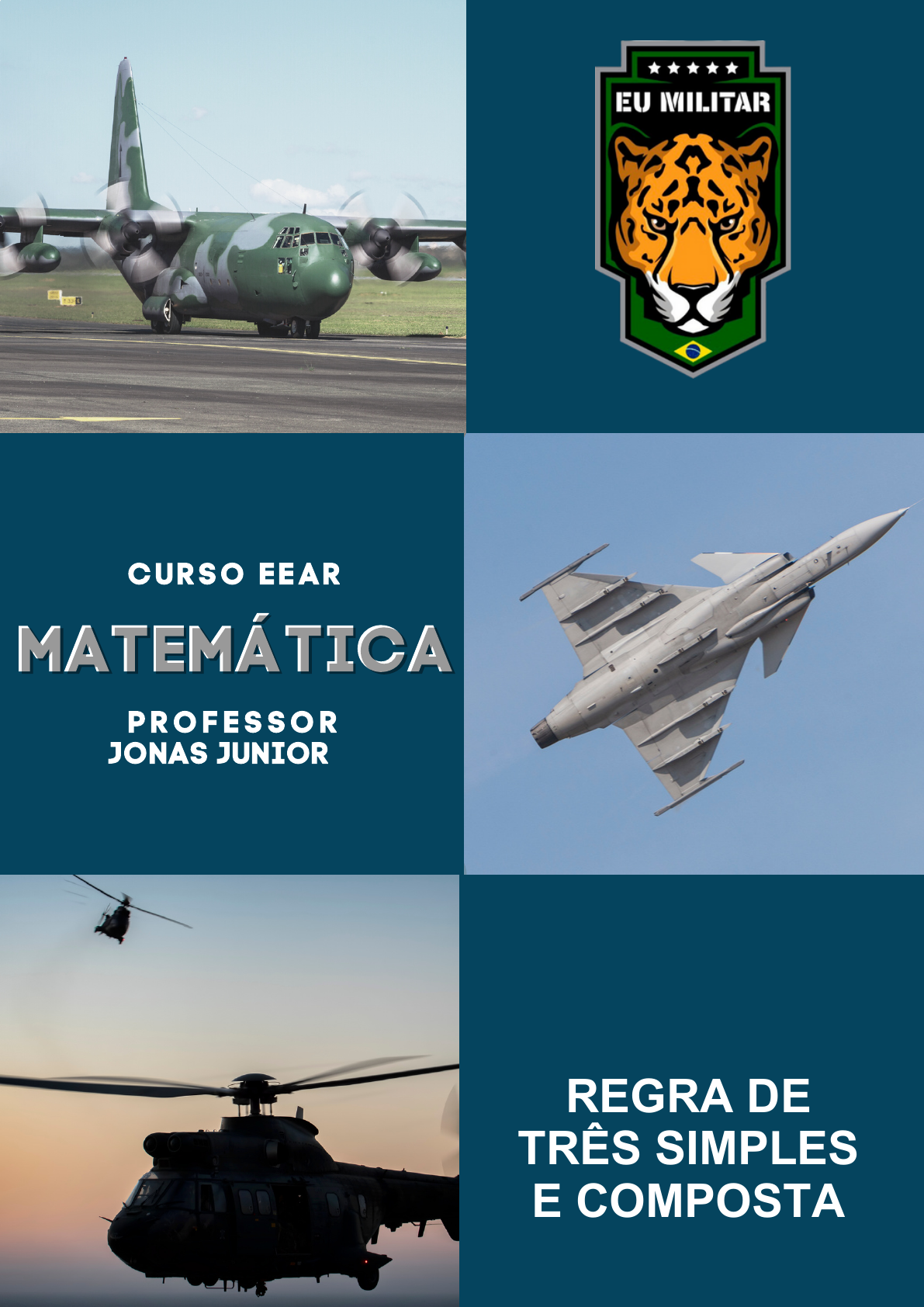 <p>MMAATTEEMMÁÁTTIICCAA</p><p>P R O F E S S O R</p><p>JONAS JUNIOR</p><p>CURSO EEAR</p><p>REGRA DE</p><p>TRÊS SIMPLES</p><p>E COMPOSTA</p><p>Todos os direitos reservados a</p><p>EU MILITAR</p><p>Nova Iguaçu-RJ</p><p>suporte@eumilitar.com</p><p>Curso EEAR</p><p>É proibida a reprodução total ou</p><p>parcial do conteúdo desse material</p><p>sem prévia autorização.</p><p>1. Uma máquina fabrica 5000 alfinetes em 2 horas. Quantos alfinetes ela</p><p>fabricará em 7 horas?</p><p>a)17500</p><p>b) 18000</p><p>c) 18250</p><p>d)18500</p><p>e) 19000</p><p>2. Uma máquina produz 100 peças em 25 minutos. Quantas peças produzirá em</p><p>1 hora?</p><p>a) 150</p><p>b) 240</p><p>c) 300</p><p>d) 325</p><p>e) 400</p><p>3. Uma bomba retira de um reservatório 2 metros cúbicos de água em 30</p><p>minutos. Quanto tempo, em minutos, levará para retirar 9 metros cúbicos de</p><p>água?</p><p>a) 90</p><p>b) 114</p><p>c) 135</p><p>d) 175</p><p>e) 200</p><p>4. Quatro quilogramas de um produto químico custam R$24,00. Quantos reais</p><p>custarão 7,2 kg desse mesmo produto?</p><p>a) 27,50</p><p>b) 30,00</p><p>c) 32,75</p><p>d) 43,20</p><p>e) 50,00</p><p>5. Quinze homens fazem um trabalho em 10 dias. Desejando-se fazer o mesmo</p><p>trabalho em 6 dias, quantos homens serão necessários?</p><p>a) 10</p><p>b) 12</p><p>c) 15</p><p>d) 20</p><p>e) 25</p><p>6. Uma torneira despeja 2700 litros de água em 1 hora e meia. Quantos litros</p><p>despeja em 14 minutos?</p><p>a) 150</p><p>b) 245</p><p>EU MILITAR</p><p>1 MATEMÁTICA CURSO ESA</p><p>EU MILITAR MATEMÁTICA CURSO EEAREU MILITAR MATEMÁTICA CURSO EEAREU MILITAR MATEMÁTICA CURSO EEAR</p><p>PROF. JONAS JUNIOR</p><p>c) 300</p><p>d) 420</p><p>e) 500</p><p>7. Se 10 tanques do 15°RCMec(Es) consomem em 6 dias a quantidade de 1000</p><p>litros de gasolina, quantos tanques usaremos para consumir somente 500 litros</p><p>de gasolina no espaço de 2 dias?</p><p>a) 15</p><p>b) 17</p><p>c) 18</p><p>d) 20</p><p>e) 16</p><p>8. Uma empresa dispõe de 20 funcionários que trabalham 8 horas por dia e</p><p>custam R$2800,00 por mês. Quanto a empresa gastará por mês, em reais, se</p><p>passar a ter 30 funcionários trabalhando 5 horas por dia?</p><p>a) 2.500</p><p>b) 3.200</p><p>c) 2.450</p><p>d) 2 625</p><p>e) 2.800</p><p>9. Uma escola lançou uma campanha para seus alunos arrecadarem, durante 30</p><p>dias, alimentos não perecíveis para doar a uma comunidade carente da região.</p><p>Vinte alunos aceitaram a tarefa e nos primeiros 10 dias trabalharam 3 horas</p><p>diárias, arrecadando 12 kg de alimentos por dia. Animados com os resultados, 30</p><p>novos alunos somaram-se ao grupo, e passaram a trabalhar 4 horas por dia nos</p><p>dias seguintes até o término da campanha. Admitindo-se que o ritmo de coleta</p><p>tenha se mantido constante, a quantidade de alimentos arrecadados ao final do</p><p>prazo estipulado seria de:</p><p>a) 920kg</p><p>b) 800kg</p><p>c) 720kg</p><p>d) 600kg</p><p>e) 570kg</p><p>10. Um bloco de mármore de 3m de comprimento, 1,50m de largura e 0,60m de</p><p>altura pesa 4350kg. O peso de um bloco do mesmo mármore cujas dimensões</p><p>são, comprimento de 2,20m, largura de 0,75m e altura igual a 1,20m , é:</p><p>a) 2190kg</p><p>b) 2300kg</p><p>c) 3190kg</p><p>EU MILITAR</p><p>1 MATEMÁTICA CURSO ESA</p><p>EU MILITAR MATEMÁTICA CURSO EEAREU MILITAR MATEMÁTICA CURSO EEAREU MILITAR MATEMÁTICA CURSO EEAR</p><p>PROF. JONAS JUNIORPROF. JONAS JUNIOR</p><p>d) 3400kg</p><p>e) 3200 kg</p><p>GABARITO</p><p>1. A</p><p>2. B</p><p>3. C</p><p>4. D</p><p>5. E</p><p>6. D</p><p>7. A</p><p>8. D</p><p>9. A</p><p>10. C</p><p>EU MILITAR</p><p>1 MATEMÁTICA CURSO ESA</p><p>EU MILITAR MATEMÁTICA CURSO EEAR</p><p>PROF. JONAS JUNIOR</p><p>Todos os direitos reservados a</p><p>EU MILITAR</p><p>Nova Iguaçu-RJ | suporte@eumilitar.com</p><p>Clique nos ícones abaixo para</p><p>acessas as nossas redes.</p><p>https://www.instagram.com/eu.militar_oficial/</p><p>https://www.instagram.com/escrivadigital/</p><p>https://t.me/escrivadigital</p><p>https://www.youtube.com/channel/UC6nD9V5vEobfGZyXgjyN-cg</p><p>https://open.spotify.com/show/6D3kdCyJHA8nYc8a8J4BQ2?si=u4YYP8D7SQmedfSiUY68FA</p><p>https://www.facebook.com/EuMilitar</p><p>https://t.me/eumilitaroficial</p><p>https://twitter.com/eumilitar</p>