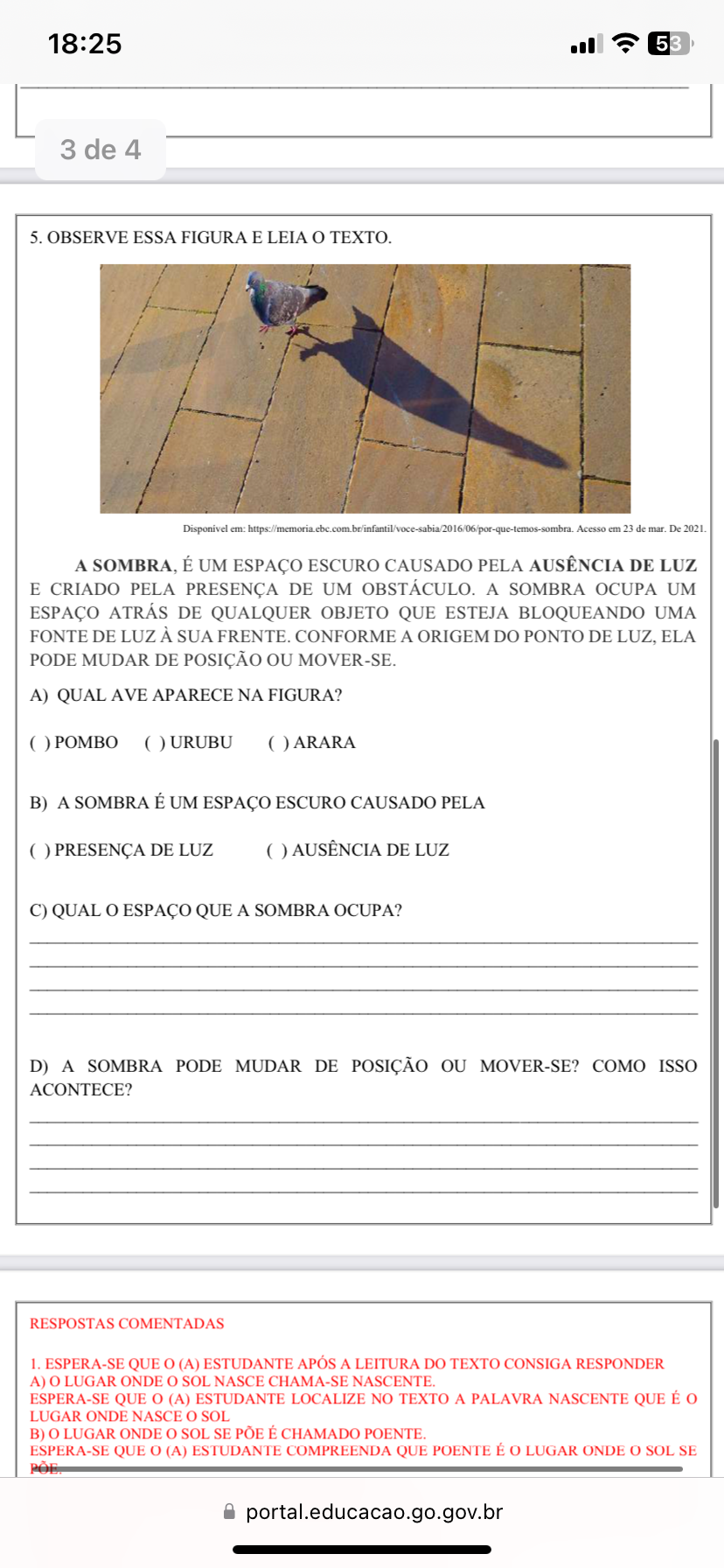 <p>18:25 5 3 de 4 5. OBSERVE ESSA FIGURA E LEIA TEXTO. Disponível em: Acesso em 23 de mar. De 2021. A SOMBRA, É UM ESPAÇO ESCURO CAUSADO PELA AUSÊNCIA DE LUZ E CRIADO PELA PRESENÇA DE UM A SOMBRA OCUPA UM ESPAÇO ATRÁS DE QUALQUER OBJETO QUE ESTEJA BLOQUEANDO UMA FONTE DE LUZ À SUA FRENTE. CONFORME A ORIGEM DO PONTO DE LUZ, ELA PODE MUDAR DE POSIÇÃO OU MOVER-SE. A) QUAL AVE APARECE NA FIGURA? ( ) POMBO ( ) URUBU ARARA B) A SOMBRA É UM ESPAÇO ESCURO CAUSADO PELA ( ) PRESENÇA DE LUZ ( ) AUSÊNCIA DE LUZ C) QUAL ESPAÇO QUE A SOMBRA OCUPA? D) A SOMBRA PODE MUDAR DE POSIÇÃO OU MOVER-SE? COMO ISSO ACONTECE? RESPOSTAS COMENTADAS 1. ESPERA-SE QUE (A) ESTUDANTE APÓS A LEITURA DO TEXTO CONSIGA RESPONDER A) LUGAR ONDE SOL NASCE CHAMA-SE ESPERA-SE QUE (A) ESTUDANTE LOCALIZE NO TEXTO A PALAVRA NASCENTE QUE É LUGAR ONDE NASCE SOL B) LUGAR ONDE O SOL SE É CHAMADO ESPERA-SE QUE O (A) ESTUDANTE COMPREENDA QUE POENTE É O LUGAR ONDE O SOL SE portal.educacao.go.gov.br</p>