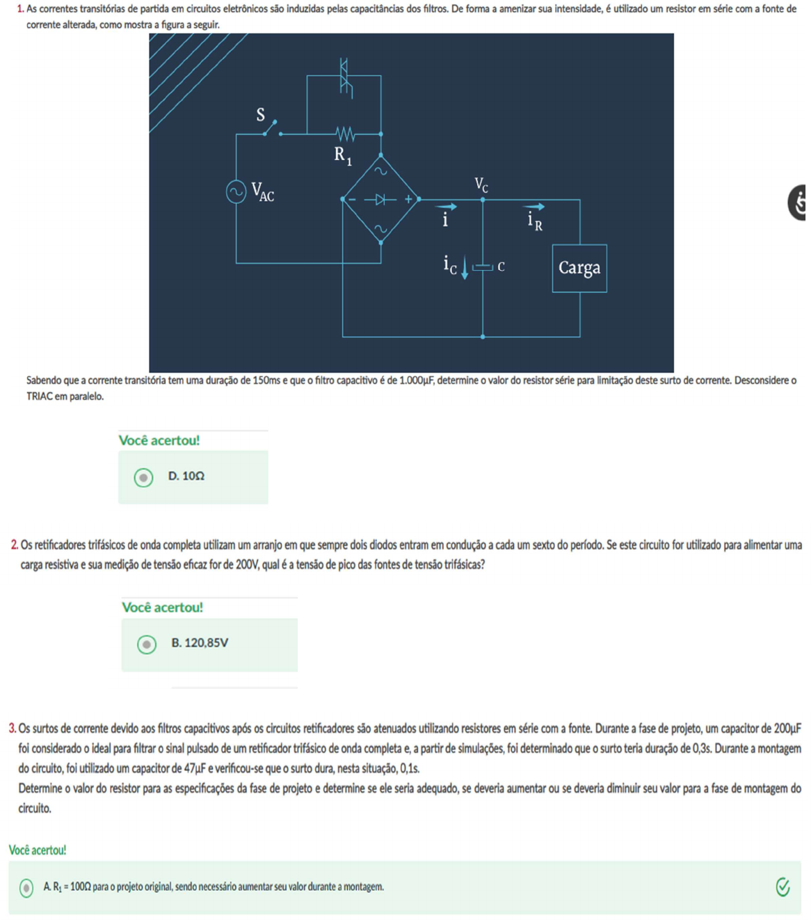<p>1. As correntes transitórias de partida em circuitos eletrônicos são induzidas pelas capacitâncias dos filtros. De forma a amenizar sua intensidade, é utilizado um resistor em série com a fonte de corrente alterada, como mostra a figura a seguir. S R VAC + i ic C Carga Sabendo que a corrente transitória tem uma duração de 150ms e que filtro capacitivo é de 1.000uF, determine valor do resistor série para limitação deste surto de corrente. Desconsidere TRIAC em paralelo. Você acertou! D. 100 2. Os retificadores trifásicos de onda completa utilizam um arranjo em que sempre dois diodos entram em condução a cada um sexto do período. Se este circuito for utilizado para alimentar uma carga resistiva e sua medição de tensão eficaz for de 200V, qual é a tensão de pico das fontes de tensão trifásicas? Você acertou! B. 120.85V 3. Os surtos de corrente devido aos filtros capacitivos após os circuitos retificadores são atenuados utilizando resistores em série com a fonte. Durante a fase de projeto, um capacitor de foi considerado 0 ideal para filtrar 0 sinal pulsado de um retificador trifásico de onda completa e, a partir de simulações, foi determinado que 0 surto teria duração de 0,3s. Durante a montagem do circuito, foi utilizado um capacitor de 47uF e verificou-se que 0 surto dura, nesta situação, 0,1s. Determine 0 valor do resistor para as especificações da fase de projeto e determine se ele seria adequado, se deveria aumentar ou se deveria diminuir seu valor para a fase de montagem do circuito Você acertou! A 1000 para 0 projeto original, sendo necessário aumentar seu valor durante a montagem.</p>