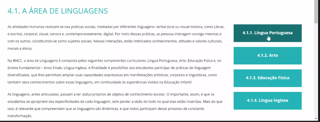 <p>4.1. A ÁREA DE LINGUAGENS As atividades humanas realizam-se nas práticas sociais, mediadas por diferentes linguagens: verbal (oral ou como Libras, e escrita), corporal, visual, sonora e, digital. Por meio dessas práticas, as pessoas interagem consigo mesmas e 4.1.1. Língua Portuguesa com os outros, constituindo-se como sujeitos Nessas estão imbricados conhecimentos, atitudes e valores culturais, morais e 4.1.2. Arte Na BNCC, a de Linguagens é composta pelos seguintes componentes curriculares: Lingua Arte, Educação Física e, no Ensino Fundamental Anos Finais, Língua A finalidade é possibilitar aos estudantes participar de práticas de linguagem diversificadas, que lhes permitam ampliar suas capacidades expressivas em manifestações corporais e linguísticas, como 4.1.3. Educação Física seus conhecimentos sobre essas linguagens, em continuidade às experiências vividas na Educação As linguagens, antes articuladas, passam a ter status próprios de objetos de conhecimento importante, assim, é que os estudantes se apropriem das especificidades de cada sem perder a visão do todo no qual elas estão Mais do que 4.1.4. Língua Inglesa isso, é relevante que compreendam que as linguagens são dinâmicas, e que todos participam desse processo de constante transformação.</p>