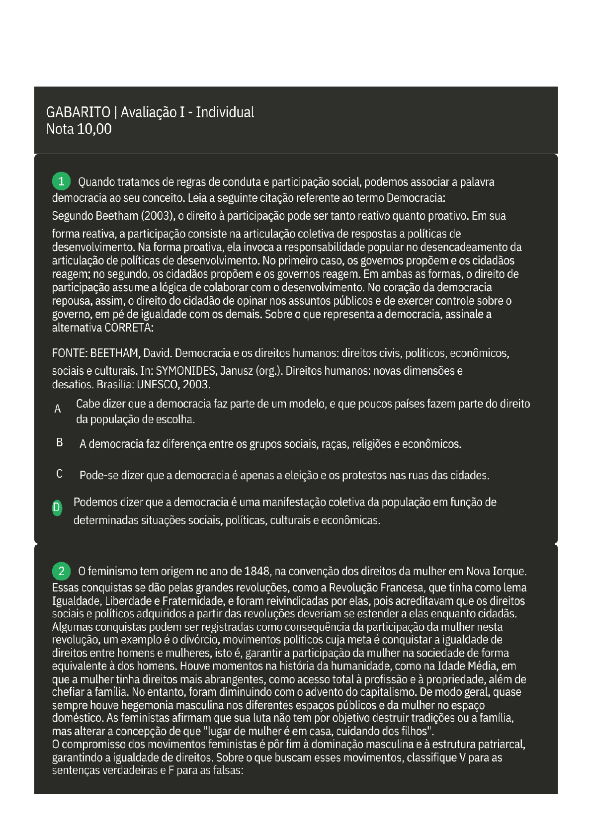 <p>GABARITO Avaliação I Individual Nota 10,00 1 Quando tratamos de regras de conduta e participação social, podemos associar a palavra democracia ao seu conceito. Leia a seguinte citação referente ao termo Democracia: Segundo Beetham (2003), direito à participação pode ser tanto reativo quanto proativo. Em sua forma reativa, a participação consiste na articulação coletiva de respostas a políticas de desenvolvimento. Na forma proativa, ela invoca a responsabilidade popular no desencadeamento da articulação de políticas de desenvolvimento. No primeiro caso, os governos propõem e os cidadãos reagem; no segundo, os cidadãos propõem e os governos reagem. Em ambas as formas, direito de participação assume a lógica de colaborar com desenvolvimento. No coração da democracia repousa, assim, direito do cidadão de opinar nos assuntos públicos e de exercer controle sobre governo, em pé de igualdade com os demais. Sobre que representa a democracia, assinale a alternativa CORRETA: FONTE: BEETHAM, David. Democracia e os direitos humanos: direitos civis, políticos, econômicos, sociais e culturais. In: SYMONIDES, Janusz (org.). Direitos humanos: novas dimensões e desafios. Brasília: UNESCO, 2003. A Cabe dizer que a democracia faz parte de um modelo, e que poucos países fazem parte do direito da população de escolha. B A democracia faz diferença entre os grupos sociais, raças, religiões e econômicos. C Pode-se dizer que a democracia é apenas a eleição e os protestos nas ruas das cidades. Podemos dizer que a democracia é uma manifestação coletiva da população em função de determinadas situações sociais, políticas, culturais e econômicas. 2 feminismo tem origem no ano de 1848, na convenção dos direitos da mulher em Nova Iorque. Essas conquistas se dão pelas grandes revoluções, como a Revolução Francesa, que tinha como lema Igualdade, Liberdade e Fraternidade, e foram reivindicadas por elas, pois acreditavam que os direitos sociais e políticos adquiridos a partir das revoluções deveriam se estender a elas enquanto Algumas conquistas podem ser registradas como consequência da participação da mulher nesta revolução, um exemplo é divórcio, movimentos políticos cuja meta é conquistar a igualdade de direitos entre homens e mulheres, isto é, garantir a participação da mulher na sociedade de forma equivalente à dos homens. Houve momentos na história da humanidade, como na Idade Média, em que a mulher tinha direitos mais abrangentes, como acesso total à profissão e à propriedade, além de chefiar a família. No entanto, foram diminuindo com advento do capitalismo. De modo geral, quase sempre houve hegemonia masculina nos diferentes espaços públicos e da mulher no espaço doméstico. As feministas afirmam que sua luta não tem por objetivo destruir tradições ou a família, mas alterar a concepção de que "lugar de mulher é em casa, cuidando dos filhos". compromisso dos movimentos feministas é pôr fim à dominação masculina e à estrutura patriarcal, garantindo a igualdade de direitos. Sobre que buscam esses movimentos, classifique V para as sentenças verdadeiras e F para as falsas:</p><p>() Direitos contratuais e de propriedade iguais entre homens e mulheres. () Direitos legais das mulheres, como votar, licença-maternidade, salários iguais aos dos homens. () Direitos de estudos e questionamento com relação à () A diversidade cultural e a diferença cultural entre machismo e feminismo. Assinale a alternativa que apresenta a sequência CORRETA: FONTE: Disponível em: Acesso em: 10 ago. 2015. A B C D 3 No multiculturalismo ocorre reconhecimento das diferenças, as quais coexistem em um mesmo país ou região. A convivência entre povos com diferentes culturas, valores e tradições contribuem para diálogo e para uma vida pacífica entre as diversas culturas. Sobre multiculturalismo, analise as sentenças a seguir: I- movimento multiculturalista surgiu em grande escala nas sociedades em que direito à diversidade cultural foi historicamente negado, por exemplo, no Estados Unidos. II- termo multiculturalismo é antigo, sua utilização ocorreu pela primeira vez na Inglaterra, no século VII. III- Direito à Diferença e a Diminuição das Desigualdades são temas centrais para multiculturalismo. IV- processo de colonização do Brasil e EUA favoreceu multiculturalismo, pois houve opressão das tribos indígenas que ali estavam. Assinale a alternativa CORRETA: A As sentenças II, III e IV estão corretas. B Somente a sentença I está correta. C As sentenças I e III estão corretas. D As sentenças II e IV estão corretas. 4 No Brasil, a partir do governo Lula e da entrada do PT no comando do país, terceiro setor ficou mais evidente. Tudo isso por conta da origem do partido, que surgiu de organizações sociais e por movimentos populares na época da ditadura. Os vínculos desse partido com os movimentos sociais influenciaram a supervalorização do terceiro setor, e colocou segundo setor como agente social de destaque. No Brasil, é algo relativamente "novo", que começou a aparecer com mais frequência a partir da década de 60. No entanto, nos últimos anos, tem ganhado uma importância ainda maior e, principalmente, apoio das empresas, que se mostram cada vez mais ligadas à responsabilidade social. No que se refere ao terceiro setor, analise as afirmativas a seguir:</p><p>I- Trabalho voluntário sem remuneração pelos serviços prestados. II- Não possui importância com fins lucrativos, mas apenas para sobreviver e reinvestir os valores sobressalentes. III- A gestão não pode sofrer interferência externa. IV- Foi criado para criar empregos com salários altos e que pouco auxiliam a população na parte social. Assinale a alternativa CORRETA: FONTE: Disponível em: Acesso em: 3 ago. 2015. A Somente a afirmativa IV está correta. B As afirmativas I e IV estão corretas. C As afirmativas I, II e III estão corretas. D