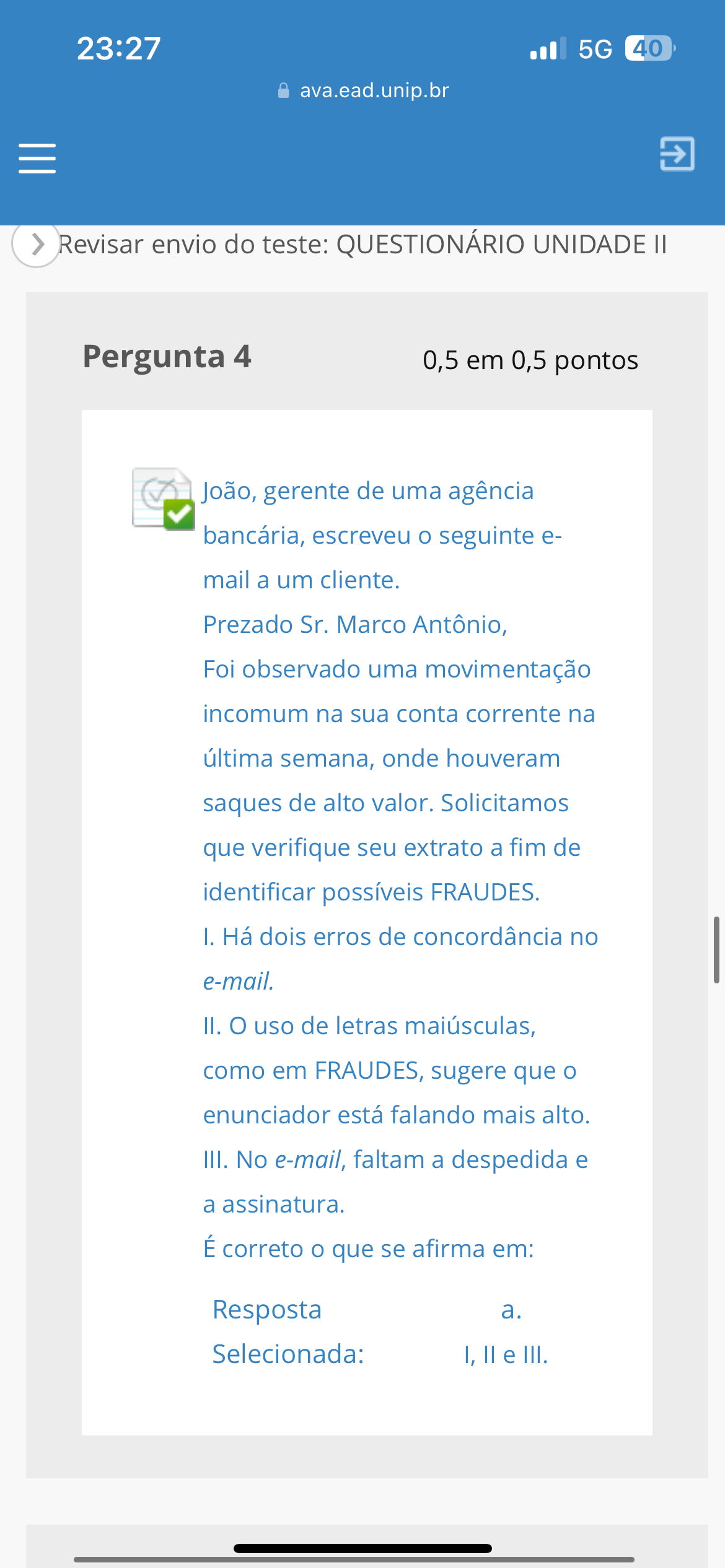 <p>23:27 5G 40 ava.ead.unip.br Revisar envio do teste: QUESTIONÁRIO UNIDADE Pergunta 4 0,5 em 0,5 pontos João, gerente de uma agência bancária, escreveu o seguinte e- mail a um cliente. Prezado Sr. Marco Antônio, Foi observado uma movimentação incomum na sua conta corrente na última semana, onde houveram saques de alto valor. Solicitamos que verifique seu extrato a fim de identificar possíveis I. Há dois erros de concordância no e-mail. II. uso de letras maiúsculas, como em FRAUDES, sugere que o enunciador está falando mais alto. III. No e-mail, faltam a despedida e a assinatura. É correto o que se afirma em: Resposta a. Selecionada: I, e III.</p>