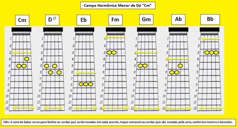 <p>Campo Harmônico Menor de "Cm" Cm Eb Fm Gm Ab Bb 2 2 2 3 3 5 5 5 5 7 7 7 7 7 & & 8 & 9 9 9 9 9 9 9 10 10 10 10 10 10 10 11 11 11 11 12 12 12 12 12 12 Obs: A seta de baixo serve para limitar as cordas que serão tocadas em cada acorde, toque somente as cordas que são tocadas pela seta, conforme mostra desenho.</p>