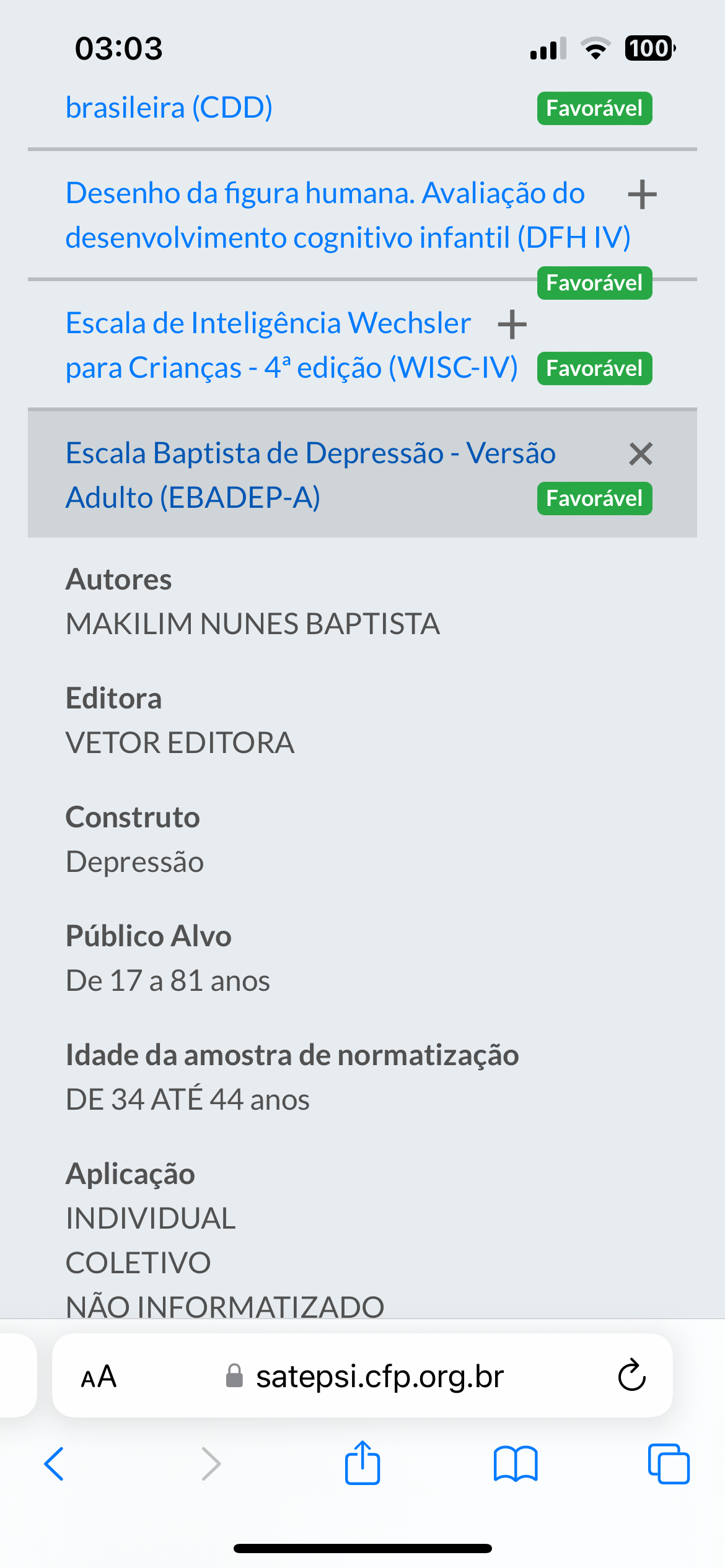 <p>03:03 100 brasileira (CDD) Favorável Desenho da figura humana. Avaliação do + desenvolvimento cognitivo infantil (DFH IV) Favorável Escala de Inteligência Wechsler + para Crianças - edição (WISC-IV) Favorável Escala Baptista de Depressão - Versão X Adulto (EBADEP-A) Favorável Autores MAKILIM NUNES BAPTISTA Editora VETOR EDITORA Construto Depressão Público Alvo De 17 a 81 anos Idade da amostra de normatização DE 34 ATÉ 44 anos Aplicação INDIVIDUAL COLETIVO NÃO INFORMATIZADO AA satepsi.cfp.org.br</p>