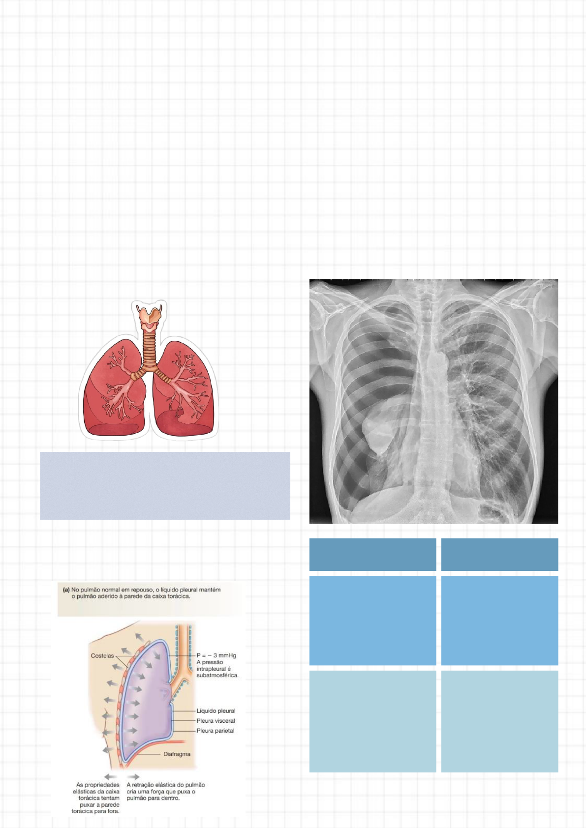 <p>Definição</p><p>AR PENETRA NO ESPAÇO PLEURAL VINDO DO PULMÃO OU</p><p>DA PAREDE TORÁCICA (FERIMENTO PENETRANTE)</p><p>FISIOLGICAMENTE – PRESSÃO INTRAPLEURAL É</p><p>SUBATMOSFÉRICA DEVIDO ÀS FORÇAS DE RETRAÇÃO</p><p>ELÁSTICA DO PULMÃO E DA PAREDE TORÁCICA. ↓</p><p>QUANDO O AR ENTRA NO ESPAÇO PLEURAL, A PRESS��O</p><p>INTRAPLEURAL AUMENTA, OS PULMÕES COLAPSAM, E O</p><p>GRADIL COSTAL É EMPURRADO PARA FORA.</p><p>Pneumotórax</p><p>PRESSÃO TRANSMURAL OU TRANSPULMONAR</p><p>↓</p><p>PA - PIP</p><p>SE A PIP SE APROXIMA DE 0 CMH2O SE PERDE A FORÇA QUE</p><p>MANTEM OS ALVÉOLOS ABERTOS E O GRADIL COSTA FIXADO</p><p>PRÓXIMO AOS PULMÕES</p><p>ESSAS ALTERAÇÕES FICAM EVIDENTES NA RADIOGRAFIA</p><p>TORÁCICA</p><p>↓</p><p>COLAPSO PULMONAR PARCIAL OU COMPLETO</p><p>HIPEREXPANSÃO DO GRADIL COSTAL REBAIXAMENTO</p><p>DIAFRAGMÁTICO NO LADO AFETADO. ALGUMAS VEZES,</p><p>PODE HAVER DESLOCAMENTO MEDIASTINAL PARA O LADO</p><p>CONTRALATERAL</p><p>ESPONTÂNEOS PRIMÁRIOS ESPONTÂNEO SECUNDÁRIOS</p><p>SE DESENVOLVE SEM QUALQUER</p><p>DOENÇA PULMONAR</p><p>PREDISPONENTE, TIPICAMENTE EM</p><p>HOMENS, JOVENS E ALTOS.</p><p>O PACIENTE TEM UMA DOENÇA</p><p>PULMONAR SUBJACENTE, COMO</p><p>DPOC, FIBROSE CÍSTICA OU</p><p>PNEUMONIA POR</p><p>PNEUMOCYSTIS (FUNGO)</p><p>CAUSADA PELA RUPTURA DE UMA</p><p>PEQUENA BOLHA NA SUPERFÍCIE</p><p>PULMONAR PRÓXIMO AO ÁPICE,</p><p>POSSIVELMENTE DEVIDO A</p><p>ESTRESSE MECÂNICO SIGNIFICATIVO</p><p>QUE OCORRE NA ZONA SUPERIOR</p><p>DO PULMÃO EM ORTOSTATISMO</p><p>TAMBÉM PODE OCORRER</p><p>DURANTE VENTILAÇÃO</p><p>MECÂNICA COM ALTAS</p><p>PRESSÕES NAS VIAS AÉREAS</p><p>PNEUMOTÓRAX ESPONTÂNEO</p><p>↓</p><p>O PNEUMOTÓRAX É REABSORVIDO GRADUALMENTE,</p><p>PORQUE A SOMA DAS PRESSÕES PARCIAIS NO SANGUE</p><p>VENOSO É BEM MENOR QUE A PRESSÃO ATMOSFÉRICA.</p><p>PODE HAVER NECESSIDADE DE DRENAGEM TORÁCICA PARA</p><p>A RESOLUÇÃO DE GRANDES PNEUMOTÓRAX OU EM</p><p>PACIENTES COM DOENÇA PULMONAR SUBJACENTE.</p><p>ASPIRAÇÃO SIMPLES – AGULHA RELATIVAMENTE PEQUENA</p><p>COM UM CATETER INTERNO DE POLIETILENO É INSERIDA</p><p>NO SEGUNDO ESPAÇO INTERCOSTAL ANTERIOR NA LINHA</p><p>CLAVICULAR MÉDIA APÓS ANESTESIA LOCAL. UMA VÁLVULA</p><p>COM TORNEIRA DE TRÊS VIAS E UMA SERINGA DE 60 ML</p><p>SÃO FIXADAS AO CATETER. O AR É EXTRAÍDO</p><p>MANUALMENTE ATÉ NÃO SER POSSÍVEL MAIS ASPIRÁ-LO.</p><p>TORACOSTOMIA COM DRENO - INSERÇÃO DE UM TUBO</p><p>ATRAVÉS DA PAREDE TORÁCICA E A CONEXÃO DO TUBO EM</p><p>SELO D’ÁGUA, PERMITINDO QUE O AR ESCAPE DO TÓRAX</p><p>SEM QUE HAJA NOVA ENTRADA DE AR.</p><p>PLEURODESE - TRATAMENTO CIRÚRGICO, COM O OBJETIVO</p><p>DE PROMOVER A ADESÃO ENTRE AS DUAS SUPERFÍCIES</p><p>PLEURAIS</p><p>CUIDADOS: QUANDO HÁ DRENO TORÁCICO, DEVE-SE TER</p><p>CUIDADOS COMO MEDIR O DÉBITO, OBSERVAR O ASPECTO</p><p>DO LÍQUIDO DRENADO, VERIFICAR OSCILAÇÃO, NÃO FIXAR</p><p>O SISTEMA NA CAMA, NÃO PINÇAR E NÃO LEVANTAR O</p><p>FRASCO.</p><p>Pneumotórax Hipertensivo</p><p>OCORRE EM UMA PEQUENA PROPORÇÃO DOS</p><p>PNEUMOTÓRAX, QUANDO A COMUNICAÇÃO ENTRE O</p><p>PULMÃO E O ESPAÇO PLEURAL AGE COMO UMA</p><p>VÁLVULA.</p><p>↓</p><p>O AR ENTRA NO ESPAÇO PLEURAL DURANTE A</p><p>INSPIRAÇÃO, MAS NÃO CONSEGUE SAIR NA EXPIRAÇÃO</p><p>↓</p><p>GRANDE PNEUMOTÓRAX, NO QUAL A PRESSÃO PODE</p><p>EXCEDER EM MUITO A ATMOSFÉRICA, INTERFERINDO</p><p>NO RETORNO VENOSO PARA O TÓRAX</p><p>VEDAÇÃO DO ORÍFICIO NO PULMÃO</p><p>DOR PLEURÍTICA UNILATERALMENTE, EM GERAL</p><p>SÚBITA, ACOMPANHADA POR DISPNEIA</p><p>AUSCULTA - RUÍDOS RESPIRATÓRIOS ESTÃO REDUZIDOS</p><p>NO LADO ACOMETIDO.</p><p>DIAGNÓSTICO - CONFIRMADO PELA RADIOGRAFIA DE</p><p>TÓRAX.</p><p>SINAIS E SINTOMAS</p><p>• PIORA DO SOFRIMENTO RESPIRATÓRIO,</p><p>• TAQUICARDIA,</p><p>• VEIAS CERVICAIS DISTENDIDAS</p><p>• SINAIS DE DESLOCAMENTO MEDIASTINAL PARA O</p><p>LADO OPOSTO AO PNEUMOTÓRAX TRATAMENTO</p><p>• ALÍVIO URGENTE DA PRESSÃO POR MEIO DA</p><p>INSERÇÃO DE UMA AGULHA ATRAVÉS DA PAREDE</p><p>TORÁCICA NO LADO AFETADO E UMA DRENAGEM</p><p>TORÁCICA POSTERIORMENTE.</p><p>TRATAMENTO</p><p>ALÍVIO URGENTE DA PRESSÃO POR MEIO DA INSERÇÃO</p><p>DE UMA AGULHA ATRAVÉS DA PAREDE TORÁCICA NO</p><p>LADO AFETADO E UMA DRENAGEM TORÁCICA</p><p>POSTERIORMENTE.</p><p>SINTOMAS</p><p>PNEUMOTÓRAX</p><p>DOR TORÁCICA/DOR PLEURÍTICA - A</p><p>PLEURA PARIETAL É DOTADA DE</p><p>INERVAÇÃO SENSITIVA E SUA</p><p>IRRITAÇÃO PROVOCA DOR, ESSA</p><p>AUMENTA COM A INSPIRAÇÃO</p><p>TREPOPNEIA: APARECE EM DECÚBITO</p><p>LATERAL, COMO ACONTECE COM O</p><p>PACIENTE COM DERRAME PLEURAL</p><p>QUE SE DEITA SOBRE O LADO SÃO</p><p>DERRAME PLEURAL</p><p>DOR TORÁCICA/DOR PLEURÍTICA</p><p>UNILATERALMENTE</p><p>DISPNEIA</p><p>HIPERTENSIVO – TAQUICARDIA E</p><p>VEIAS CERVICAIS DISTENDIDAS</p><p>PNEUMOTÓRAX</p><p>REDUZIDA DO LADO AFETADO</p><p>AUSÊNCIA DE MURMÚRIO VESICULAR</p><p>DERRAME PLEURAL</p><p>HIPEREXPANSÃO DO GRADIL COSTAL</p><p>DO LADO AFETADO</p><p>RUÍDOS RESPIRATÓRIOS ESTÃO</p><p>REDUZIDOS NO LADO ACOMETIDO.</p><p>CIFOESCOLIOSE Avaliação Fisioterapia</p><p>Função Pulmonar</p><p>PNEUMOTÓRAX</p><p>↓</p><p>REDUZ O VEF1 E A CVF</p><p>PORÉM - OS TESTES DE FUNÇÃO PULMONAR SÃO</p><p>RARAMENTE REALIZADOS NA AVALIAÇÃO DE DISPNEIA</p><p>AGUDA E NÃO SERIAM USADOS PARA O DIAGNÓSTICO DE</p><p>PNEUMOTÓRAX.</p><p>DEFORMIDADES ÓSSEAS TORÁCICAS PODEM CAUSAR</p><p>DOENÇA RESTRITIVA</p><p>• ESCOLIOSE - CURVATURA LATERAL DA COLUNA</p><p>• CIFOSE - CURVATURA POSTERIOR.</p><p>SINAIS E SINTOMAS RESPIRATÓRIOS:</p><p>• INICIAL - DISPNEIA DURANTE O EXERCÍCIO E TAQUIPNEIA</p><p>SUPERFICIAL.</p><p>• MAIS TARDE - HIPOXEMIA, E O PACIENTE AINDA PODE</p><p>APRESENTAR HIPERCAPNIA E COR PULMONALE.</p><p>• FUNÇÃO PULMONAR - REDUÇÃO DE TODOS OS VOLUMES</p><p>PULMONARES.</p><p>• PARTES DO PULMÃO SÃO COMPRIMIDAS, E</p><p>FREQUENTEMENTE OCORREM ÁREAS DE ATELECTASIA.</p><p>• INEFICIÊNCIA DA MUSCULATURA RESPIRATÓRIA.</