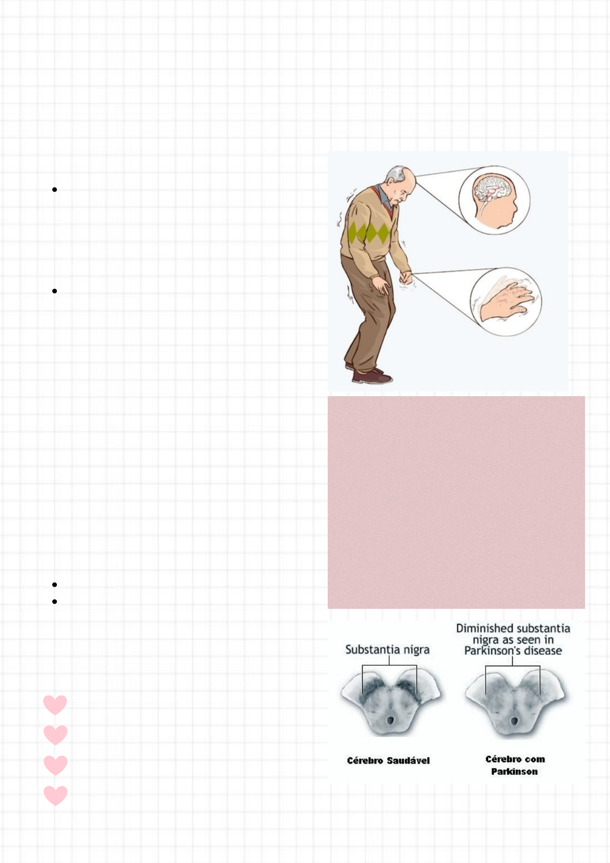 <p>Definição</p><p>É UMA SÍNDROME CLÍNICA DEGENERATIVA E</p><p>PROGRESSIVA DO SISTEMA NERVOSO CENTRAL QUE</p><p>PROVOCA DESORDENS DO MOVIMENTO, DEVIDO À</p><p>DEFICIÊNCIA DE DOPAMINA NA VIA NEGRO-ESTRIATAL</p><p>DO CÉREBRO (UMPHRED, D. 1994);</p><p>“GRUPO DE DISTÚRBIOS CARACTERIZADOS POR</p><p>TREMOR, PERTURBAÇÃO DO MOVIMENTO</p><p>VOLUNTÁRIO, DA POSTURA E EQUILÍBRIO” (STOKES, M.</p><p>2000)</p><p>ETIOLOGIA</p><p>O DIAGNÓSTICO DO TEA É FEITO POR PROFISSIONAIS DE</p><p>SAÚDE ESPECIALIZADOS, COMO PSICÓLOGOS E</p><p>PSIQUIATRAS, POR MEIO DA OBSERVAÇÃO DOS SINTOMAS E</p><p>DA AVALIAÇÃO DO DESENVOLVIMENTO DA CRIANÇA. É</p><p>IMPORTANTE BUSCAR UM DIAGNÓSTICO PRECOCE PARA</p><p>QUE INTERVENÇÕES E SUPORTES ADEQUADOS POSSAM SER</p><p>OFERECIDOS.</p><p>INCIDÊNCIA</p><p>AFETA 1 EM CADA 1000 PESSOAS,</p><p>SINTOMAS SURGINDO, FREQUENTEMENTE, AO REDOR</p><p>DOS 60 ANOS (MAIOR PREVALÊNCIA NA POPULAÇÃO</p><p>IDOSA).</p><p>Parkinson</p><p>Principais Sintomas</p><p>BRADICINESIA (LENTIFICAÇÃO DOS MOVIMENTOS)</p><p>RIGIDEZ CRÔNICA</p><p>TREMOR EM REPOUSO</p><p>INSTABILIDADE POSTURAL</p><p>FISIOPATOLOGIA DA LESÃO</p><p>DEGENERAÇÃO DOS NEURÔNIOS MIELINIZADOS DA</p><p>SUBSTÂNCIA NEGRA</p><p>↓</p><p>ALTERAÇÕES BIOQUÍMICAS QUE ACARRETAM REDUÇÃO DE</p><p>DOPAMINA</p><p>↓</p><p>PREJUÍZO AO EQUILÍBRIO DOS EVENTOS INIBITÓRIOS E</p><p>EXCITATÓRIOS QUE PERMITEM A MANUTENÇÃO DA</p><p>POSTURA E DO MOVIMENTO.</p><p>DIAGNÓSTICO</p><p>PREDOMINANTEMENTE CLÍNICO:</p><p>HISTÓRIA</p><p>EXAME FÍSICO</p><p>PODE SER USADO ESCALAS PARA AVALIAR A</p><p>DOENÇA:</p><p>ALTERAÇÃO NO GATILHO DO ATO MOTOR;</p><p>DISCINESIAS E ASCINESIAS.Núcleos da Base</p><p>CONJUNTO DE CORPOS DE NEURÔNIOS SITUADOS</p><p>EM ÁREAS SUBCORTICAIS (ABAIXO DO CÓRTEX).</p><p>PARTICIPAM NO CONTROLE DO MOVIMENTO:</p><p>NO PLANEJAMENTO DO MOVIMENTO E NÃO DA</p><p>EXECUÇÃO.</p><p>ENVOLVIDO EM COMPORTAMENTOS MOTORES E</p><p>COGNITIVOS.</p><p>NÃO SE CONECTA DIRETAMENTE COM MEDULA E</p><p>NERVOS PERIFÉRICOS.</p><p>ALTERAÇÕES NOS NÚCLEOS DA BASE</p><p>❏ DISTÚRBIOS MOTORES:</p><p>❏ FLUTUAÇÃO DO TÔNUS;</p><p>❏ HIPERTONIA PLÁSTICA;</p><p>❏ MOVIMENTOS INCOORDENADOS:</p><p>❏ CORÉICOS</p><p>❏ ATETÓIDES</p><p>❏ DISTÔNICOS</p><p>ALTERAÇÃO NA POSTURA;</p><p>ALTERAÇÃO NO CONTROLE E CESSAÇÃO DE</p><p>MOVIMENTOS AUTOMÁTICOS;</p><p>AVALIAÇÃO DA CONDIÇÃO CLÍNICA GERAL;</p><p>AVALIAÇÃO DE INCAPACIDADES E FUNÇÕES MOTORAS,</p><p>AVALIAÇÃO MENTAL</p><p>AVALIAÇÃO DE QUALIDADE DE VIDA.</p><p>Características Clinicas</p><p>TREMOR DE REPOUSO (DISTAL);</p><p>RIGIDEZ PLÁSTICA (AUMENTO TÔNUS);</p><p>BRADICINESIA E HIPOCINESIA;</p><p>POSTURA EM FLEXÃO (INÍCIO NO BRAÇO E</p><p>DISSEMINADO PELO CORPO);</p><p>DISTÚRBIOS DE EQUILÍBRIO;</p><p>ALTERAÇÕES NO PROCESSAMENTO DOS ESTÍMULOS</p><p>SENSORIAIS (SISTEMA VESTIBULAR E</p><p>PROPRIOCEPTIVO)</p><p>PERDA DE REFLEXOS POSTURAIS (OCASIONA</p><p>QUEDAS, DIFICULDADE DE FICAR EM PÉ);</p><p>FENÔMENO DO CONGELAMENTO (INCAPACIDADE</p><p>TRANSITÓRIA DE EXECUTAR MOVIMENTOS ATIVOS,</p><p>PODE ATINGIR PERNAS, PÁLPEBRAS, FALA E</p><p>ESCRITA);</p><p>ALTERAÇÕES NAS REAÇÕES ADAPTATIVAS;</p><p>DIFICULDADE NOS MOVIMENTOS FINOS;</p><p>MARCHA COMPROMETIDA:FESTINANTE, EM BLOCO,</p><p>PEQUENOS PASSOS (PETIT PAS).</p><p>CLASSIFICAÇÃO DA INCAPACIDADE, SEGUNDO</p><p>ESCALA DE GRAUS DE INCAPACIDADE DE</p><p>HOEHN E YAHR</p><p>ESTÁGIO INICIAL (I E II):</p><p>COMPLETA FUNCIONALIDADE, PODENDO O PACIENTE</p><p>APRESENTAR TREMOR E RIGIDEZ UNILATERAL;</p><p>ESTÁGIO MODERADO (III):</p><p>SINTOMAS BILATERAIS, BRADICINESIA, RIGIDEZ,</p><p>ALTERAÇÃO DA POSTURA E MARCHA;</p><p>ESTÁGIO GRAVE (IV E V):</p><p>COMPROMETIMENTO INTENSO, DEPENDENTE NAS</p><p>AVD’S.</p><p>Conduta Terapeutica</p><p>Objetivos</p><p>FALA TORNA-SE MONÓTONA E MENOS ARTICULADA;</p><p>LAPSOS DE MEMÓRIA, DIFICULDADE DE</p><p>CONCENTRAÇÃO,IRRITABILIDADE E DEPRESSÃO.</p><p>ALTERAÇÕES EMOCIONAIS E DÉFICITS COGNITIVOS.</p><p>OUTROS SINTOMAS</p><p>ESTRATÉGIAS DE MOVIMENTOS</p><p>PROGRAMA PREVENTIVO DE EXERCÍCIOS</p><p>AVALIAÇÃO FUNCIONAL;</p><p>ORGANIZAR AS INFORMAÇÕES E AS ATIVIDADES</p><p>SERIADAS</p><p>❏ DIMINUIR A RIGIDEZ TÔNICA;</p><p>❏ DIMINUIR TREMOR;</p><p>❏ DESCARGA DE PESO;</p><p>❏ MELHORAR EQUILÍBRIO NAS DIFERENTES POSTURAS;</p><p>❏ MANTER ADM E MOBILIDADE;</p><p>❏ AVD´S E QUALIDADE DE VIDA;</p><p>Tratamento</p><p>MEDICAMENTOSO:</p><p>SELEGILINA, AMARITADINA, ANTICOLINÉRGICOS,</p><p>LEVODOPA, AGONISTAS DOPAMINÉRGICOS.</p><p>PROCEDIMENTOS CIRÚRGICOS;</p><p>FISIOTERAPIA!!!!</p><p>MANTER SUA INDEPENDÊNCIA O MAIOR TEMPO</p><p>POSSÍVEL</p><p>ESTÁGIO INICIAL:</p><p>PREVENÇÃO, ANTECEDER AS PERDAS</p><p>PROGRESSIVAS;</p><p>ORIENTAÇÕES E POSICIONAMENTOS;</p><p>EXERCÍCIOS DE RESISTÊNCIA;</p><p>ALONGAMENTOS ESPECÍFICOS;</p><p>PISTAS AUDITIVAS, TÁTEIS;</p><p>ESTÁGIO INTERMEDIÁRIO:</p><p>EXERCÍCIOS CORRETIVOS;</p><p>PROMOÇÃO DE ADM;</p><p>CONSCIÊNCIA CORPORAL;</p><p>PISTAS VISUAIS, TÁTEIS E AUDITIVAS;</p><p>ESTABILIZAÇÃO E CO-CONTRAÇÃO DE</p><p>ARTICULAÇÕES PROXIMAIS;</p><p>MARCHA;</p><p>PADRÃO DA MARCHA</p><p>ABEÇA E TRONCO ANTERIORIZADOS, DESLOCANDO</p><p>CENTRO DE GRAVIDADE PARA FRENTE</p><p>MMSS: OMBRO, COTOVELO E PUNHO EM FLEXÃO</p><p>MMII: EXTENSÃO REDUZIDA EM QUADRIL, JOELHO E</p><p>TORNOZELO</p><p>MOVIMENTOS DE PELVE E TRONCO REDUZIDOS</p><p>COMPRIMENTO DOS PASSOS E OSCILAÇÃO DOS</p><p>BRAÇOS DIMINUÍDOS</p><p>MARCHA LENTA E ARRASTADA</p><p>ACELERAÇÃO INVOLUNTÁRIA, HESITAÇÃO PARA</p><p>INICIAR E CONGELAMENTO FRENTE AOS OBSTÁCULOS</p><p>MARCHA FESTINADA, EM BLOCO E PETIT-PASS</p><p>OBJETIVOS:</p><p>AUMENTO DOS MOVIMENTOS LATERAIS E</p><p>DISSOCIATIVOS DO TRONCO</p><p>MELHORA DA OSCILAÇÃO DOS BRAÇOS</p><p>AMPLIAÇÃO DA BASE DE SUSTENTAÇÃO</p><p>AMPLIAÇÃO DA PASSADA</p><p>PERDA DE AUTOMATISMOS</p><p>CONDUTA</p><p>MARCAÇÃO DO PISO, USO DE BLOCOS E BASTÕES NO</p><p>CHÃO (OBSTÁCULOS)</p><p>BASTÕES