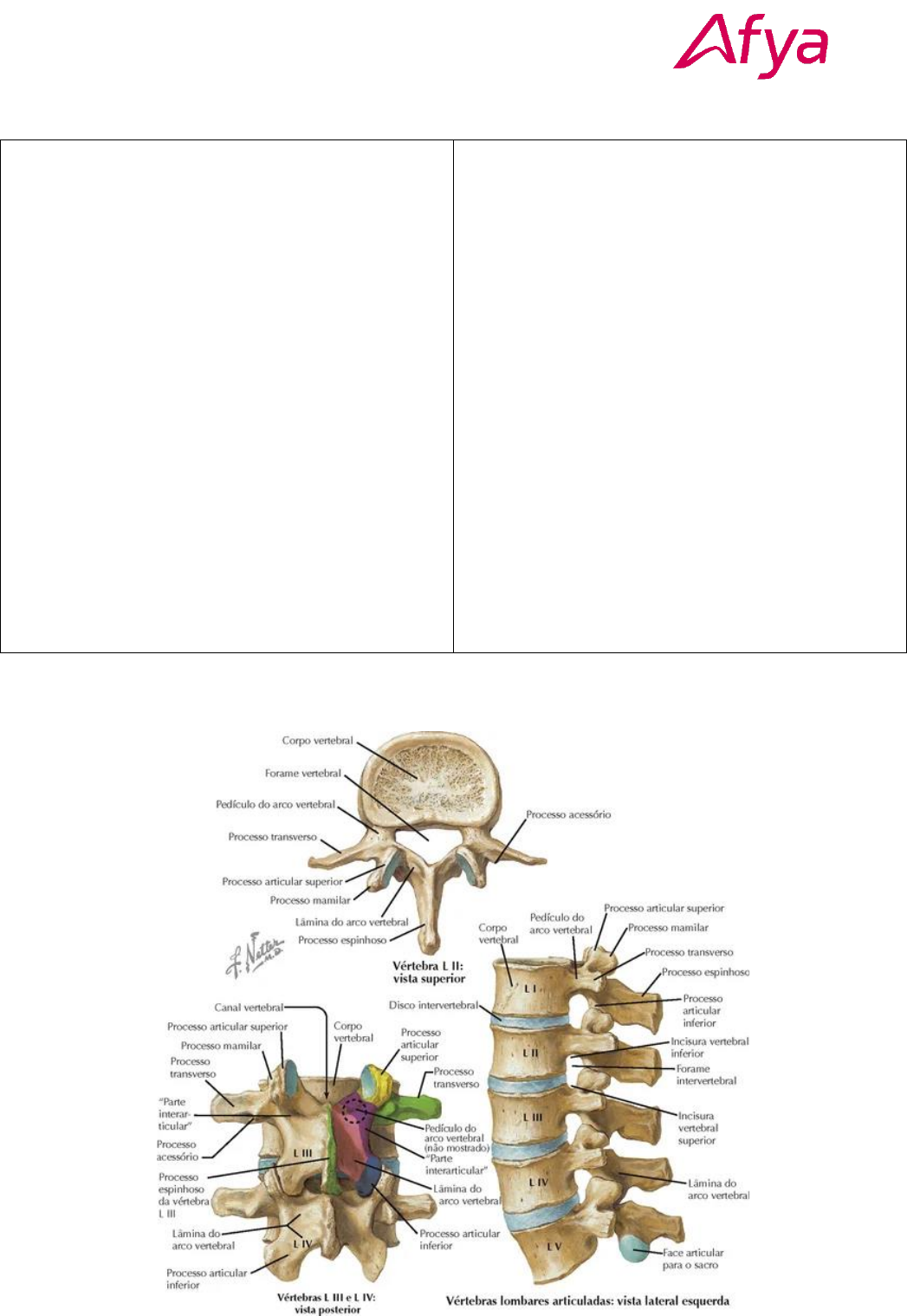 <p>CURSO DE MEDICINA</p><p>Sistemas orgânicos Integrados II (SOI II) – Práticas Integradas</p><p>Roteiro de Anatomia – Aula 2</p><p>• Deve-se identificar:</p><p>o Elementos de uma vértebra padrão</p><p>▪ corpo vertebral</p><p>▪ processo transverso</p><p>▪ processo espinhoso</p><p>▪ processo articular (superior e</p><p>inferior)</p><p>▪ pedículo</p><p>▪ lâmina</p><p>o Disco intervertebral</p><p>o Forame intervertebral</p><p>o Canal vertebral</p><p>o Vertebra C-I (Atlas)</p><p>▪ Tubérculo anterior</p><p>▪ Arco vertebral anterior</p><p>▪ Tubérculo posterior</p><p>▪ Arco vertebral posterior</p><p>▪ Face articular superior para o</p><p>côndilo occipital</p><p>▪ Processo transverso</p><p>▪ Forame transverso</p><p>▪ Forame vertebral</p><p>o Vértebra C-II (Áxis)</p><p>▪ Dente do áxis</p><p>▪ Corpo vertebral</p><p>▪ Processo espinhoso</p><p>▪ Face articular superior para o</p><p>atlas</p><p>▪ Processo transverso</p><p>▪ Forame transverso</p><p>o Vértebras C-VI e C-II</p><p>▪ Corpo vertebral</p><p>▪ Processo espinhoso</p><p>▪ Processo articular superior</p><p>▪ Processo articular inferior</p><p>▪ Processo transverso</p><p>▪ Forame transverso</p><p>▪ Lâmina</p><p>▪ Pedículo</p><p>Deve-se identificar:</p><p>o Divisões da coluna vertebral</p><p>▪ cervical</p><p>▪ torácica</p><p>▪ lombar</p><p>▪ sacral</p><p>▪ coccígea</p><p>o Curvaturas da coluna vertebral</p><p>▪ Lordose cervical</p><p>▪ Cifose torácica</p><p>▪ Lordose lombar</p><p>▪ Cifose sacrococcígea</p><p>o Vértebras</p><p>▪ Vértebras cervicais (C-I a C-VII)</p><p>▪ Vértebras torácicas (T-I a T-XII)</p><p>▪ Vértebras lombares (L-I a L-V)</p><p>▪ Vértebras sacrais (S-I a S-V)</p><p>▪ Vértebras coccígeas (Co-I a Co-III)</p><p>o Nervos espinhais</p><p>▪ Nervos cervicais (C-1 a C-8)</p><p>▪ Nervos torácicas (T-1 a T-12)</p><p>▪ Nervos lombares (L-1 a L-5)</p><p>▪ Nervos sacrais (S-1 a S-5)</p><p>▪ Nervos coccígeas (1 par)</p><p>o Cone medular</p><p>o Cauda equina</p><p>o Plexos de nervos</p><p>▪ Plexos de nervos espinhais</p><p>▪ Plexo cervical</p><p>▪ Plexo braquial</p><p>▪ Plexo lombar</p><p>▪ Plexo sacral</p><p>• Deve-se identificar:</p><p>o Intumescências (Imagem anterior)</p><p>▪ Cervical</p><p>▪ Lombossacral</p><p>o Sulcos e fissura</p><p>▪ Fissura mediana anterior</p><p>▪ Sulco mediano posterior</p><p>▪ Sulco lateral anterior</p><p>▪ Sulco lateral posterior</p><p>▪ Sulco intermédio</p><p>o Funículos</p><p>▪ Anterior</p><p>▪ Lateral</p><p>▪ Posterior</p><p>• Fascículo grácil</p><p>• Fascículo cuneiforme</p><p>o Canal central da medula</p><p>o Substância cinzenta</p><p>▪ Corno anterior</p><p>▪ Corno posterior</p><p>▪ Corno lateral (se houver na peça)</p><p>▪ Comissura branca</p><p>o Característica do nervo espinhal</p><p>▪ Raiz anterior</p><p>▪ Raiz posterior</p><p>▪ Gânglio da raiz posterior</p><p>▪ Radículas da raiz anterior</p><p>▪ Radículas da raiz posterior</p><p>BIBLIOGRAFIAS CONSULTADAS</p><p>Básica</p><p>• NETTER, Frank H. Netter Atlas de Anatomia Humana - Abordagem Topográfica Clássica. Rio de Janeiro: Grupo GEN, 2024. E-book. ISBN</p><p>9788595159891. Disponível em: https://integrada.minhabiblioteca.com.br/#/books/9788595159891/. Acesso em: 19 ago. 2024.</p><p>• WASCHKE, Jens. Sobotta Anatomia Clínica. Rio de Janeiro: Grupo GEN, 2018. E-book. ISBN 9788595151536. Disponível em:</p><p>https://integrada.minhabiblioteca.com.br/#/books/9788595151536/. Acesso em: 19 ago. 2024.</p><p>Imagens complementares</p><p>• Adaptado de KENHUB</p>