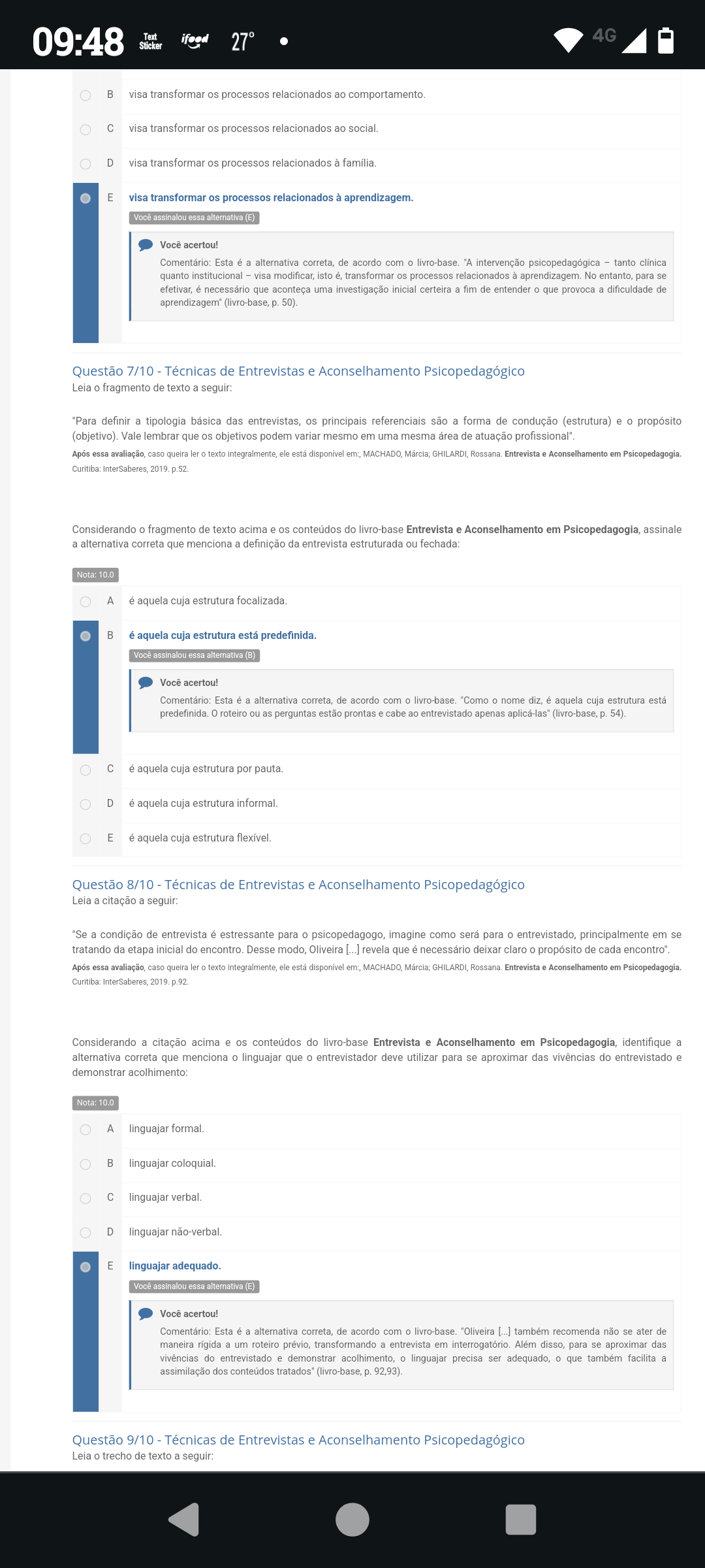 <p>09:48 Text Sticke 4G B visa transformar os processos relacionados ao comportamento. visa transformar os processos relacionados ao social. D visa transformar os processos relacionados à família. E visa transformar os processos relacionados à Você assinalou essa alternativa (E) Você acertou! Comentário: Esta é a alternativa correta, de acordo com "A intervenção psicopedagógica tanto clínica quanto institucional - visa isto é transformar os processos relacionados à aprendizagem No para se efetivar, é necessário que aconteça uma investigação inicial certeira a fim de entender que provoca a dificuldade de (livro-base, p. 50) Questão 7/10 Técnicas de Entrevistas e Aconselhamento Psicopedagógico Leia o fragmento de texto a seguir: "Para definir a tipologia básica das entrevistas, os principais referenciais são a forma de condução (estrutura) e o propósito Vale lembrar que os objetivos podem variar mesmo em uma mesma área de atuação Após essa caso queira ler texto integralmente, ele está disponível em: MACHADO Márcia GHILARDI, Entrevista e Aconselhamento em Curitiba .52 Considerando o fragmento de texto acima e os conteúdos do livro-base Entrevista e Aconselhamento em Psicopedagogia, assinale a alternativa correta que menciona a definição da entrevista estruturada ou Nota: 10.0 A é aquela cuja estrutura B é aquela cuja estrutura está predefinida. Você assinalou essa alternativa (B) Você acertou! Esta é a alternativa correta, de acordo com "Como nome diz é aquela cuja estrutura está predefinida. roteiro ou as perguntas estão prontas e cabe ao entrevistado apenas (livro-base, p. 54) C é aquela cuja estrutura por pauta. D é aquela cuja estrutura informal E é aquela cuja estrutura Questão 8/10 Técnicas de Entrevistas e Aconselhamento Psicopedagógico Leia a citação a seguir: "Se a condição de entrevista é estressante para o imagine como será para entrevistado, principalmente em se tratando da etapa inicial do encontro. Desse modo, Oliveira [...] revela que é necessário deixar claro o propósito de cada Após essa caso queira ler texto integralmente, ele está disponível MACHADO GHILARDI, Entrevista e Aconselhamento em Psicopedagogia Curitiba InterSaberes, 2019 p.92 Considerando a citação acima e os conteúdos do livro-base Entrevista e Aconselhamento em Psicopedagogia, identifique a alternativa correta que menciona o linguajar que o entrevistador deve utilizar para se aproximar das do entrevistado e demonstrar acolhimento: Nota: A linguajar B linguajar C linguajar D linguajar E linguajar adequado. Você assinalou essa alternativa (E) Você acertou! Esta é a alternativa correta, de acordo com o "Oliveira [...] também recomenda não se ater de maneira a um roteiro prévio, transformando a entrevista em interrogatório. Além disso, para se aproximar das vivências do entrevistado e demonstrar acolhimento, o linguajar precisa ser adequado, que também facilita a assimilação dos conteúdos (livro-base, p 92,93) Questão 9/10 Técnicas de Entrevistas e Aconselhamento Psicopedagógico Leia trecho de texto a seguir:</p>