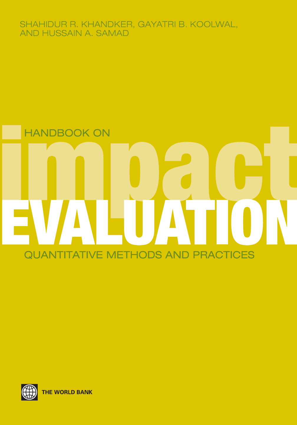 <p>P</p><p>ub</p><p>lic</p><p>D</p><p>is</p><p>cl</p><p>os</p><p>ur</p><p>e</p><p>A</p><p>ut</p><p>ho</p><p>riz</p><p>ed</p><p>P</p><p>ub</p><p>lic</p><p>D</p><p>is</p><p>cl</p><p>os</p><p>ur</p><p>e</p><p>A</p><p>ut</p><p>ho</p><p>riz</p><p>ed</p><p>P</p><p>ub</p><p>lic</p><p>D</p><p>is</p><p>cl</p><p>os</p><p>ur</p><p>e</p><p>A</p><p>ut</p><p>ho</p><p>riz</p><p>ed</p><p>P</p><p>ub</p><p>lic</p><p>D</p><p>is</p><p>cl</p><p>os</p><p>ur</p><p>e</p><p>A</p><p>ut</p><p>ho</p><p>riz</p><p>ed</p><p>wb350881</p><p>Typewritten Text</p><p>52099</p><p>wb350881</p><p>Typewritten Text</p><p>Handbook on Impact</p><p>Evaluation</p><p>Handbook on Impact</p><p>Evaluation</p><p>Quantitative Methods and Practices</p><p>Shahidur R. Khandker</p><p>Gayatri B. Koolwal</p><p>Hussain A. Samad</p><p>© 2010 The International Bank for Reconstruction and Development / The World Bank</p><p>1818 H Street NW</p><p>Washington DC 20433</p><p>Telephone: 202-473-1000</p><p>Internet: www.worldbank.org</p><p>E-mail: feedback@worldbank.org</p><p>All rights reserved</p><p>1 2 3 4 13 12 11 10</p><p>This volume is a product of the staff of the International Bank for Reconstruction and Development / The World</p><p>Bank. The fi ndings, interpretations, and conclusions expressed in this volume do not necessarily refl ect the views</p><p>of the Executive Directors of The World Bank or the governments they represent.</p><p>The World Bank does not guarantee the accuracy of the data included in this work. The boundaries, colors,</p><p>denominations, and other information shown on any map in this work do not imply any judgement on the part of</p><p>The World Bank concerning the legal status of any territory or the endorsement or acceptance of such boundaries.</p><p>Rights and Permissions</p><p>The material in this publication is copyrighted. Copying and/or transmitting portions or all of this work without</p><p>permission may be a violation of applicable law. The International Bank for Reconstruction and Development /</p><p>The World Bank encourages dissemination of its work and will normally grant permission to reproduce portions</p><p>of the work promptly.</p><p>For permission to photocopy or reprint any part of this work, please send a request with complete information</p><p>to the Copyright Clearance Center Inc., 222 Rosewood Drive, Danvers, MA 01923, USA; telephone: 978-750-8400;</p><p>fax: 978-750-4470; Internet: www.copyright.com.</p><p>All other queries on rights and licenses, including subsidiary rights, should be addressed to the Offi ce</p><p>of the Publisher, The World Bank, 1818 H Street NW, Washington, DC 20433, USA; fax: 202-522-2422; e-mail:</p><p>pubrights@worldbank.org.</p><p>ISBN: 978-0-8213-8028-4</p><p>eISBN: 978-0-8213-8029-1</p><p>DOI: 10.1596/978-0-8213-8028-4</p><p>Library of Congress Cataloging-in-Publication Data</p><p>Khandker, Shahidur R. Handbook on impact evaluation : quantitative methods and practices / Shahidur R.</p><p>Khandker, Gayatri B. Koolwal, Hussain A. Samad.</p><p>p. cm.</p><p>Includes bibliographical references and index.</p><p>ISBN 978-0-8213-8028-4 — ISBN 978-0-8213-8029-1 (electronic)</p><p>1. Economic development projects—Evaluation. 2. Economic assistance—Evaluation.</p><p>I. Koolwal, Gayatri B. II. Samad, Hussain A., 1963- III. Title.</p><p>HD75.9.K52 2009</p><p>338.90072—dc22</p><p>2009020886</p><p>Cover design by Patricia Hord.Graphik Design.</p><p>v</p><p>Contents</p><p>Foreword ................................................................................................................................xiii</p><p>Preface ..................................................................................................................................xv</p><p>About the Authors ......................................................................................................................... xvii</p><p>Abbreviations ................................................................................................................................ xix</p><p>Part 1 Methods and Practices ................................................................................... 1</p><p>1. Introduction..............................................................................................................3</p><p>References .......................................................................................................6</p><p>2. Basic Issues of Evaluation ....................................................................................7</p><p>Summary ........................................................................................................7</p><p>Learning Objectives .......................................................................................7</p><p>Introduction: Monitoring versus Evaluation ...............................................8</p><p>Monitoring .....................................................................................................8</p><p>Setting Up Indicators within an M&E Framework ......................................9</p><p>Operational Evaluation ...............................................................................16</p><p>Quantitative versus Qualitative Impact Assessments .................................18</p><p>Quantitative Impact Assessment: Ex Post versus Ex Ante</p><p>Impact Evaluations ...................................................................................... 20</p><p>The Problem of the Counterfactual ............................................................22</p><p>Basic Theory of Impact Evaluation: The Problem of Selection Bias .........25</p><p>Different Evaluation Approaches to Ex Post Impact Evaluation ...............27</p><p>Overview: Designing and Implementing Impact Evaluations ..................28</p><p>Questions .....................................................................................................29</p><p>References ..............................................