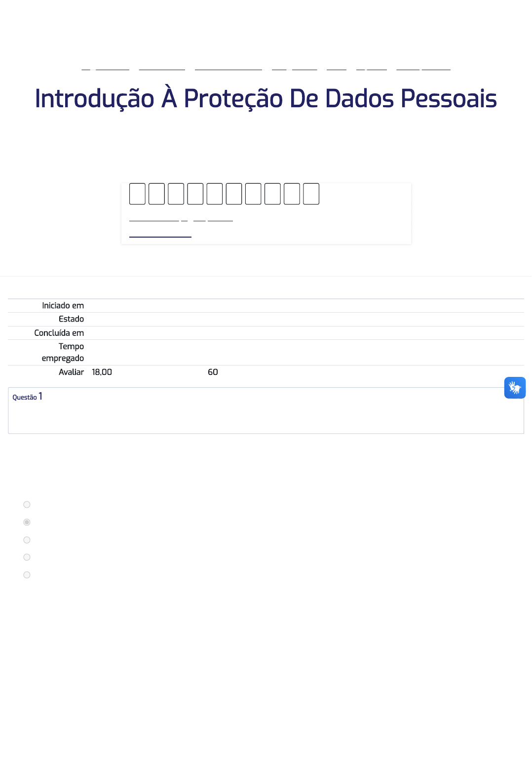 <p>Página inicial / Meus cursos / Cursos a Distância / Obrigatórios / LGPD / Tópico 2 / Avaliação - m2</p><p>Introdução À Proteção De Dados Pessoais</p><p>Mostrar uma página por vez</p><p>Terminar revisão</p><p>1 2 3 4 5 6 7 8 9 10</p><p>Iniciado em terça-feira, 10 set. 2024, 16:37</p><p>Estado Finalizada</p><p>Concluída em terça-feira, 10 set. 2024, 17:08</p><p>Tempo</p><p>empregado</p><p>31 minutos 42 segundos</p><p>Avaliar 18,00 de um máximo de 30,00(60%)</p><p>Questão 1</p><p>Correto</p><p>Atingiu 3,00 de 3,00</p><p>Identi�que a alternativa que representa fases do ciclo de vida do tratamento de dado pessoal:</p><p>Escolha uma opção:</p><p>a. Processamento e Transferência.</p><p>b. Coleta e Compartilhamento. </p><p>c. Coleta e Transmissão.</p><p>d. Coleta e Classi�cação.</p><p>e. Compartilhamento e Produção.</p><p>Sua resposta está correta.</p><p>As fase do ciclo de vida de tratamento de dados pessoais são: Coleta, Retenção, Processamento, Compartilhamento e</p><p>Eliminação.</p><p>Lembrando que Classi�cação, Compartilhamento, Transmissão, Produção e Transferência representam operações de</p><p>tratamento dos dados pessoais (LGPD, art. 5º, X).</p><p>A resposta correta é: Coleta e Compartilhamento.</p><p>10/09/2024, 17:10 Avaliação - m2: Revisão da tentativa | EBSERH</p><p>https://moodle.ebserh.gov.br/mod/quiz/review.php?attempt=457845&cmid=1183 1/7</p><p>https://moodle.ebserh.gov.br/</p><p>https://moodle.ebserh.gov.br/my/courses.php</p><p>https://moodle.ebserh.gov.br/course/index.php?categoryid=26</p><p>https://moodle.ebserh.gov.br/course/index.php?categoryid=30</p><p>https://moodle.ebserh.gov.br/course/view.php?id=101</p><p>https://moodle.ebserh.gov.br/course/view.php?id=101#section-2</p><p>https://moodle.ebserh.gov.br/mod/quiz/view.php?id=1183</p><p>https://moodle.ebserh.gov.br/mod/quiz/review.php?attempt=457845&cmid=1183&showall=0</p><p>https://moodle.ebserh.gov.br/mod/quiz/view.php?id=1183</p><p>Questão 2</p><p>Correto</p><p>Atingiu 3,00 de 3,00</p><p>Questão 3</p><p>Incorreto</p><p>Atingiu 0,00 de 3,00</p><p>Indique a alternativa que apresenta operação de tratamento de dados pessoais relacionada com a fase do ciclo de vida de</p><p>tratamento de dados pessoais denominada COMPARTILHAMENTO.</p><p>Escolha uma opção:</p><p>a. Recepção.</p><p>b. Transmissão. </p><p>c. Extração.</p><p>d. Utilização.</p><p>e. Reprodução.</p><p>Sua resposta está correta.</p><p>As operações de tratamento de dados pessoais relacionadas com a fase COMPARTILHAMENTO são: Transmissão, distribuição,</p><p>comunicação, transferência e difusão.</p><p>A resposta correta é: Transmissão.</p><p>As fases do ciclo de vida dos documentos de arquivo são:</p><p>Escolha uma opção:</p><p>a. Produção, Compartilhamento e Eliminação. </p><p>b. Produção, Retenção e Eliminação.</p><p>c. Produção, Utilização e Destinação Final.</p><p>d. Produção, Retenção e Processamento.</p><p>e. Produção, Processamento e Eliminação.</p><p>Sua resposta está incorreta.</p><p>As fases do ciclo de vida dos documentos de arquivos são: Produção, Utilização e Destinação Final.</p><p>As demais fases apresentadas nessa questão referem-se ao ciclo de vida do tratamento de dados pessoais.</p><p>A resposta correta é: Produção, Utilização e Destinação Final.</p><p>10/09/2024, 17:10 Avaliação - m2: Revisão da tentativa | EBSERH</p><p>https://moodle.ebserh.gov.br/mod/quiz/review.php?attempt=457845&cmid=1183 2/7</p><p>Questão 4</p><p>Correto</p><p>Atingiu 3,00 de 3,00</p><p>Questão 5</p><p>Correto</p><p>Atingiu 3,00 de 3,00</p><p>Em relação ao ciclo de vida dos documentos de arquivos, identi�que qual alternativa descreve a fase PRODUÇÃO:</p><p>Escolha uma opção:</p><p>a. Qualquer operação que envolva classi�cação, utilização, reprodução, processamento, avaliação ou controle da</p><p>informação, extração e modi�cação de dados pessoais.</p><p>b. Qualquer operação que envolva transmissão, distribuição, comunicação, transferência, difusão e compartilhamento</p><p>de dados pessoais.</p><p>c. Operações referentes à elaboração de documentos em razão da execução das atividades de um órgão ou</p><p>entidade.</p><p></p><p>d. Obtenção, recepção ou produção de dados pessoais independente do meio utilizado (documento em papel,</p><p>documento eletrônico, sistema de informação etc.).</p><p>e. Arquivamento ou armazenamento de dados pessoais independente do meio utilizado (documento em papel,</p><p>documento eletrônico, banco de dados, arquivo de aço etc.).</p><p>Sua resposta está correta.</p><p>A fase PRODUÇÃO do ciclo de vida de dos documentos é descrita como: Operações referentes à elaboração de documentos</p><p>em razão da execução das atividades de um órgão ou entidade.</p><p>As demais descrições desta questão são de fases relacionadas com o ciclo de vida de dados pessoais.</p><p>A resposta correta é: Operações referentes à elaboração de documentos em razão da execução das atividades de um órgão ou</p><p>entidade.</p><p>Identi�que a alternativa que consta a de�nição do ativo organizacional “Documento”:</p><p>Escolha uma opção:</p><p>a. É uma coleção de dados logicamente relacionados, com algum signi�cado.</p><p>b. Objeto ou conjunto de objetos necessário para o exercício de uma atividade ou de uma função.</p><p>c. Unidade de registro de informações, qualquer que seja o suporte e formato. </p><p>d. Unidade de registro de informações no formato eletrônico.</p><p>e. Qualquer aplicação, software ou solução de TI que esteja envolvida com as fases do ciclo de vida do tratamento dos</p><p>dados pessoais.</p><p>Sua resposta está correta.</p><p>De�nição do ativo organizacional “Documento”: Unidade de registro de informações, qualquer que seja o suporte e formato.</p><p>Essa é a de�nição adotada pelo Dicionário Brasileiro de