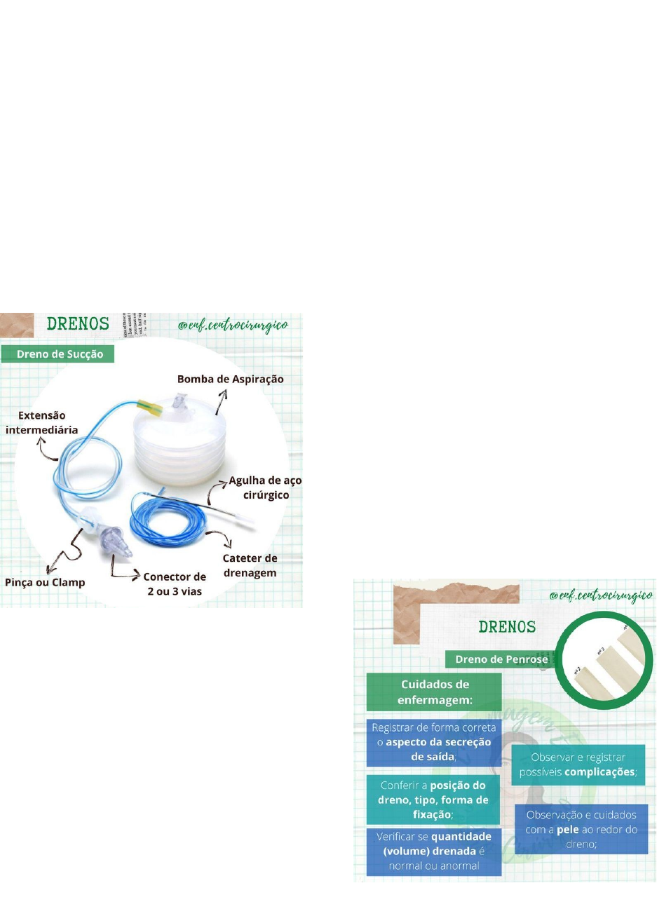 <p>1. Drenos e Seus Tipos</p><p>1. Dreno de Tórax (Portovac, Bulb):</p><p>· Função: Utilizado para remover fluidos (sangue, pus, ou outros líquidos) ou ar do espaço pleural, restaurando a pressão negativa nos pulmões.</p><p>· Indicação: Pós-cirurgia torácica (como ressecção pulmonar), trauma torácico, pneumotórax.</p><p>Dreno de Portovac</p><p>· Mecanismo de Funcionamento:</p><p>O dreno cria uma sucção para remover o ar ou fluido acumulado.</p><p>Normalmente é conectado a um sistema de três câmaras: uma de coleta, uma de selagem de água (para prevenir o retorno de ar) e uma de controle de sucção.</p><p>· Cuidados de Enfermagem:</p><p>· Monitorar a quantidade, cor e consistência do líquido drenado (sangue claro, seroso, purulento).</p><p>· Garantir que o sistema esteja sempre abaixo do nível do tórax.</p><p>· Verificar a integridade do sistema de sucção e selagem de água, evitando que o ar retorne para a cavidade pleural.</p><p>· Realizar a troca do curativo estéril, verificando sinais de infecção no local de inserção.</p><p>· Complicações: Deslocamento do dreno, obstrução, infecção, pneumotórax persistente.</p><p>2. Dreno de Penrose:</p><p>· Função: Utilizado para drenar passivamente líquidos de feridas ou cavidades corporais, permitindo que o fluido siga seu caminho natural para fora do corpo.</p><p>· Indicação: Feridas abertas, cirurgias abdominais, drenagem de abscessos superficiais.</p><p>· Cuidados de Enfermagem:</p><p>· Manter o local do dreno limpo e trocar curativos com frequência para evitar contaminação.</p><p>· Inspecionar o local de inserção para verificar a saída de fluidos e garantir que não haja obstruções.</p><p>· Reforçar a fixação para evitar deslocamento.</p><p>· Complicações: Risco de infecção se não mantido adequadamente.</p><p>3. Dreno de Blake:</p><p>· Função:Um dreno de silicone que promove drenagem com baixa pressão negativa, utilizado principalmente em cirurgias torácicas e abdominais.</p><p>· Indicação:Pós-operatório em cirurgias cardíacas ou torácicas.</p><p>· Mecanismo de Funcionamento:</p><p>Conectado a um sistema de drenagem fechado para evitar infecções, com baixa sucção para remoção suave de fluidos.</p><p>· Cuidados de Enfermagem:</p><p>· Verificar a permeabilidade do dreno e observar o volume de saída.</p><p>· Garantir a integridade do sistema fechado e monitorar sinais de infecção.</p><p>· Manter curativo estéril no local de inserção.</p><p>4. Dreno Jackson-Pratt (JP):</p><p>· Função: Um dreno de sucção que remove fluidos de feridas ou cavidades após cirurgias.</p><p>· Indicação: Usado após cirurgias abdominais, mamárias ou outras intervenções em que há acúmulo de líquidos.</p><p>· Mecanismo de Funcionamento:</p><p>· O dreno é conectado a uma bolha de compressão que cria pressão negativa para "sugar" os líquidos.</p><p>· Cuidados de Enfermagem:</p><p>· Comprimir a bolha para garantir a criação de sucção adequada.</p><p>· Monitorar a quantidade e a natureza do fluido drenado (sangue, seroso).</p><p>· Manter curativos limpos e inspecionar o local de inserção.</p><p>5. Dreno Redon:</p><p>· Função: Utilizado principalmente em cirurgias plásticas e ortopédicas, associado à drenagem de sangue e fluidos serosos.</p><p>· Mecanismo de Funcionamento:</p><p>Um sistema fechado com sucção.</p><p>· Cuidados de Enfermagem:</p><p>· Verificar a saída de fluido e a permeabilidade do dreno.</p><p>· Garantir que o dreno não esteja dobrado ou obstruído.</p><p>· Inspecionar o local de inserção diariamente e trocar os curativos conforme necessário.</p><p>2. Sondas</p><p>1. Sonda Nasogástrica (SNG):</p><p>· Função:Usada para drenagem gástrica (remoção de conteúdo gástrico) ou para alimentação enteral em pacientes que não conseguem se alimentar oralmente.</p><p>· Tipos de Sonda Nasogástrica</p><p>· Sonda de Levine: É uma das mais usadas, existindo no mercado tanto tubos de plástico como de borracha, com orifícios laterais próximos à ponta; são passadas normalmente pelas narinas. Apresenta uma única luz (números 14 a 18).</p><p>· Sonda gástrica simples (“Salem-VENTROL”):</p><p>É uma sonda radiopaca, de plástico claro, dotada de duas luzes. É usada para descomprimir o estômago e mantê-lo vazio;</p><p>· Sonda Nutriflex:</p><p>É uma sonda usada para nutrição. Possui 76 cm de comprimento e uma ponta pesada de mercúrio para facilitar sua inserção. É protegida por um lubrificante que é ativado quando é umidificado;</p><p>· Sonda de MOSS:</p><p>É uma sonda de descompressão gástrica de 90 cm de comprimento, três luzes e somente um balão que serve para fixar a sonda ao estômago quando inflado. O cateter de descompressão serve para aspiração gástrica e esofágica, como também para lavagem. A terceira luz é uma via para alimentação duodenal;</p><p>· Sonda S-B:</p><p>É usada para tratar sangramento de varizes esofagianas. Tem 3 luzes e 2 balões; duas das luzes são utilizadas para inflar os balões, enquanto a terceira é usada para lavagem gástrica e para monitorizar o sangramento.</p><p>· Indicação:</p><p>Pacientes com obstrução intestinal, sangramento gastrointestinal, ou necessidade de nutrição enteral.</p><p>· Cuidados de Enfermagem:</p><p>· Verificar o posicionamento correto através de ausculta ou radiografia para evitar aspiração pulmonar.</p><p>· Manter a sonda limpa e desobstruída, realizando lavagens periódicas com solução salina.</p><p>· Monitorar sinais de desconforto do paciente (náusea, dor, vômito).</p><p>· Manter a cabeça do paciente elevada para evitar aspiração.</p><p>2. Sonda de Foley (Vesical):</p><p>· Função: Usada para drenagem contínua de urina da bexiga.</p><p>· Indicação: Pacientes com retenção urinária, incontinência ou após cirurgias abdominais.</p><p>· Cuidados de Enfermagem:</p><p>· Assepsia rigorosa ao m