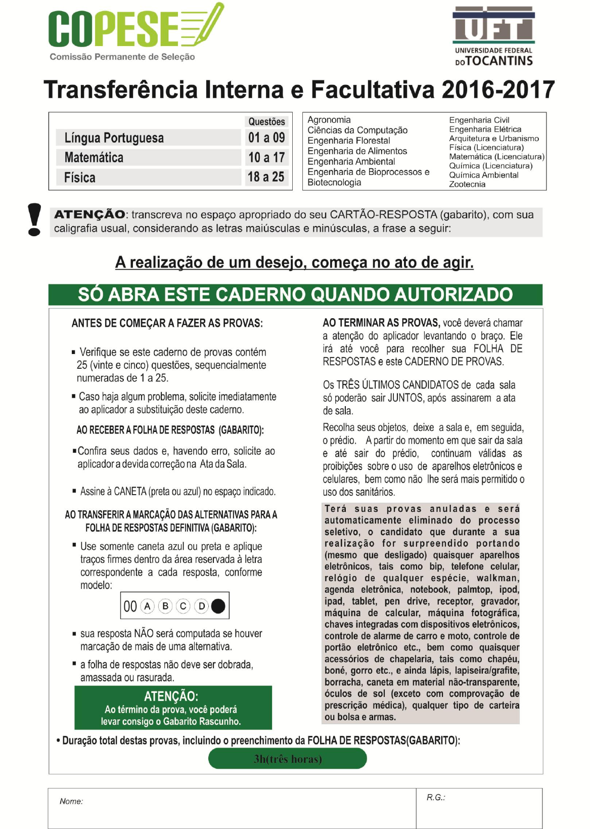 <p>UFT/COPESE</p><p>TRANSFERÊNCIA INTERNA E EXTERNA</p><p>2016-2017</p><p>1 Prova de conhecimentos</p><p>UFT/COPESE</p><p>TRANSFERÊNCIA INTERNA E EXTERNA</p><p>2016-2017</p><p>2 Prova de conhecimentos</p><p>PROVA DE LÍNGUA PORTUGUESA</p><p>Leia o texto I a seguir para responder as questões de 1 a 6.</p><p>Como e por que as línguas mudam?</p><p>Na natureza, a mudança é sempre imperceptível. Num</p><p>universo em que o comportamento dos seres é regido por leis</p><p>físicas ou genéticas, prevalece o determinismo do instinto.</p><p>Assim, a natureza parece funcionar sempre da mesma</p><p>maneira, os fenômenos seguindo sua ordem natural, sem</p><p>exceção. O que distingue o homem dos outros seres vivos é a</p><p>capacidade de modificar a natureza com seu trabalho</p><p>transformador. O homem foi o único animal capaz de criar</p><p>diferentes modos de vida, distintas civilizações, de se adaptar a</p><p>todos os habitats oferecidos pela natureza, além de ser o único</p><p>animal a produzir história. No mundo natural, a mudança</p><p>temporal é medida em termos de milhares ou milhões de anos,</p><p>o que nos dá a falsa impressão de permanência e perenidade.</p><p>Já os fatos sociais e as criações intelectuais evoluem a uma</p><p>velocidade às vezes assustadora.</p><p>A língua foi chamada por Roland Barthes de sistema</p><p>modelizante primário por ser o primeiro e principal instrumento</p><p>de comunicação e do pensamento de que dispomos. Segundo</p><p>os linguistas americanos Edward Sapir e Benjamin Lee Whorf,</p><p>ela é também o filtro através do qual homem vê e pensa o</p><p>mundo à sua volta e assim se dá conta de sua própria</p><p>experiência. Para os adeptos do relativismo linguístico, a língua</p><p>impõe a seus falantes uma visão de mundo que condiciona os</p><p>comportamentos psíquicos e sociais dos indivíduos. Contudo, a</p><p>capacidade humana de transformar o meio social e de explorar</p><p>a natureza conduz o tempo todo a uma nova realidade, que</p><p>obriga o homem a uma nova visão de mundo, levando a novas</p><p>apreensões e novos tratamentos do continuum que são os</p><p>dados da experiência, o que força a língua a mudar para poder</p><p>continuar dando conta dessa realidade e servindo de</p><p>instrumento da comunicação e do pensamento.</p><p>Num jogo dialético, a língua muda para conservar-se e só se</p><p>conserva na medida em que muda. Assim como para</p><p>conservar uma casa é preciso submetê-la a periódicas</p><p>reformas, a língua precisa adaptar-se constantemente às</p><p>necessidades de comunicação da comunidade falante. Se não</p><p>mudasse, em pouco tempo estaria divorciada da sociedade a</p><p>que deve servir. Em resumo, a língua evolui porque funciona e</p><p>funciona porque evolui: é o uso da linguagem que produz sua</p><p>mudança, e é esse permanente mudar que garante a</p><p>continuidade de seu funcionamento.</p><p>Fonte: BIZZOCCHI, Aldo. Como e por que as línguas mudam? In: Revista</p><p>Língua Portuguesa. Disponível em:</p><p>http://conhecimentopratico.uol.com.br/linguaportuguesa/gramatica-</p><p>ortografia/60/artigo374133-1.asp. Acesso em: 24 nov. 2016 (fragmento</p><p>adaptado).</p><p>QUESTÃO 01</p><p>Sobre os fatos contidos no primeiro parágrafo, assinale a</p><p>alternativa CORRETA quanto à interpretação do texto.</p><p>(A) As mudanças ocorridas na natureza são sempre visíveis,</p><p>pois obedecem às leis físicas e às leis genéticas.</p><p>(B) As leis genéticas são as que determinam o</p><p>comportamento humano, independentemente de aspectos</p><p>sociais.</p><p>(C) Na natureza e na sociedade, as mudanças ocorrem de</p><p>forma rápida, fornecendo a impressão de imutabilidade.</p><p>(D) A natureza e os fatos sociais possuem temporalmente</p><p>evoluções distintas. A primeira segue leis próprias,</p><p>enquanto os fatos sociais estão ligados à capacidade do</p><p>homem em modificar sua realidade.</p><p>(E) O homem, assim como a natureza, segue leis instintivas</p><p>para alcançar a evolução.</p><p>QUESTÃO 02</p><p>Tendo em vista que o autor considera a “língua” como fator</p><p>influenciado pelo meio social, assinale a alternativa CORRETA.</p><p>(A) O autor estabelece que a língua é imutável, pois se</p><p>adapta às necessidades de comunicação.</p><p>(B) A língua deve se manter constante para a manutenção</p><p>dos fatos sociais.</p><p>(C) A continuidade do funcionamento da língua está</p><p>dissociada da comunidade dos falantes.</p><p>(D) A língua traduz a visão de mundo dos falantes e, dessa</p><p>forma, dentro de uma comunidade, ela se apresenta</p><p>estável ao longo dos anos.</p><p>(E) A língua modifica-se de acordo com a realidade da</p><p>comunidade, para continuar servindo aos propósitos de</p><p>seus falantes.</p><p>QUESTÃO 03</p><p>O texto apresenta um caráter associativo entre os conceitos de</p><p>“língua” (meio social) e de “natureza” (meio biológico/genético).</p><p>Assinale a alternativa CORRETA que traduz as intenções do</p><p>autor.</p><p>(A) Destacar que a língua e a natureza evoluem na mesma</p><p>velocidade.</p><p>(B) Demonstrar que a língua possui características sociais,</p><p>além de biológicas, uma vez que ela muda, ao longo do</p><p>tempo, adaptando-se às necessidades de dada</p><p>sociedade.</p><p>(C) Estabelecer aspectos distintos entre língua e natureza,</p><p>uma vez que a língua é puramente biológica, enquanto a</p><p>natureza segue leis próprias de evolução,</p><p>independentemente de fatores sociais.</p><p>(D) Evidenciar que as evoluções ocorridas na natureza e na</p><p>língua estão ligadas aos fatores biológicos que</p><p>necessitam da interferência direta do homem.</p><p>(E) Provar que o conceito de “língua” é inferior ao de</p><p>“natureza”, pois a última é regida por leis físicas e</p><p>genéticas.</p><p>QUESTÃO 04</p><p>Sobre os aspectos gramaticas, marq