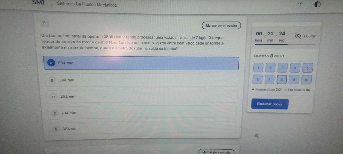 <p>Sistemas De Fluidos Mecânicos T 8 Marcar para revisão Um bomba industrial irá operar a 3800 visando processar uma vazão mássica de 7 kg/s. o torque 00 22 24 : Ocultar requerido no eixo do rotor é de Considerando que entre com velocidade uniforme e hora min seg axialmente no rotor da bomba, qual diâmetro do rotor na da bomba? Questão 8 de 10 A 584 mm 1 2 3 4 5 B 384 mm 7 8 9 10 Respondidas (10) Em branco 484 mm Finalizar prova D 784 mm E 684 mm Marcar para revisão</p><p>SMT Sistemas De Fluidos Mecânicos T 7 Marcar para revisão 00 22 35 Água é escoada com uma vazão de 0,028 através de uma bomba centrifuga contendo um rotor com 40 : Ocultar hora min seg mm de na entrada e 150 mm de na Na as pás do rotor são radiais e a velocidade da água nesse ponto é de 3,5 m/s o torque requerido nesse processo para uma rotação de 4000 rpm Questão 7 de 10 A 96 N.m 1 2 3 4 5 B 86 N.m 6 7 9 10 Respondidas (10) Em branco 66 N.m Finalizar prova D 106 N.m E 76 N.m</p><p>Sistemas De Fluidos Mecânicos T 00 21 55 10 Marcar para revisão : : Ocultar hora min seg Um admitido axialmente no rotor de uma bomba centrifuga. o torque gerado no eixo do rotor é de 75 N.m. A vazão volumétrica do escoamento é de e a massa do fluido é de 980 Se Questão 10 de 10 o raio do rotor na saida for de 520 mm, qual valor da rotação? 1 2 3 4 5 A 1068 rpm. 6 7 8 9 10 B 1058 rpm. Respondidas (10) Em branco (o) Finalizar prova C 1038 1048 rpm. E 1081 rpm.</p><p>SMT Sistemas De Fluidos Mecânicos T 3 00 23 24 Marcar para revisão : : Ocultar hora min seg As máquinas são elementos mecânicos criados pela humanidade com o objetivo de realizar um árduo, que realizado de forma em multos casos, seria praticamente Observe estas afirmações sobre as máquinas de Questão 3 de 10 1. equipamentos que realizam a conversão de energia um fluido como meio de interação. componente responsável por interagir com fluido chamado de 1 2 3 4 5 III. Podem ser classificadas entre e máquinas Estão corretas, as 6 7 8 g 10 Respondidas (10) Em branco (o) A e III. Finalizar prova B III. e E</p><p>9 Marcar para revisão Um decidiu calcular teoricamente através da equação de Euler a variação da altura de carga teórica 00 22 11 : : Ocultar H (em metros) em função da vazão volumétrica Q de uma bomba centrifuga com rotor Para os hora min seg seus cálculos ele considerou que a largura da na do rotor da bomba é de 100 mm com um de 60°, sendo que o rotor nesse ponto possui um de 380 mm. Se a velocidade tangencial absoluta na do rotor for de 3 m/s, qual valor das constantes K1 e K2 da curva teórica de carga? Questão 9 de 10 1 2 3 4 5 A K1=0,72m e K2=208sm2 6 7 8 9 10 e K2=228sm2 Respondidas (10) Em branco (0) C K1=0,82m e K2=218sm2 Finalizar prova D K1=0,92m e E K1=0,92m e K2=238sm2</p>