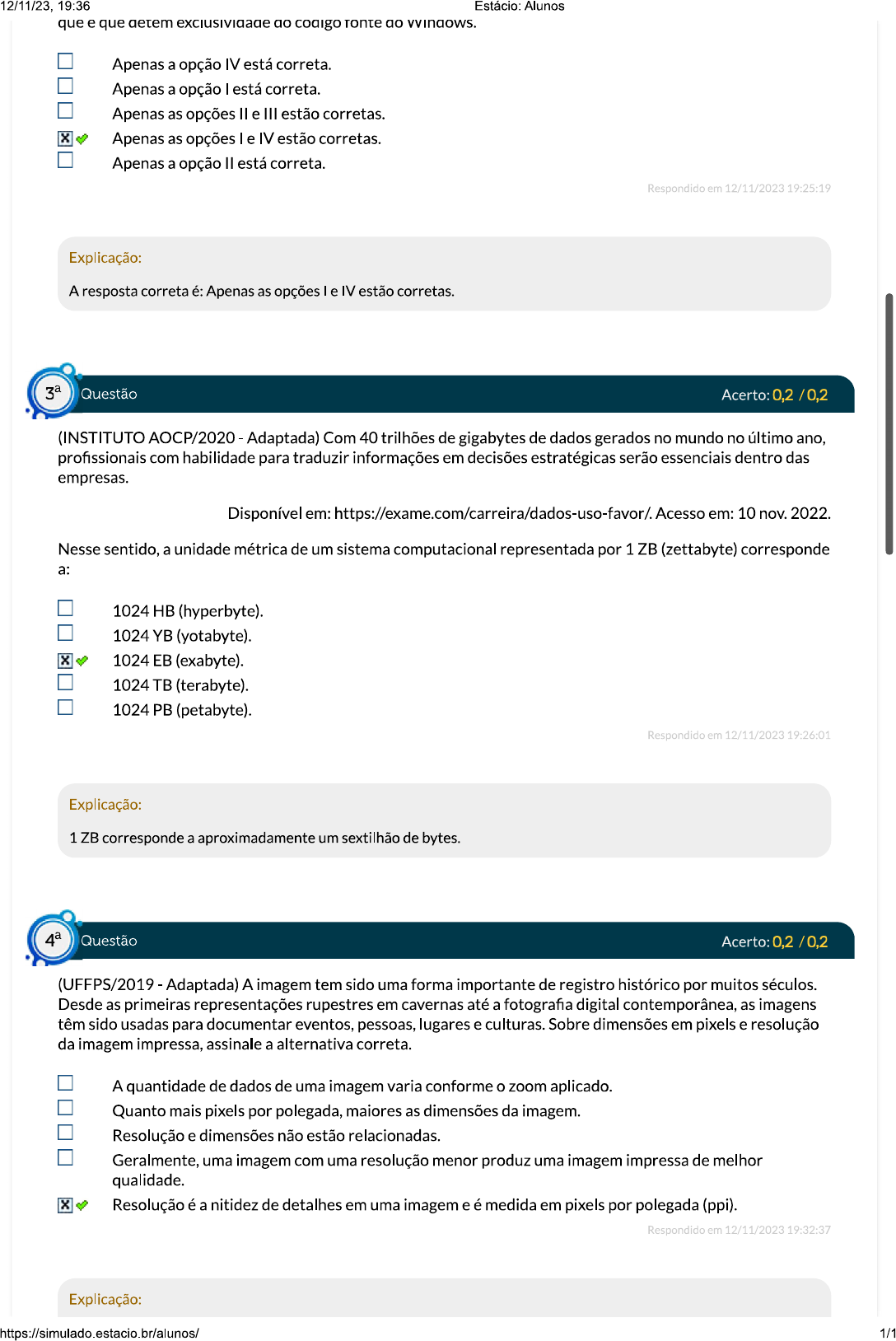 <p>12/11/23, 19:36 Estácio: Alunos que e que coaigo vvingows. Apenas a opção IV está correta. Apenas a opção está correta. Apenas as opções e III estão corretas. Apenas as opções e IV estão corretas. Apenas a opção II está correta. Respondido em 12/11/2023 19:25:19 Explicação: A resposta correta é: Apenas as opções e IV estão corretas. Questão Acerto: 0,2 / 0,2 (INSTITUTO AOCP/2020 - Adaptada) Com 40 trilhões de gigabytes de dados gerados no mundo no último ano, profissionais com habilidade para traduzir informações em decisões estratégicas serão essenciais dentro das empresas. Disponível em: em: 10 nov. 2022. Nesse sentido, a unidade métrica de um sistema computacional representada por 1 ZB (zettabyte) corresponde a: 1024 HB (hyperbyte). 1024 YB (yotabyte). 1024 EB (exabyte). 1024 TB (terabyte). 1024 PB (petabyte). Respondido em 12/11/2023 19:26:01 Explicação: 1 ZB corresponde a aproximadamente um sextilhão de bytes. Questão Acerto: 0,2 / 0,2 (UFFPS/2019 Adaptada) A imagem tem sido uma forma importante de registro histórico por muitos séculos. Desde as primeiras representações rupestres em cavernas até a fotografia digital contemporânea, as imagens têm sido usadas para documentar eventos, pessoas, lugares e culturas. Sobre dimensões em pixels e resolução da imagem impressa, assinale a alternativa correta. A quantidade de dados de uma imagem varia conforme o zoom aplicado. Quanto mais pixels por polegada, maiores as dimensões da imagem. Resolução e dimensões não estão relacionadas. Geralmente, uma imagem com uma resolução menor produz uma imagem impressa de melhor qualidade. Resolução é a nitidez de detalhes em uma imagem e é medida em pixels por polegada (ppi). Respondido em 12/11/2023 19:32:37 Explicação: https://simulado.estacio.br/alunos/ 1/1</p>
