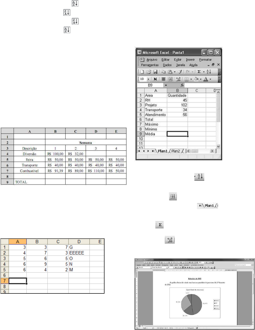 <p>Informática para Concursos – Professor Thiago Waltz</p><p>www.thiagowaltz.com</p><p>Questões Microsoft Excel 2013</p><p>1. 2011.Faperp.Pref. Pontes e Lacerda - MT .MOE.No Microsoft Excel,</p><p>para ordenar datas que estiverem em um intervalo de dados, da mais</p><p>antiga para a mais nova, pode-se utilizar o recurso:</p><p>(A) Classificar, representado pelo botão .</p><p>(B) Filtrar, representado pelo botão .</p><p>(C) Classificar, representado pelo botão .</p><p>(D) Filtrar, representado pelo botão .</p><p>2. 2011.Faperp.Pref. Pontes e Lacerda - MT .MOE.Funções são</p><p>fórmulas predefinidas que efetuam cálculos usando valores específicos,</p><p>denominados argumentos, em uma determinada ordem ou estrutura.</p><p>No Excel, as funções são organizadas por tipos. A função SE é do tipo:</p><p>(A) financeira.</p><p>(B) lógica.</p><p>(C) matemática e trigonometria.</p><p>(D) engenharia.</p><p>3. 2011.Faperp.Pref. Pontes e Lacerda - MT .MOE.O produto Excel do</p><p>pacote Office da Microsoft é destinado à:</p><p>(A) exibição de arquivos de filmes em formato MPEG e MP4.</p><p>(B) elaboração de planilhas de cálculos.</p><p>(C) editoração de texto.</p><p>(D) exibição de músicas.</p><p>4. 2012.UPENET.JUCEPE - adaptada.MOE.Considere o seguinte</p><p>trecho de uma planilha no Excel:</p><p>Se usarmos a fórmula (SOMA(B4:B8)) na célula B9 e, usando o mouse,</p><p>propagarmos a fórmula dessa célula até a célula E9, para, em seguida,</p><p>usarmos os comandos Ctrl + X na célula B9 e Ctrl + V na célula C9, quais</p><p>serão os valores resultantes nas células B9 a E9, respectivamente?</p><p>a) Vazia; R$ 281,39; R$ 200,00; R$ 140,00</p><p>b) R$ 0,00; R$ 211,00; R$ 200,00; R$ 140,00</p><p>c) R$ 211,39; R$ 281,39; R$ 200,00; R$ 140,00</p><p>d) R$ 0,00; R$ 281,39; R$ 200,00; R$ 140,00</p><p>e) Vazia; R$ 211,00; R$ 200,00; R$ 140,00</p><p>Com base na imagem acima, calcule o resultado dos itens abaixo,</p><p>considerando que as expressões indicadas em cada item foram</p><p>inseridas em uma célula vazia do Microsoft Excel.</p><p>5. 2014.TWA.TWA.MOE.=B2*C3</p><p>6. 2014.TWA.TWA.MOE.=B2+C3</p><p>7. 2014.TWA.TWA.MOE.B4/C2</p><p>8. 2014.TWA.TWA.MOE.=A5/C2</p><p>9. 2014.TWA.TWA.MOE.=B1+B2*B3-B4</p><p>10. 2014.TWA.TWA.MOE.=C4+C2^B1</p><p>11. 2014.TWA.TWA.MOE.=B5^A1*C2</p><p>12. 2014.TWA.TWA.MOE.=D1+D3</p><p>13. 2014.TWA.TWA.MOE.=D5&D2&D4&D1&D3</p><p>14. 2014.TWA.TWA.MOE.=SOMA(A1:A5)</p><p>15. 2014.TWA.TWA.MOE.=SOMA(A1;A5)</p><p>16. 2013.Cespe.CNJ.MOE.Para ordenar, por data, os registros</p><p>inseridos na planilha, é suficiente selecionar a coluna data de entrada,</p><p>clicar no menu Dados e, na lista disponibilizada, clicar ordenar data.</p><p>17. 2013.Cespe.SEGER-ES.MOE.</p><p>Considerando a figura acima, que apresenta uma planilha em processo</p><p>de edição no Excel, assinale a opção correta.</p><p>a) Ao se clicar na ferramenta , os dados serão organizados</p><p>automaticamente em ordem alfabética.</p><p>b) Para centralizar os textos das células A1 e B1, é suficiente selecioná-</p><p>los e clicar o ícone .</p><p>c) Após dar duplo clique no ícone , será apresentada uma</p><p>janela que permite salvar a planilha.</p><p>d) Para calcular Máximo, o procedimento correto é clicar a célula B7 e a</p><p>ferramenta .</p><p>e) Selecionando-se as células de B2 a B5 e pressionando-se, em</p><p>seguida, o botão , serão acrescentados, à direita das quantidades,</p><p>uma vírgula e o algarismo zero.</p><p>18. 2013.Cespe.TRT 10ª Região (DF e TO).MOE.</p><p>O gráfico apresentado pode ter sido criado com ferramentas próprias do</p><p>Excel e transferido em seguida para Word.</p><p>Informática para Concursos – Professor Thiago Waltz</p><p>www.thiagowaltz.com</p><p>19. 2013.FMP-RS.MPE-AC.MOE.Considere a planilha MS-Excel</p><p>abaixo.</p><p>Para obter o percentual da população de cada município em relação ao</p><p>total do estado (coluna C), conforme mostrado acima se deve digitar uma</p><p>fórmula em C2 e depois copiá-la e colá-la para as células C3 até C13. A</p><p>fórmula a ser digitada em C2 é</p><p>a) =B2/B14 e depois formatar a coluna C para Número com 2 casas</p><p>decimais.</p><p>b) =B2/B$14 e depois formatar a coluna C para Número com 2 casas</p><p>decimais.</p><p>c) =B2/B14 e depois formatar a coluna C para Porcentual com 2 casas</p><p>decimais.</p><p>d) =B2/B$14 e depois formatar a coluna C para Porcentual com 2 casas</p><p>decimais.</p><p>e) =B2/B$14*100 e depois formatar a coluna C para Porcentual com 2</p><p>casas decimais.</p><p>20. 2013.FCC.PGE-BA.MOE.</p><p>Ao fazer uma típica tarefa conforme conhecimento exigido no item IV,</p><p>um funcionário colocou os seguintes valores nas células:</p><p>A fórmula colocada em D1 foi arrastada pela alça de preenchimento para</p><p>a célula D2.</p><p>Após o cálculo feito pelo Excel, o resultado numérico observado nas</p><p>células D1 e D2 foi, respectivamente,</p><p>a) 1386 e 598.</p><p>b) 1386 e 444.</p><p>c) 621 e 444.</p><p>d) 621 e 598.</p><p>e) 598 e 444.</p><p>21. 2013.UFBA.UFBA.MOE.Considere que haja números</p><p>armazenados nas células A1, A2, A3 e A4 de uma planilha Excel, versão</p><p>em português. Para armazenar a soma desses valores na célula A5,</p><p>pode-se escrever, nessa célula, a expressão “=SOMA(A1:A4)” (sem as</p><p>aspas).</p><p>22. 2013.UFBA.UFBA.MOE.Considere que, em uma planilha Excel,</p><p>haja números nas células A1, A2, B1 e B2 e a expressão “=A1+A2” (sem</p><p>as aspas) na célula A3.</p><p>Se um usuário, utilizando o Excel sobre um sistema Windows, usar a</p><p>combinação de teclas Ctrl+C na célula A3 e a combinação de teclas</p><p>Ctrl+V na célula B3, essa última conterá também a soma de A1 e A2.</p><p>23. 2013.CESPE.MPU.MOE.No Microsoft Excel, a função pode</p><p>avaliar uma condição e retornar um valor, se a condição for verdadeira,</p><p>ou retornar outro valor, se a condição for falsa</p><p>24. 2014.FGV.DPE-R