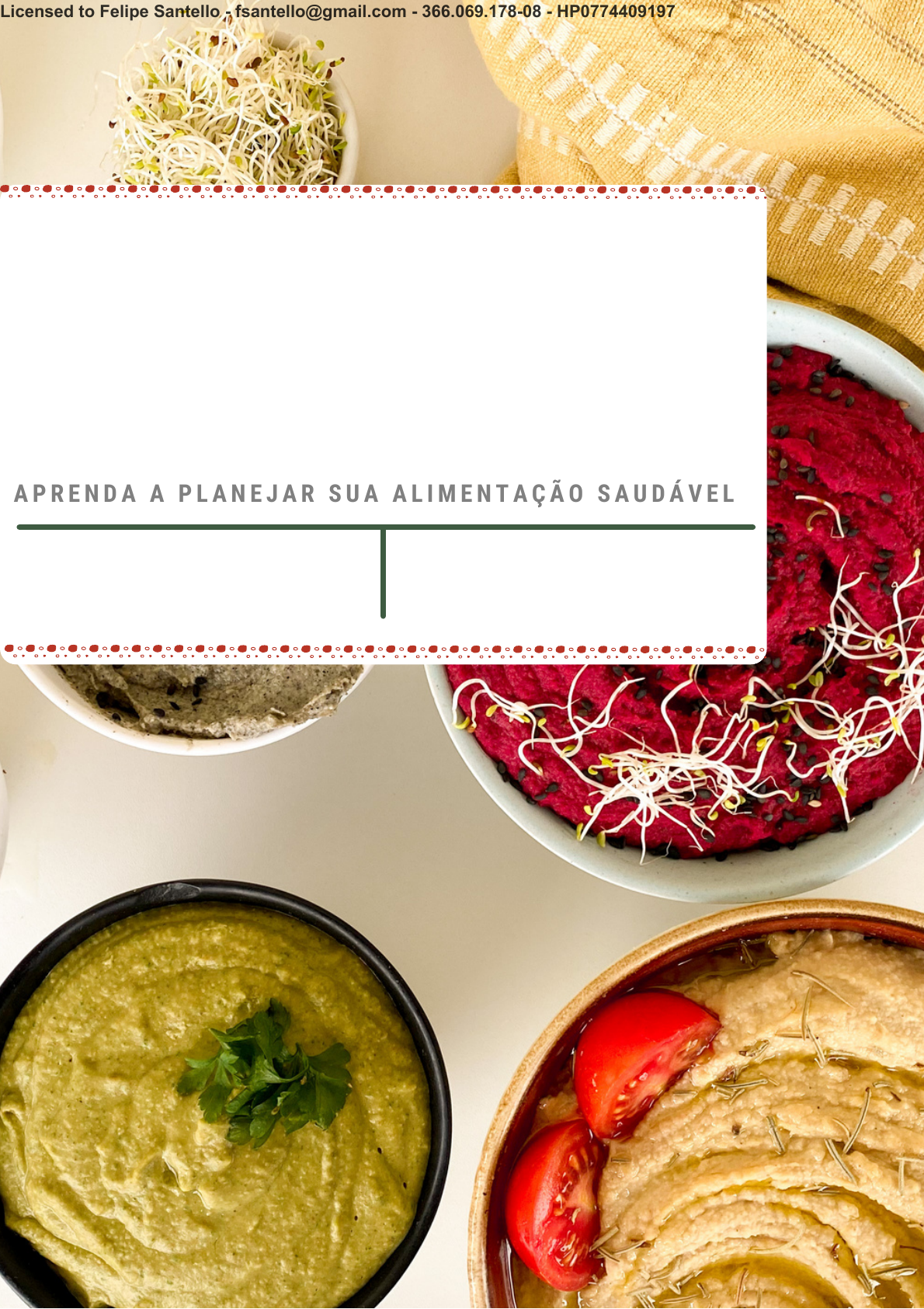 <p>A P R E N D A A P L A N E J A R S U A A L I M E N T A Ç Ã O S A U D Á V E L</p><p>Cardápios saudáveis</p><p>M A R I A N A T A L I T A</p><p>Para a semana</p><p>5 cardápios semanais</p><p>com mais de 60 receitas saudáveis</p><p>Guias práticos para</p><p>variar e substituir ingredientes</p><p>Licensed to Felipe Santello - fsantello@gmail.com - 366.069.178-08 - HP0774409197</p><p>Como usar os cardápios deste livro</p><p>Cardápio 1: Saboroso</p><p>Cardápio 2: Um toque aquecido</p><p>Cardápio 3: Fresco, frescor</p><p>Cardápio 4: Menu requinte</p><p>Cardápio 5 : Cardápio low carb</p><p>Layout de cardápio semanal para impressão</p><p>Layout de lista de compras</p><p>Índice</p><p>Introdução</p><p>Bons motivos para planejar a sua alimentação</p><p>Guia passo a passo para organizar sua alimentação</p><p>Como tornar o processo sustentável</p><p>Cozinha saudável: Guia de equipamentos e utensílios</p><p>Itens de uma despensa estratégica</p><p>Guia de conservação de alimentos e praticidade</p><p>Conteúdo</p><p>Cardápios</p><p>5</p><p>7</p><p>8</p><p>16</p><p>18</p><p>23</p><p>24</p><p>28</p><p>29</p><p>47</p><p>62</p><p>78</p><p>93</p><p>Extra</p><p>110</p><p>111</p><p>Índice esperto:</p><p>clique e vá para</p><p>a página</p><p>Licensed to Felipe Santello - fsantello@gmail.com - 366.069.178-08 - HP0774409197</p><p>Granola caseira</p><p>Iogurte natural caseiro</p><p>Iogurte com toppings</p><p>Geleia de morango</p><p>Pão de amêndoas</p><p>Mingau de maçã com especiarias</p><p>Toast multigrãos com queijo</p><p>Toast de ovos mexidos com espinafre</p><p>Cabinhos de espinafre com ovos</p><p>Panqueca verde</p><p>Smothie vibrante de beterraba</p><p>Smothie de cacau</p><p>Smoothie de frutas vermelhas</p><p>Smoothie tropical de laranja</p><p>Smoothie proteico</p><p>Suco verde clássico</p><p>Panqueca de banana</p><p>Bolo de banana com castanhas</p><p>Brownie saudável fácil</p><p>Brigadeiro de avocado</p><p>Barrinha de tâmara</p><p>Salada de cenoura com abobrinha</p><p>Salada mediterrânea de grão de bico</p><p>Salada de camarão com abacate</p><p>Saladinha de vagem com cenoura</p><p>Salada de quiabo com tomate</p><p>Salada de repolho cremoso (coleslaw)</p><p>Salada de vagem com shoyo e gengibre</p><p>Feijão tropeiro sem farinha</p><p>Quinoa com vegetais</p><p>Couve flor assada com mel e açafrão</p><p>Índice de receitas</p><p>32</p><p>33</p><p>34</p><p>67</p><p>80</p><p>49</p><p>50</p><p>51</p><p>95</p><p>97</p><p>35</p><p>64</p><p>65</p><p>66</p><p>83</p><p>96</p><p>82</p><p>52</p><p>61</p><p>46</p><p>77</p><p>Clique na receita</p><p>para ir direto</p><p>para a página</p><p>Lanches</p><p>Saladas</p><p>102</p><p>70</p><p>103</p><p>104</p><p>74</p><p>88</p><p>91</p><p>107</p><p>86</p><p>39</p><p>Licensed to Felipe Santello - fsantello@gmail.com - 366.069.178-08 - HP0774409197</p><p>Abobrinha refogada com alecrim</p><p>Ratatouille clássico</p><p>Arroz de couve flor com amêndoas</p><p>Abóbora cabotiá assada com especiarias</p><p>Fettutine de abobrinha</p><p>Arroz vermelho</p><p>Refogado de abobrinha e berinjela</p><p>Brócolis assado com manteiga</p><p>Berinjela assada</p><p>Grão de bico crocante</p><p>Espaguete de pupunha com camarão</p><p>Wrap de couve</p><p>Frango cremoso na concha de abóbora</p><p>Lasanha de berinjela à bolonhesa</p><p>Abobrinha à bolonhesa</p><p>Sopa de abóbora cremosa</p><p>Pimentões recheados</p><p>Almôndegas de berinjela</p><p>Pizzolete</p><p>Pizza de massa de couve flor</p><p>Molho bolonhesa prático</p><p>Patê de ricota com azeitona</p><p>Patê de ricota com cenoura</p><p>Molho pesto com tomate seco</p><p>Homus de grão de bico</p><p>Molhos e pastinhas</p><p>53</p><p>81</p><p>81</p><p>36</p><p>69</p><p>98</p><p>38</p><p>42</p><p>43</p><p>89</p><p>44</p><p>84</p><p>101</p><p>87</p><p>90</p><p>72</p><p>73</p><p>105</p><p>58</p><p>Torta de alho poró e abobrinha</p><p>Peito de frango na panela de pressão (desfiado)</p><p>Marinada de limão e alecrim</p><p>Marinada vermelha de frango</p><p>Marinada de mostarda com iogurte</p><p>Ovo cozido perfeito</p><p>Carne assada de panela</p><p>Atum com crosta de gergelim</p><p>Fajitas de frango</p><p>Frango recheado</p><p>Sobrecoxa assada com páprica</p><p>Salmão com molho de mostarda e ervas</p><p>Carne moída com legumes</p><p>Almôndegas de carne</p><p>Pratos únicos com vegetais</p><p>Acompanhamentos</p><p>Proteínas</p><p>106</p><p>99</p><p>100</p><p>40</p><p>41</p><p>37</p><p>57</p><p>85</p><p>75</p><p>68</p><p>108</p><p>45</p><p>55</p><p>56</p><p>54</p><p>59</p><p>91</p><p>71</p><p>76</p><p>60</p><p>Licensed to Felipe Santello - fsantello@gmail.com - 366.069.178-08 - HP0774409197</p><p>5</p><p>Imagine a cena: Você chega cansado do</p><p>trabalho, abre a porta de casa, vai para a</p><p>cozinha e em cima da mesa encontra um</p><p>prato com alguns biscoitos. Você pega</p><p>alguns e começa a comer, mesmo sem ter</p><p>pensado nisso antes ou sem</p><p>necessariamente estar com fome.</p><p>Isso acontece porque andamos desatentos e</p><p>por isso, nosso comportamento é altamente</p><p>influenciado pelo ambiente que nos rodeia e</p><p>pelos sinais visuais que estão na nossa</p><p>frente.</p><p>Os ambientes que nos rodeiam são</p><p>como uma mão invisível que moldam</p><p>os nossos comportamentos e nossos</p><p>hábitos.</p><p>A importância de se criar ambientes organizados</p><p>Se pararmos para refletir sobre a nossa</p><p>alimentação, veremos que muitas vezes</p><p>consumimos alimentos não pelo que eles são,</p><p>mas por causa da sua disponibilidade. Se o</p><p>que estiver disponível for biscoitos, tendemos</p><p>a comer os biscoitos.</p><p>E assim, os ambientes que nos rodeiam são</p><p>como uma “mão invisível” que moldam os</p><p>nossos comportamentos e nossos hábitos.</p><p>O problema é que o ambiente que vivemos, o</p><p>local onde trabalhamos e até o</p><p>comportamento que assistimos das pessoas</p><p>que nos rodeiam muitas vezes não favorecem</p><p>a pr