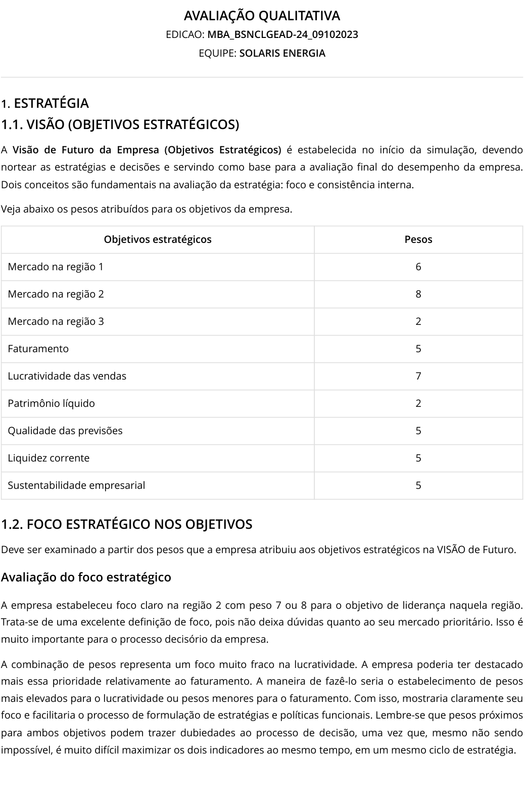 <p>10/11/23, 10:37 SDE_LDP - Qualitativa</p><p>https://sde.ldp.com.br/avaliacao/qualitativaImpressao?tokenCache=1699623412064 1/11</p><p>AVALIAÇÃO QUALITATIVA</p><p>EDICAO: MBA_BSNCLGEAD-24_09102023</p><p>EQUIPE: SOLARIS ENERGIA</p><p>1. ESTRATÉGIA</p><p>1.1. VISÃO (OBJETIVOS ESTRATÉGICOS)</p><p>A Visão de Futuro da Empresa (Objetivos Estratégicos) é estabelecida no início da simulação, devendo</p><p>nortear as estratégias e decisões e servindo como base para a avaliação final do desempenho da empresa.</p><p>Dois conceitos são fundamentais na avaliação da estratégia: foco e consistência interna.</p><p>Veja abaixo os pesos atribuídos para os objetivos da empresa.</p><p>Objetivos estratégicos Pesos</p><p>Mercado na região 1 6</p><p>Mercado na região 2 8</p><p>Mercado na região 3 2</p><p>Faturamento 5</p><p>Lucratividade das vendas 7</p><p>Patrimônio líquido 2</p><p>Qualidade das previsões 5</p><p>Liquidez corrente 5</p><p>Sustentabilidade empresarial 5</p><p>1.2. FOCO ESTRATÉGICO NOS OBJETIVOS</p><p>Deve ser examinado a partir dos pesos que a empresa atribuiu aos objetivos estratégicos na VISÃO de Futuro.</p><p>Avaliação do foco estratégico</p><p>A empresa estabeleceu foco claro na região 2 com peso 7 ou 8 para o objetivo de liderança naquela região.</p><p>Trata-se de uma excelente definição de foco, pois não deixa dúvidas quanto ao seu mercado prioritário. Isso é</p><p>muito importante para o processo decisório da empresa.</p><p>A combinação de pesos representa um foco muito fraco na lucratividade. A empresa poderia ter destacado</p><p>mais essa prioridade relativamente ao faturamento. A maneira de fazê-lo seria o estabelecimento de pesos</p><p>mais elevados para o lucratividade ou pesos menores para o faturamento. Com isso, mostraria claramente seu</p><p>foco e facilitaria o processo de formulação de estratégias e políticas funcionais. Lembre-se que pesos próximos</p><p>para ambos objetivos podem trazer dubiedades ao processo de decisão, uma vez que, mesmo não sendo</p><p>impossível, é muito difícil maximizar os dois indicadores ao mesmo tempo, em um mesmo ciclo de estratégia.</p><p>10/11/23, 10:37 SDE_LDP - Qualitativa</p><p>https://sde.ldp.com.br/avaliacao/qualitativaImpressao?tokenCache=1699623412064 2/11</p><p>Discussão conceitual</p><p>Na hora da formulação da estratégica, definir o foco é fundamental para orientar o desdobramento das</p><p>políticas e estratégias funcionais. Em nossa simulação estabelecer foco significava atribuir pesos distintos</p><p>entre os objetivos de mercado e entre os objetivos econômico-financeiros, atribuindo peso maior aos objetivos</p><p>prioritários em cada grupo.</p><p>Porque é fundamental estabelecer foco? Veja que foco em objetivo prioritário não significa que você irá</p><p>desprezar os demais objetivos. Significa sim, que ao definir um foco e comunicar isso claramente a todos os</p><p>que decidem na empresa, você estará facilitando e orientando o processo decisório. Um foco de mercado</p><p>representa eleger um mercado em relação ao qual a empresa deseja estabelecer uma relação duradoura e de</p><p>longo prazo. Significa que quando, eventualmente, surgir qualquer crise que reduza a capacidade de produção</p><p>e vendas, a empresa tem claro qual mercado preservar. Significa também que a empresa sabe exatamente o</p><p>que pretende e quais estratégias e políticas irão favorecer tal perspectiva. Muita gente decide nas empresas e</p><p>se não houver foco estratégico o processo de decisão pode se tornar dúbio e dificultar o atingimento dos</p><p>objetivos.</p><p>Do ponto de vista econômico e financeiro o foco também é fundamental. Observe que a rentabilidade, ou</p><p>crescimento do Patrimônio Líquido, embora seja um objetivo principal do administrador, ou seja, ampliar a</p><p>riqueza do acionista, do ponto de vista estratégico é muito mais uma consequência de outros vetores de</p><p>desempenho. A clássica formula DuPont que desdobrou a rentabilidade na multiplicação da margem de lucro</p><p>e pelo giro dos ativos, revela os dois vetores que constroem a rentabilidade e que se constituem em objetivos</p><p>estratégicos mais operacionalizáveis. Portanto, estabelecer foco em um dos vetores, isto é, lucratividade ou</p><p>faturamento significa escolher o objetivo prioritário em um determinado ciclo de estratégia. Porque não</p><p>escolher os dois e dispensar o foco? Ocorre que nem sempre é possível ter sucesso nos dois objetivos</p><p>simultaneamente. As vezes é muito difícil, principalmente em setores muito competitivos. As vezes, as políticas</p><p>que favorecem o faturamento, como preço agressivo, por exemplo, dificultam a lucratividade. Além disso, o</p><p>foco econômico também depende da natureza do negócio. Em alguns negócios que possuem características</p><p>de commodities é muito razoável que se construa a rentabilidade em cima do giro, uma vez que o preço é</p><p>dado pelo mercado e os processos são bastante padronizados. Em outros negócios que trabalham com nichos</p><p>de mercado de segmentos sofisticados com produtos de alto valor agregado é mais fácil construir a</p><p>rentabilidade através da lucratividade. De qualquer maneira, é indispensável que se defina um foco</p><p>econômico-financeiro.</p><p>1.3. CONSISTÊNCIA INTERNA ENTRE OS OBJETIVOS</p><p>Pode ser verificada quando as prioridades aos objetivos estabelecidos na VISÃO, nas dimensões de mercado e</p><p>econômica, são consistentes entre si e possibilitam políticas e estratégias com efeito sinérgico.</p><p>Avaliação da consistência</p><p>Definição estratégica consistente. Considerada isoladamente, a busca da liderança numa região média de</p><p>mercado, a região 2, poderia estar associada tanto à ao faturamento como a lucratividade. Como a empresa</p><p>estabeleceu peso importante também na região 1, que é relativamente pequena, sua es