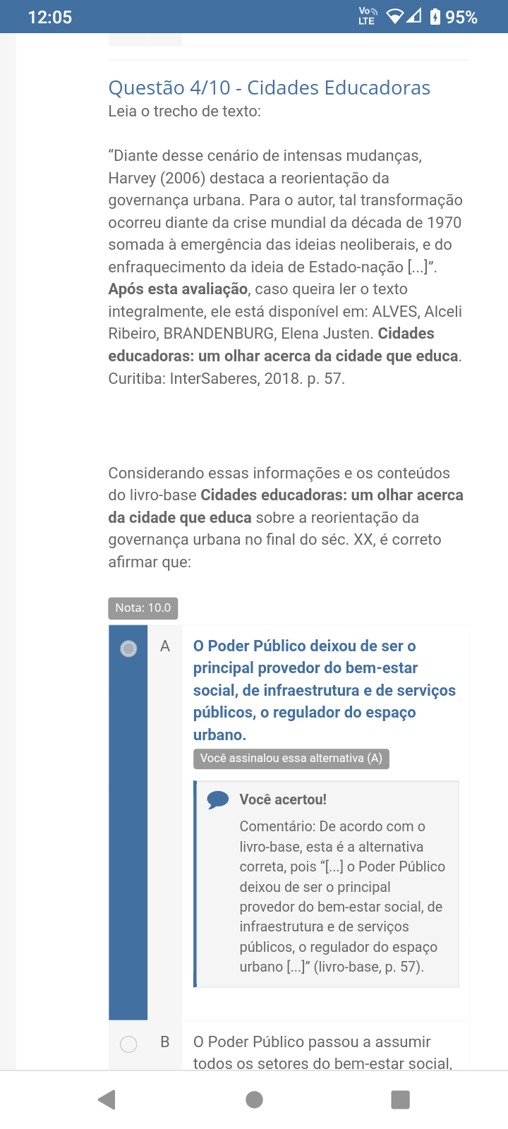 <p>12:05 LTE Questão 4/10 - Cidades Educadoras o trecho de texto: "Diante desse cenário de intensas mudanças, Harvey (2006) destaca a reorientação da governança urbana. Para o autor, tal transformação ocorreu diante da crise mundial da década de 1970 somada à emergência das ideias neoliberais, e do enfraquecimento da ideia de Estado-nação [...]". Após esta avaliação, caso queira ler o texto integralmente, ele está disponível em: ALVES, Alceli Ribeiro, BRANDENBURG, Elena Justen. Cidades educadoras: um olhar acerca da cidade que educa. Curitiba: InterSaberes, 2018. p. 57. Considerando essas informações e os conteúdos do livro-base Cidades educadoras: um olhar acerca da cidade que educa sobre a reorientação da governança urbana no final do séc. XX, é correto afirmar que: Nota: 10.0 A o Poder Público deixou de ser o principal provedor do bem-estar social, de infraestrutura e de serviços públicos, o regulador do espaço urbano. Você assinalou essa alternativa (A) Você acertou! Comentário: De acordo com o livro-base, esta é a alternativa correta, pois "[...] o Poder Público deixou de ser o principal provedor do bem-estar social, de infraestrutura e de serviços públicos, o regulador do espaço urbano [...]" (livro-base, p. 57). B o Poder Público passou a assumir todos os setores do bem-estar</p>