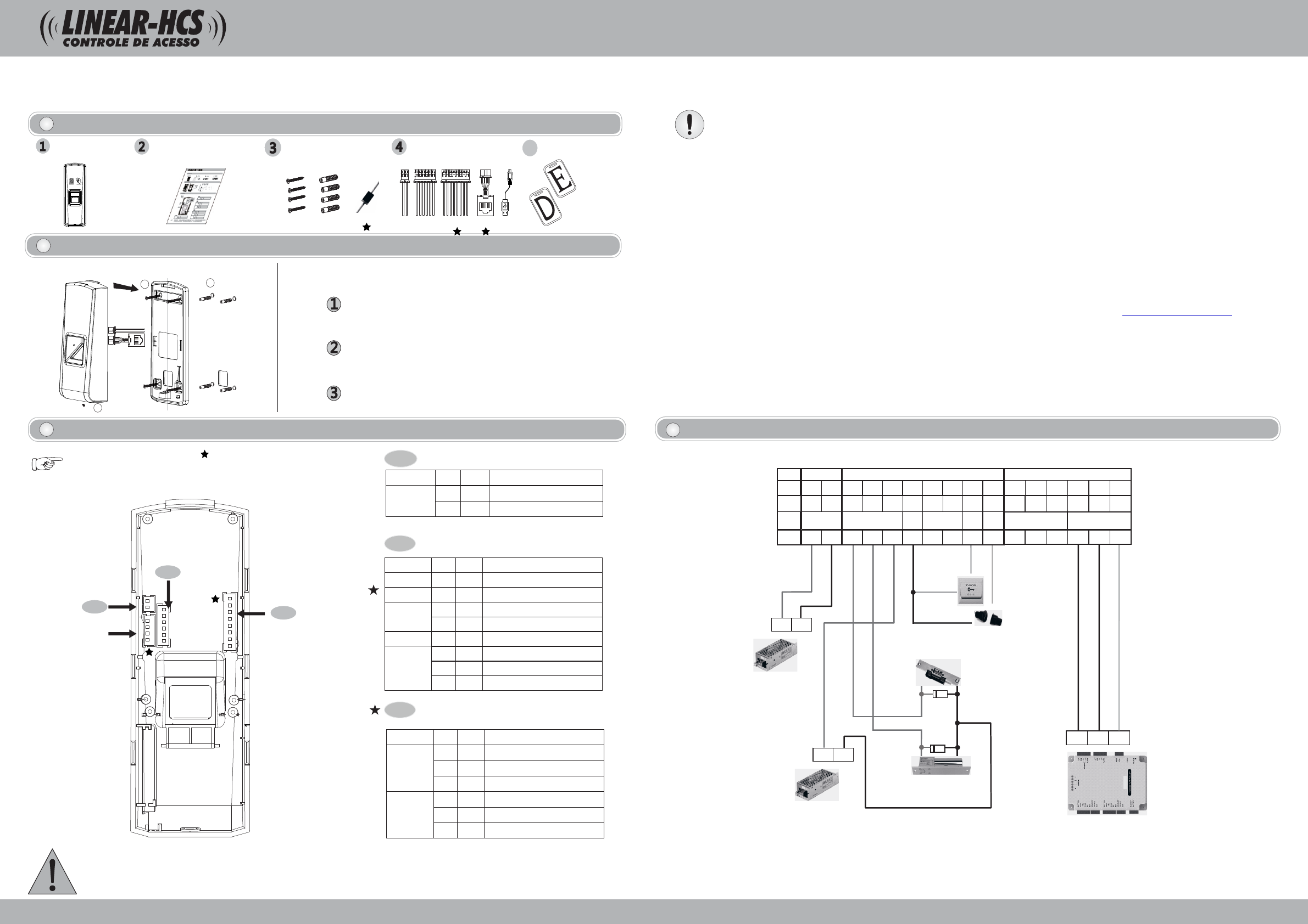 <p>GND D1 D0</p><p>Conexões</p><p>Diagrama de instalação</p><p>Controladora Guia de Instruções Kit de Acessórios</p><p>Conteúdo da Embalagem</p><p>Conectores</p><p>Controladora Digital de Acesso e Interruptor de Alimentação, Alimentação e Leitor de Controle de Acesso</p><p>V3.13</p><p>12</p><p>3</p><p>As interfaces marcadas com são para modelos específicos,</p><p>Por favor, consulte o guia de instalação do equipamento utilizado.</p><p>P1 P2 P3 RJ45 USB</p><p>P1</p><p>P3</p><p>P2</p><p>RJ45(TCP/IP)</p><p>Função PINO Cor Descrição</p><p>1</p><p>2</p><p>12VDC</p><p>Alimentação</p><p>Vermelho</p><p>Preto GND</p><p>P1</p><p>Função PINO Cor Descrição</p><p>Saída</p><p>Wiegand</p><p>RS485</p><p>1</p><p>2</p><p>3</p><p>4</p><p>5</p><p>6</p><p>Branco</p><p>Preto</p><p>Amarelo</p><p>Roxo</p><p>Preto</p><p>DATA1 Saída Wiegand</p><p>DATA0 Saída Wiegand</p><p>GND</p><p>GND</p><p>RS485A</p><p>RS485B</p><p>Verde</p><p>P2</p><p>Função PINO Cor Descrição</p><p>1</p><p>2</p><p>3</p><p>4</p><p>5</p><p>6</p><p>Entrada de DisparoSensor Porta</p><p>Botoeira de Saída</p><p>Roxo</p><p>Amarelo</p><p>Branco</p><p>Branco</p><p>Preto</p><p>Verde</p><p>Laranja</p><p>Azul</p><p>7</p><p>8</p><p>Entrada de Disparo</p><p>Relé</p><p>GND</p><p>COM</p><p>NF</p><p>NA</p><p>GND</p><p>P3</p><p>Antes de energizar os equipamentos, verifique atentamente o esquema de ligação. Qualquer produto danificado devido a</p><p>erros na ligação não serão cobertos pela garantia do produto. Este equipamento é montado em modelo O&M</p><p>(fabricação sob solicitação) em fornecedor internacional com customização especial de firmware para a Linear-HCS.</p><p>Todos os direitos de marcas registrados pela Linear-HCS, assim como as responsabilidades de aplicação, suporte e manutenção.</p><p>6 5 4 3 2 1</p><p>GND GND D1 D0</p><p>Saída Wiegand</p><p>P3</p><p>RS485B RS485A</p><p>RS485</p><p>1</p><p>2</p><p>3 4</p><p>Controladora Digital de Acesso LN5-P</p><p>30/01/2017</p><p>Conector P3</p><p>Conector P3</p><p>Sensor de Porta</p><p>Fech. Elétrica</p><p>(Energiza para</p><p>desbloquear)</p><p>+12V GND</p><p>+</p><p>+</p><p>+</p><p>Porta</p><p>Pino 1 2 8 7 6 5 4 3 2 1</p><p>Função GND</p><p>Conector +12V GND NA NF COM ABRE</p><p>Entrada de</p><p>Alimentação Controlador de Saída</p><p>P1 P2</p><p>Bot.</p><p>de</p><p>Saída</p><p>Sens.</p><p>de</p><p>Porta</p><p>GND PORTA</p><p>Fech. Magnética</p><p>(Desenergiza para</p><p>desbloquear)</p><p>Fonte de Alimentação</p><p>da controladora</p><p>+12V GND</p><p>ou</p><p>Fonte de Alimentação</p><p>das fechaduras</p><p>Diodo</p><p>Diodo</p><p>Passos de Instalação</p><p>1</p><p>2</p><p>3</p><p>F u r e a p a r e d e s e g u i n d o a s</p><p>posições dos furos do painel traseiro.</p><p>Instale e fixe o painel traseiro, conecte</p><p>os cabos relacionados.</p><p>Fixe a controladora de acesso.</p><p>A utilização de equipamentos com reconhecimento biométrico é contraindicado para acesso a portões de garagem com</p><p>entrada de veículos.Para mais informações leia o “Termo de uso de Biometrias” disponível em www.linear-hcs.com.br</p><p>IMPORTANTE</p><p>Atenção!</p><p>NÃO INSTALE este equipamento exposto ao tempo. Recomendamos que se utilize PROTEÇÃO</p><p>total contra sol e chuva em toda e qualquer instalação deste equipamento. O contato com água</p><p>danificará os sensores biométricos, podendo apresentar funcionamento impreciso, erro na leitura</p><p>ou mesmo tentativa de reconhecimento de digital sem que haja alguém utilizando o equipamento.</p><p>A luz solar também danificará o sensor, pois o mesmo não é munido de proteção eletrônica ou</p><p>mecânica contra o forte calor e incidência de luz solar direta.</p><p>Controle de Acesso</p><p>Controladora Digital de Acesso LN5-P</p><p>- 3000 impressões digitais e 50000 registros;</p><p>- RS485, Saída Wiegand66, saída de contato seco, interface de rede TCP / IP.</p><p>Cor VEBOPOAORO POROAOBOBOPOVELAALPOVO</p><p>Cartões RFID</p><p>Enroll Card</p><p>Delete Card</p><p>5</p><p>http://www.linear-hcs.com.br</p><p>Ligação</p><p>Cadastramento de Usuário:</p><p>Furação do parafuso</p><p>Conexão mini usb</p><p>Botão Reset</p><p>Ao alimentar o dispositivo com 12VDC, o LED azul do sensor de impressão digital pisca rapidamente e emite alertas sonoros.</p><p>Acompanham 2 cartões na embalagem: Cadastrar Deletar Usuário (não incluso)</p><p>Embaixo:</p><p>Guia de Operação</p><p>Dimensões e características</p><p>Coloque sempre o dedo</p><p>no centro do sensor.</p><p>NÃO coloque o dedo</p><p>afastado do centro da</p><p>área do sensor.</p><p>Modo correto</p><p>Modo Incorreto:</p><p>Exclusão de usuário:</p><p>NÃO deslize o dedo</p><p>durante o processo de</p><p>verificação da impressão digital</p><p>NÃO tire o dedo durante</p><p>o processo de verificação</p><p>da impressão digital.</p><p>NÃO use apenas</p><p>a ponta do dedo.</p><p>Instruções de posicionamento do dedo no sensor.</p><p>NÃO mova o dedo antes</p><p>da luz de fundo do</p><p>sensor desligar.</p><p>LED</p><p>Leitor de cartões:</p><p>passe o cartão sobre</p><p>essa área.</p><p>O status do dispositivo</p><p>possui três cores:</p><p>Vermelho, Azul e Verde.</p><p>Sensor de Impressão</p><p>Digital: coloque o</p><p>dedo nesse local.</p><p>NÃO coloque o</p><p>dedo em ângulo</p><p>37mm</p><p>1</p><p>4</p><p>5</p><p>m</p><p>m</p><p>55mm</p><p>(Posicione seu dedo sobre o sensor de maneira que o dedo cubra toda a superficie do sensor exercendo uma leve pressão para baixo.)</p><p>Certifique-se de cobrir toda</p><p>a superfície do sensor com</p><p>o máximo de seu dedo possível.</p><p>Passe o</p><p>”Enroll Card“</p><p>para iniciar</p><p>Cadastrando Impressão Digital+Cartão (siga conforme a figura1.3)</p><p>Coloque</p><p>o dedo</p><p>Coloque o dedo</p><p>novamente</p><p>Figura 1.3</p><p>Passe o</p><p>cartão do</p><p>usuário</p><p>Passe o</p><p>”Enroll Card“</p><p>para encerrar.</p><p>Continuar c