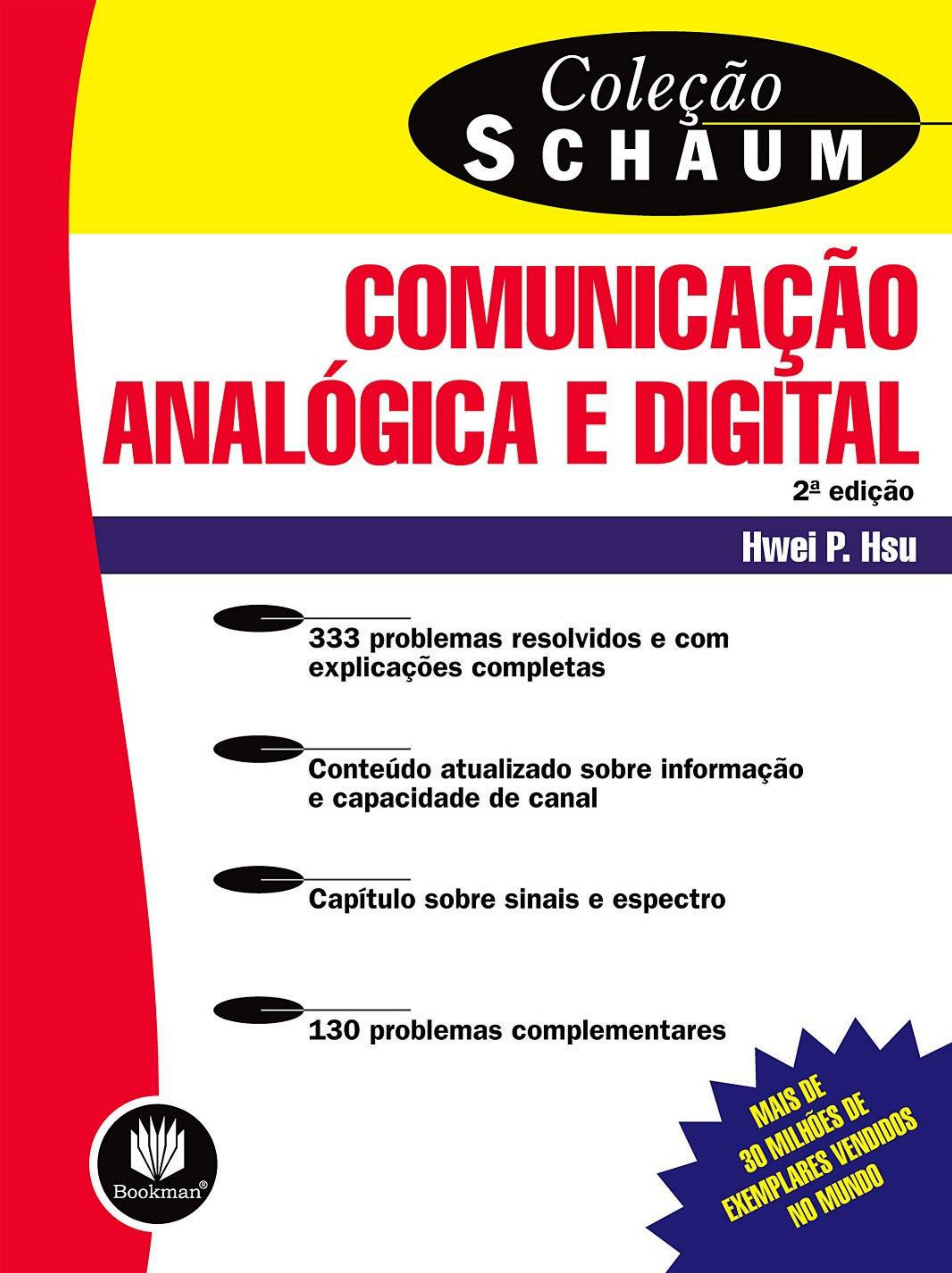 <p>Coleção S CHAUM COMUNICAÇÃO ANALÓGICA E DIGITAL edição Hwei P. Hsu 333 problemas resolvidos e com explicações completas Conteúdo atualizado sobre informação e capacidade de canal Capítulo sobre sinais e espectro 130 problemas complementares ® Bookman</p><p>AUTORIZADA DE H873t Hsu, Hwei P. Teoria e problemas de comunicação analógica e digital / Hwei P. Hsu : tradução Gustavo Guimarães Paiva. - 2. ed. - Porto Alegre : Bookman, 2006. 340 p. : 28 cm. - (Coleção Schaum) ISBN 978-85-363-0665-0 1. Comunicação elétrica - Ruído. 2. Sistema - Comunicação. 3. Sinal - Processamento digital. 4. Transmissão digital. 5. Transmissão analógica. I. CDU 621.391 Catalogação na publicação: Júlia Angst Coelho - CRB 10/1712</p><p>HWEI P. HSU, Ph.D. Professor de Engenharia Elétrica na Farleigh Dickinson University Teoria e Problemas de COMUNICAÇÃO ANALÓGICA E DIGITAL Edição Tradução: Gustavo Guimarães Paiva Doutor em Engenharia Elétrica (CPDEE - UFMG) Professor Adjunto do Departamento de Engenharia Eletrônica da UFMG Consultoria, supervisão e revisão técnica desta edição: Antônio Pertence Júnior Engenheiro Eletrônico e de Telecomunicações Especialista em Processamento de Sinais (Ryerson University - Canadá) Professor de Telecomunicações da FUMEC (MG) Professor Titular da Faculdade de Sabará/MG 2006</p><p>Obra originalmente publicada sob o título Schaum's Outline: Analog and Digital Communications, 2/E Hwei P. Hsu Original edition 2003, The McGraw-Hill Companies, Inc. All rights reserved. ISBN 0-07-140228-4 Capa: Rogério Grilho Preparação de original: Mareci Pedron de Oliveira Supervisão editorial: Denise Weber Nowaczyk Editoração eletrônica: Laser House Hwei P. Hsu recebeu seu B.S. da National Taiwan University e seu M.S. e Ph.D. do Case Institute of Technology. Ele já publicou diversos livros, incluindo Teoria e Problemas de Sinais e Sistemas (Coleção Schaum) e Schaum's Outlines of Probability, Random Variables & Random Processes. Reservados todos os direitos de publicação, em língua portuguesa, à EDITORA S.A. (BOOKMAN® COMPANHIA EDITORA é uma divisão da EDITORA S.A.) Av. Jerônimo de Ornelas, 670 - Santana 90040-340 Porto Alegre RS Fone (51) Fax (51) 3027-7070 É proibida a duplicação ou reprodução deste volume, no todo ou em parte, sob quaisquer formas ou por quaisquer meios (eletrônico, mecânico, gravação, fotocópia, distribuição na Web e sem permissão expressa da Editora. SÃO PAULO Av. Angélica, 1.091 Higienópolis 01227-100 São Paulo SP Fone (11) 3665-1100 Fax (11) 3667-1333 SAC 0800 703-3444 IMPRESSO NO BRASIL PRINTED IN BRAZIL</p><p>Prefácio objetivo deste livro, tal como na edição anterior, é fornecer uma introdução aos princípios básicos em comunica- ção analógica e digital para alunos de graduação avançados em engenharia elétrica ou de computação. Considera- se o conhecimento anterior sobre análise de circuitos, mas uma prévia exposição ao curso de sinais e sistemas tam- bém é útil. O livro pode ser utilizado como um livro-texto e para o estudo individual. Cada capítulo apresenta um tópico com vários problemas resolvidos, os quais constituem uma parte integral do texto. Nesta edição, dois capítulos tratam de ferramentas básicas. Essas ferramentas são, então, aplicadas aos três ca- pítulos seguintes em sistema de comunicação analógica, incluindo a amostragem e transmissão digital de sinais analógicos. Probabilidade, variáveis aleatórias e processos aleatórios são apresentados nos Capítulos 6 e 7 e apli- cados aos capítulos O efeito do ruído em sistemas de comunicação analógica é estudado no Capítu- lo 8. O Capítulo 9 aborda o efeito do ruído na comunicação digital e a recepção ótima. Teoria da informação e co- dificação de fonte são tratados no Capítulo 10. Esta edição contém um capítulo novo, o Capítulo 11, sobre codifi- cação de controle de erro, incluindo códigos lineares de bloco, códigos cíclicos e códigos convolucionais. Montville, New Jersey HWEI P. HSU</p><p>Sumário CAPÍTULO 1 Sinais e Espectro 11 1.1 Introdução 11 1.2 Série de Fourier e Espectro Discreto 11 1.3 Transformada de Fourier e Espectro Contínuo 12 1.4 Propriedades da Transformada de Fourier 13 1.5 Transformadas de Fourier de Sinais de Potência 15 CAPÍTULO 2 Transmissão e Filtragem de Sinais 34 2.1 Introdução 34 2.2 Resposta ao Impulso e Resposta em 34 2.3 Características de Filtragem de Sistemas LIT 36 2.4 Transmissão de Sinais em Sistemas LIT 36 2.5 Filtros 37 2.6 Filtros de Quadratura e Transformada de Hilbert 39 CAPÍTULO 3 Modulação em Amplitude 52 3.1 Introdução 52 3.2 Modulação em Amplitude 52 3.3 Modulação com Faixa Lateral Dupla 53 3.4 Modulação em Amplitude Ordinária 54 3.5 Modulação com Faixa Lateral Única 56 3.6 Modulação de Faixa Lateral Única Vestigial 58 3.7 Translação de e Mixagem 60 3.8 Multiplexação por Divisão de 61 CAPÍTULO 4 Modulação em Ângulo 76 4.1 Introdução 76 4.2 Modulação em Ângulo e Instantânea 76 4.3 Modulação por Fase e 77 4.4 Espectro de Fourier de Sinais Modulados em Ângulo 78 4.5 Modulação em Ângulo em Banda Estreita 78 4.6 Modulação Senoidal (ou por Tom) 79 4.7 Largura de Faixa de Sinais Modulados em Ângulo 80 4.8 Geração de Sinais Modulados em Ângulo 81 4.9 Demodulação de Sinais Modulados em Ângulo 82</p><p>8 SUMÁRIO CAPÍTULO 5 Transmissão Digital de Sinais Analógicos 98 5.1 Introdução 98 5.2 Modulação por Codificação de Pulso 98 5.3 Teorema da Amostragem 99 5.4 Amostragem 99 5.5 Modulação em Amplitude de Pulso 101 5.6 Quantização 101 5.7 Codificação 104 5.8 Requisito de Largura de Faixa do PCM 104 5.9 Modulação Delta 105 5.10 Formato de Sinalização 107 5.11 Multiplexação por Divisão no Tempo 108 5.12 Requisitos de Largura de Faixa para TDM 109 5.13 Formatação do Pulso e Interferência entre Símbolos 109 5.14 Sistemas de Modulação Digital de 