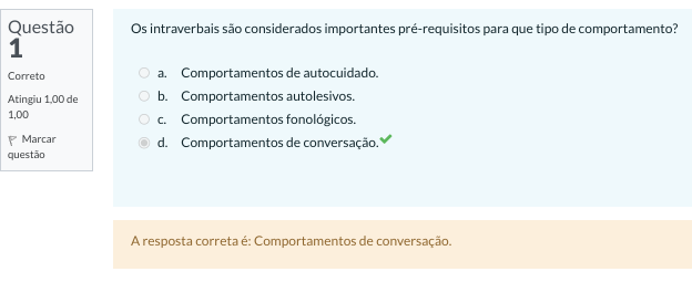 <p>Questão Os intraverbais são considerados importantes pré-requisitos para que tipo de comportamento? 1 Correto a. Comportamentos de autocuidado. Atingiu 1,00 de b. Comportamentos 1,00 C. Comportamentos fonológicos. Marcar d. Comportamentos de conversação. questão A resposta correta é: Comportamentos de conversação.</p>